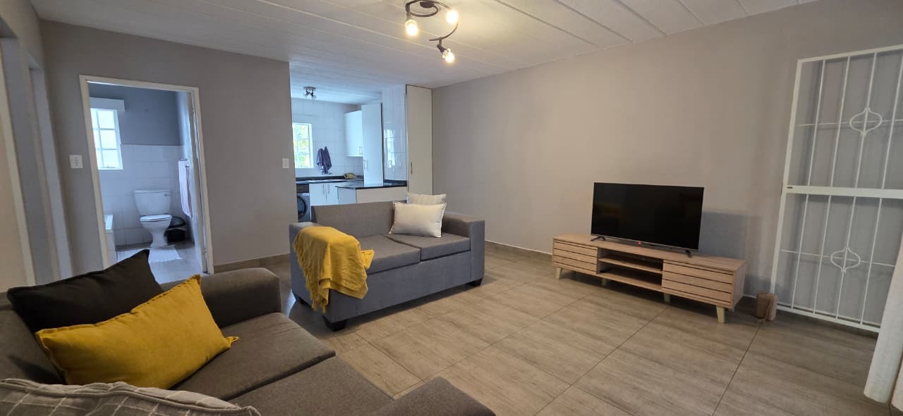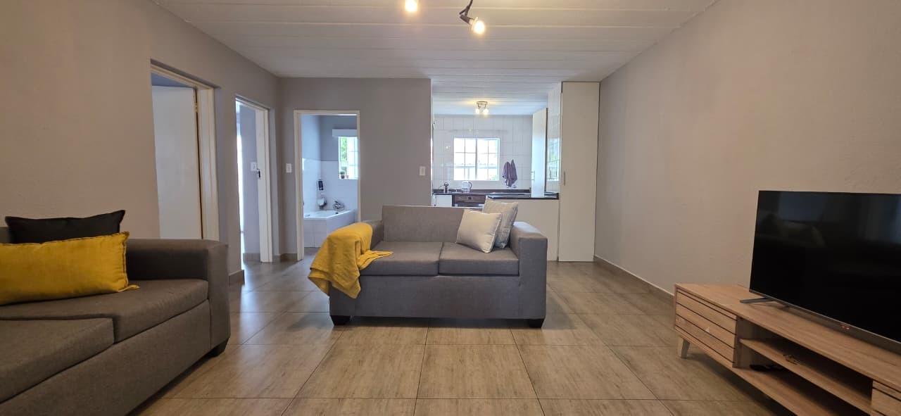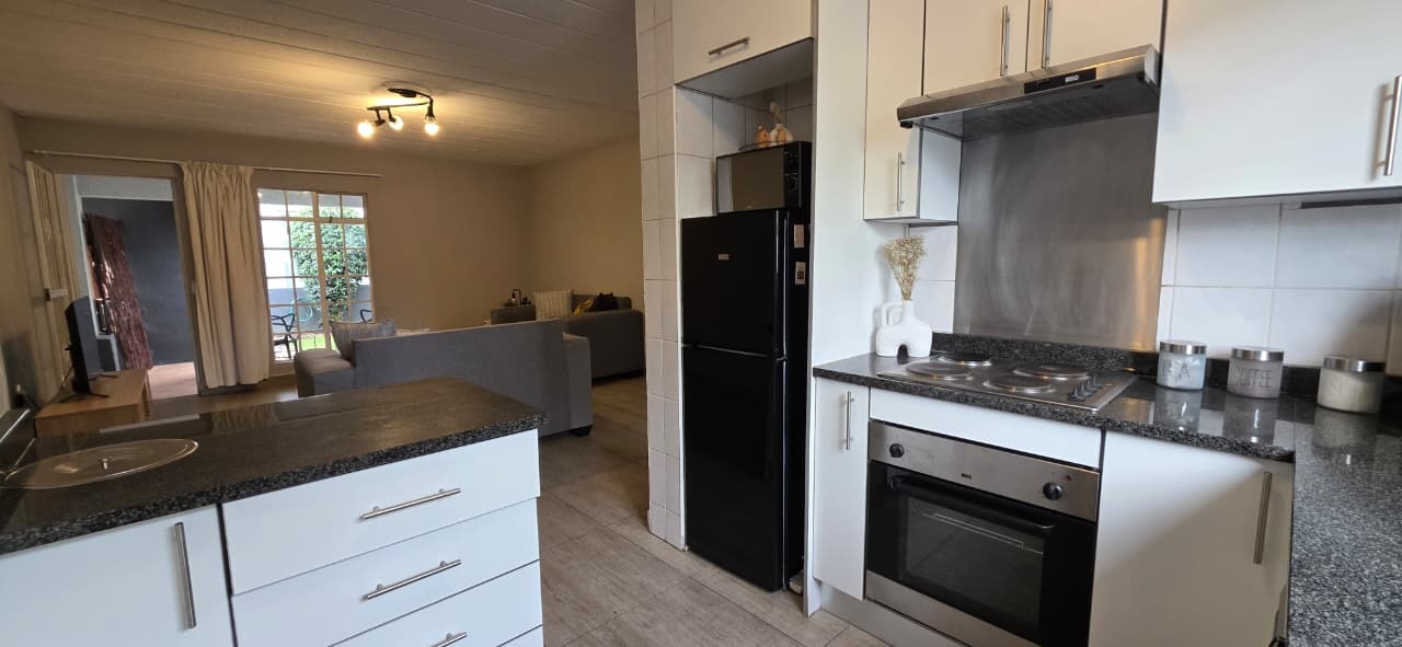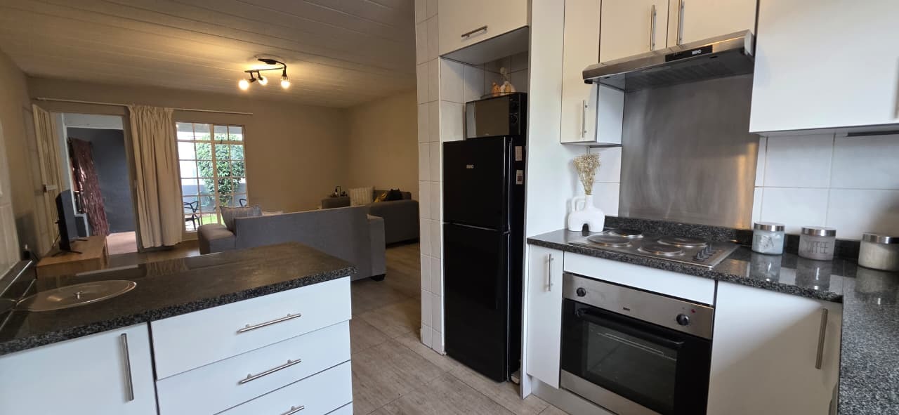 The home features a modern kitchen fitted with sleek granite countertops and clean white cabinetry, creating a bright and inviting space. There is dedicated space for one appliance, along with ample cupboard storage, making the kitchen both functional and stylish. The open-plan design allows for a seamless flow between the kitchen, dining, and lounge areas, creating a welcoming environment for everyday living and entertaining.