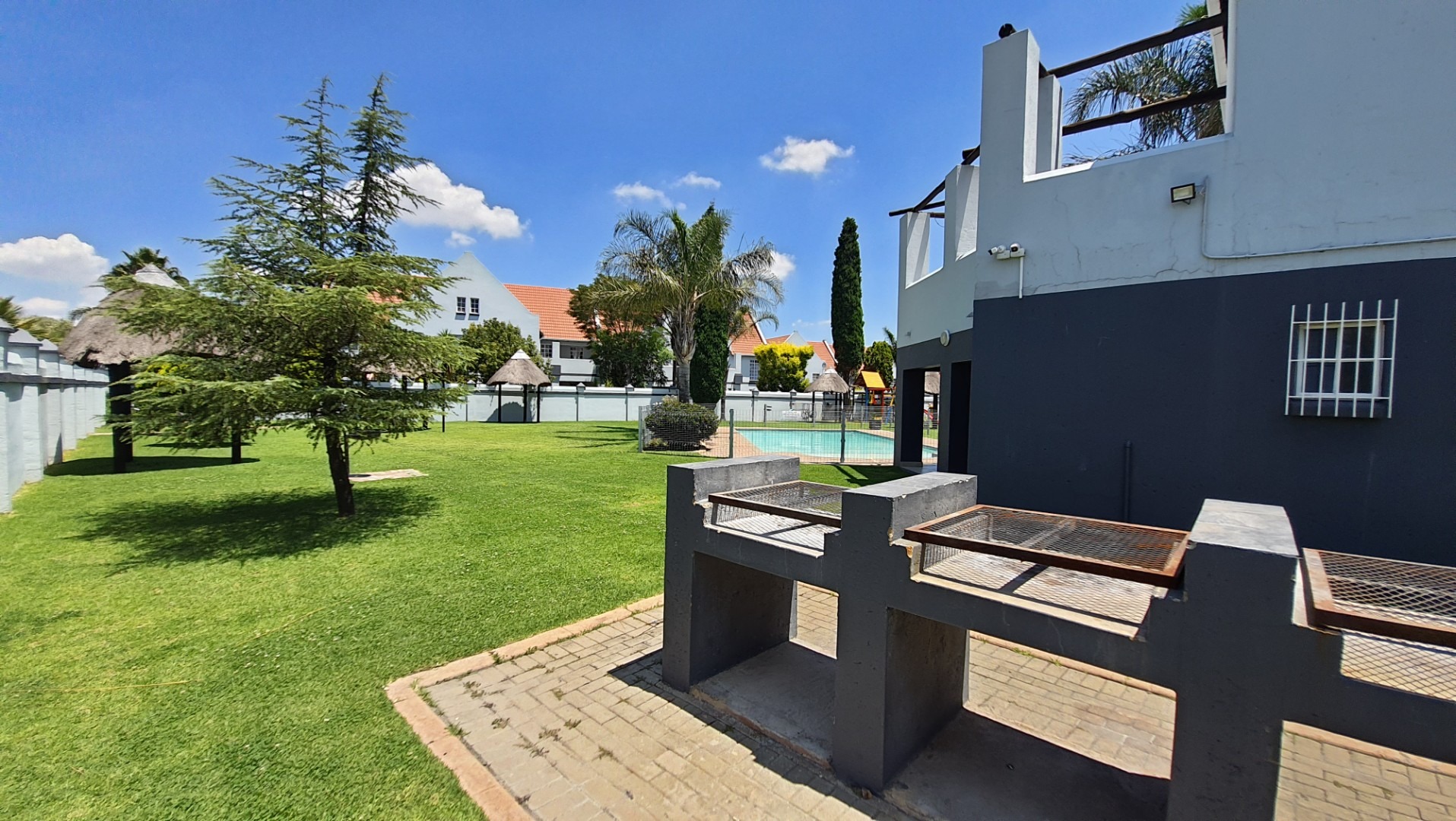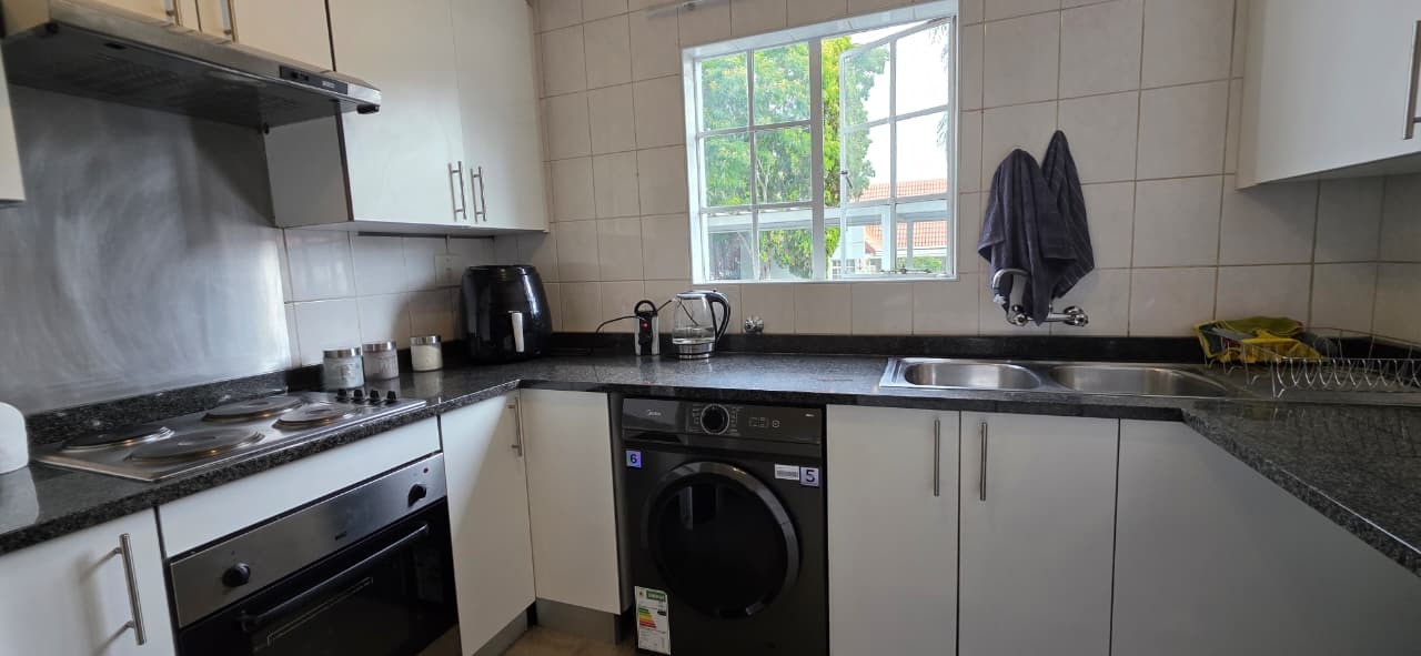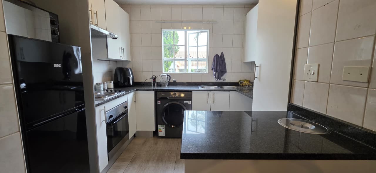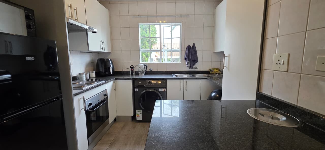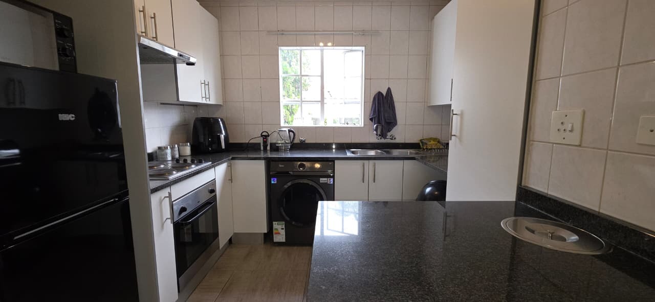 The home features a modern kitchen fitted with sleek granite countertops and clean white cabinetry, creating a bright and inviting space. There is dedicated space for one appliance, along with ample cupboard storage, making the kitchen both functional and stylish. The open-plan design allows for a seamless flow between the kitchen, dining, and lounge areas, creating a welcoming environment for everyday living and entertaining.