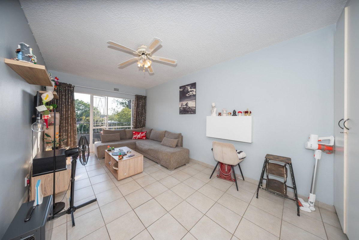 Discover comfortable living in this well-appointed 1-bedroom, 1-bathroom apartment, ideally situated within a secure complex in Edenvale Central. Spanning 53 square metres, this residence offers a practical and inviting layout designed for modern convenience. The bright living area features durable tiled flooring, light blue walls, and ample natural light streaming through large windows and sliding doors, complemented by a ceiling fan for comfort. The open-plan design enhances the sense of space and flow.