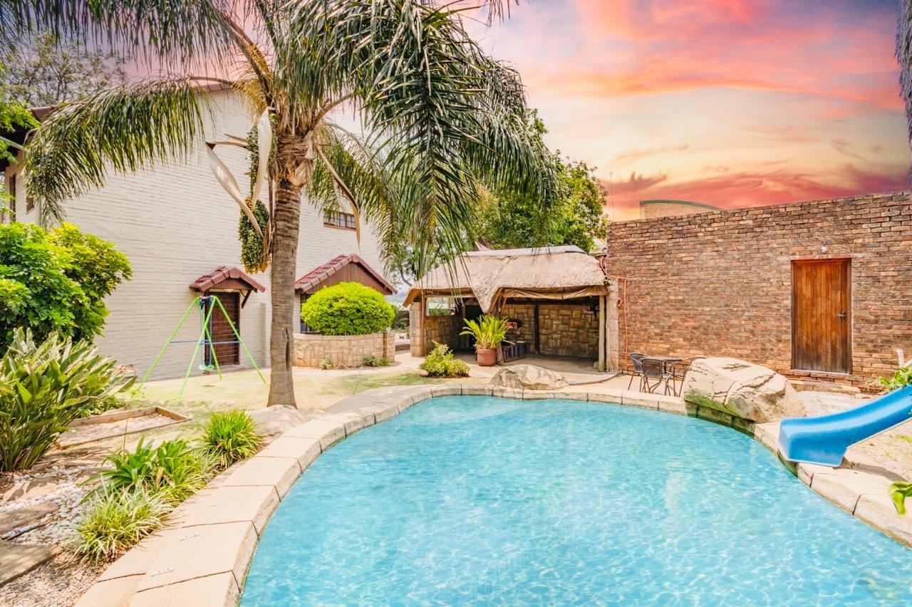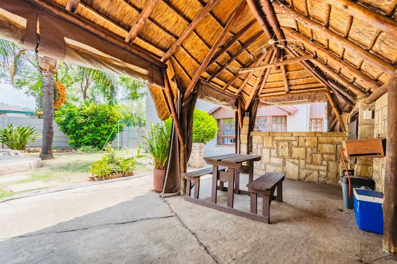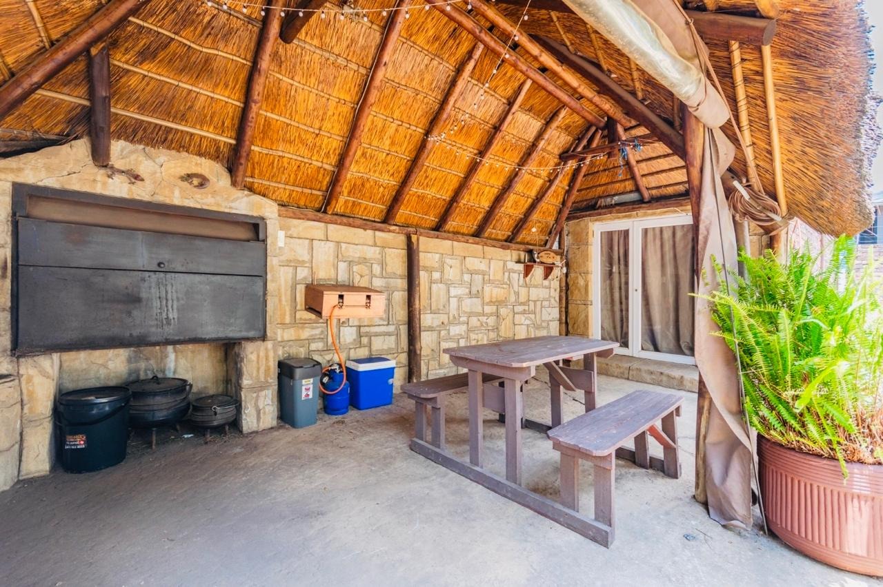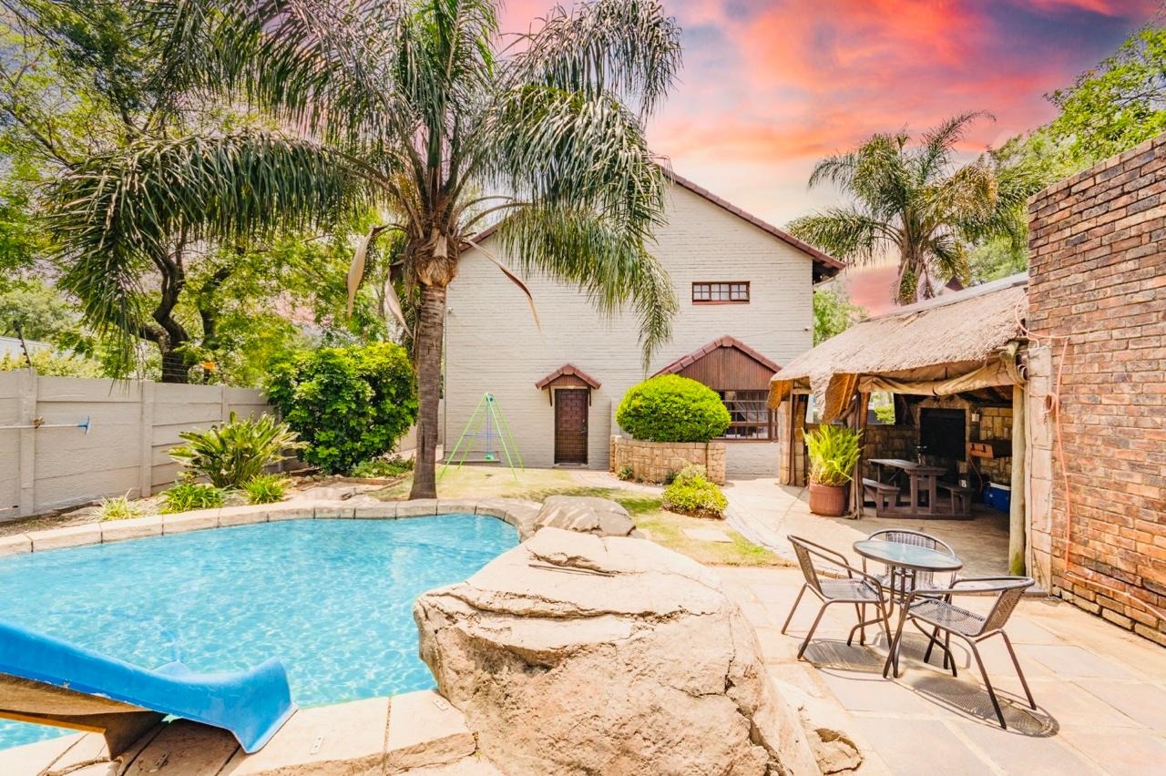 Outdoor amenities include a refreshing swimming pool, a lapa perfect for entertaining with a built in braai,an outbuilding and an outside toilet for use after swimming, and a well-kept garden. Practical features such as a double garage, additional parking, a non functional borehole,.