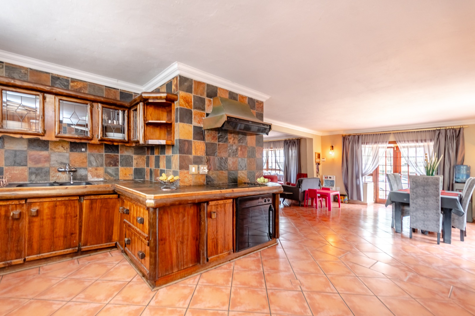 Step inside to find spacious, open-plan massive living and dining areas bathed in natural light from large windows, some boasting integrated window seats. Durable tiled flooring extends throughout these communal spaces, which are further enhanced by decorative embossed ceilings and elegant chandeliers. A prominent traditional wooden staircase adds character, while the kitchen offers ample warm-toned wooden cabinetry, a unique multi-toned tiled backsplash, and integrated cooking appliances, lots of storage space.
