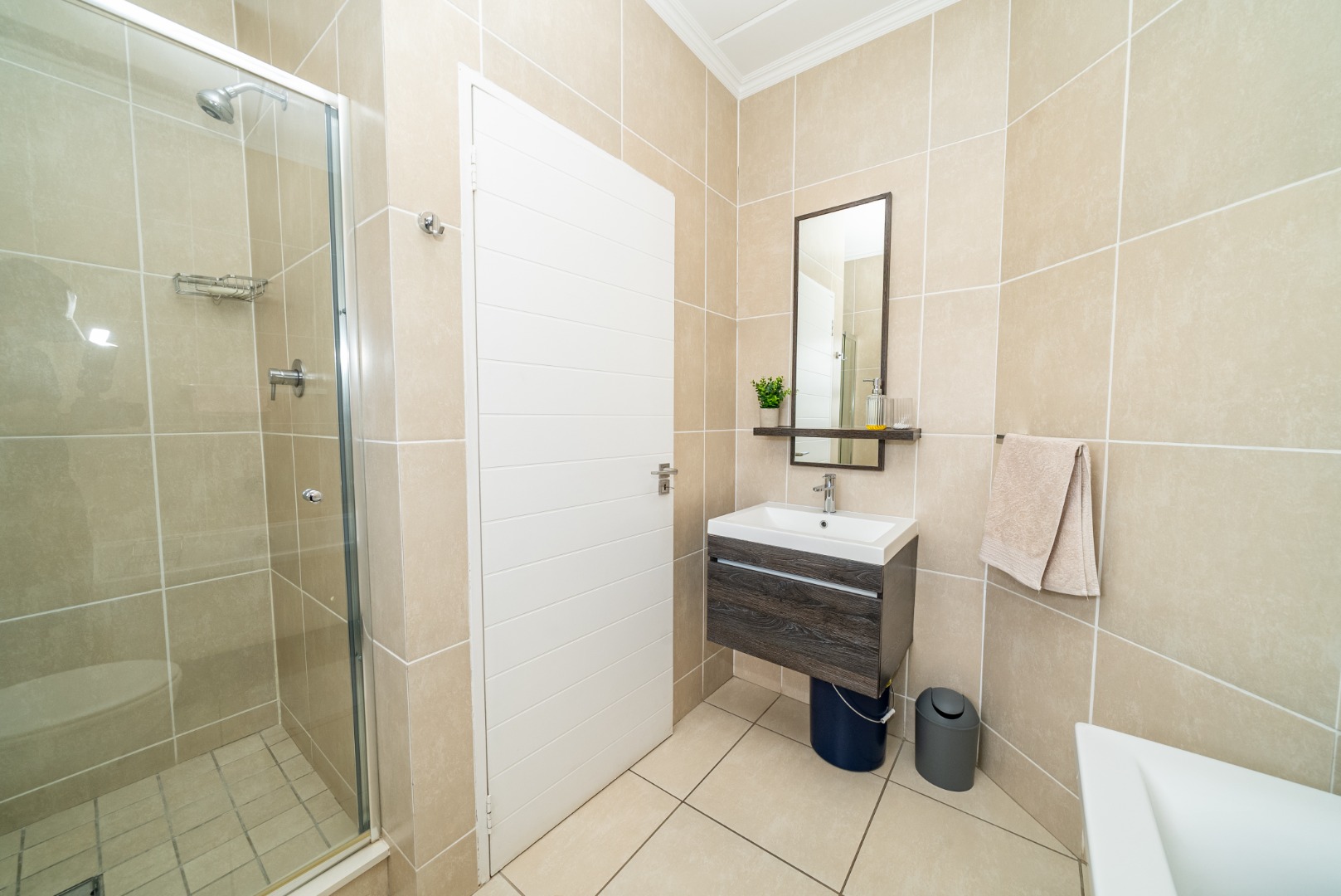 Both bedrooms are well-proportioned and fitted with floor-to-ceiling built-in cupboards. The main bedroom offers the convenience of an en-suite bathroom with a shower, while the second bathroom features both a bath and a shower and services the second spacious bedroom.