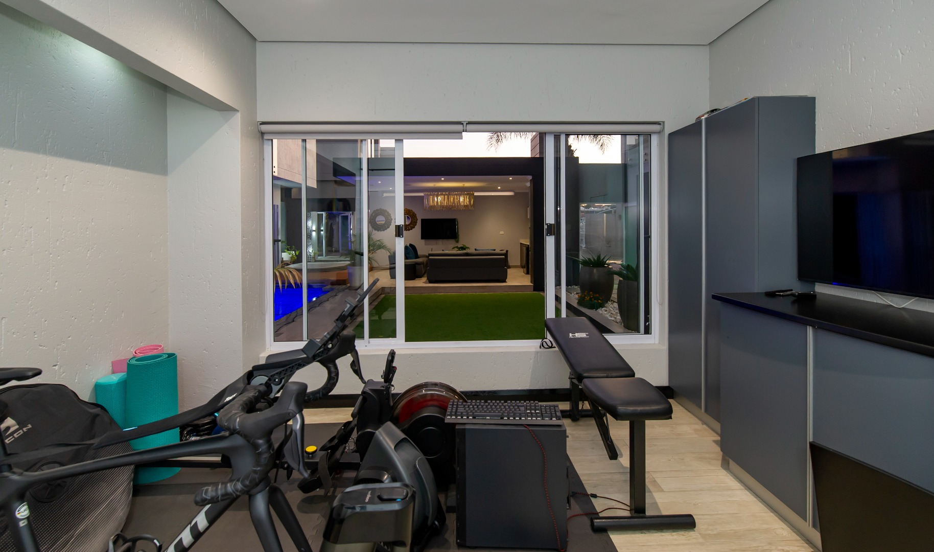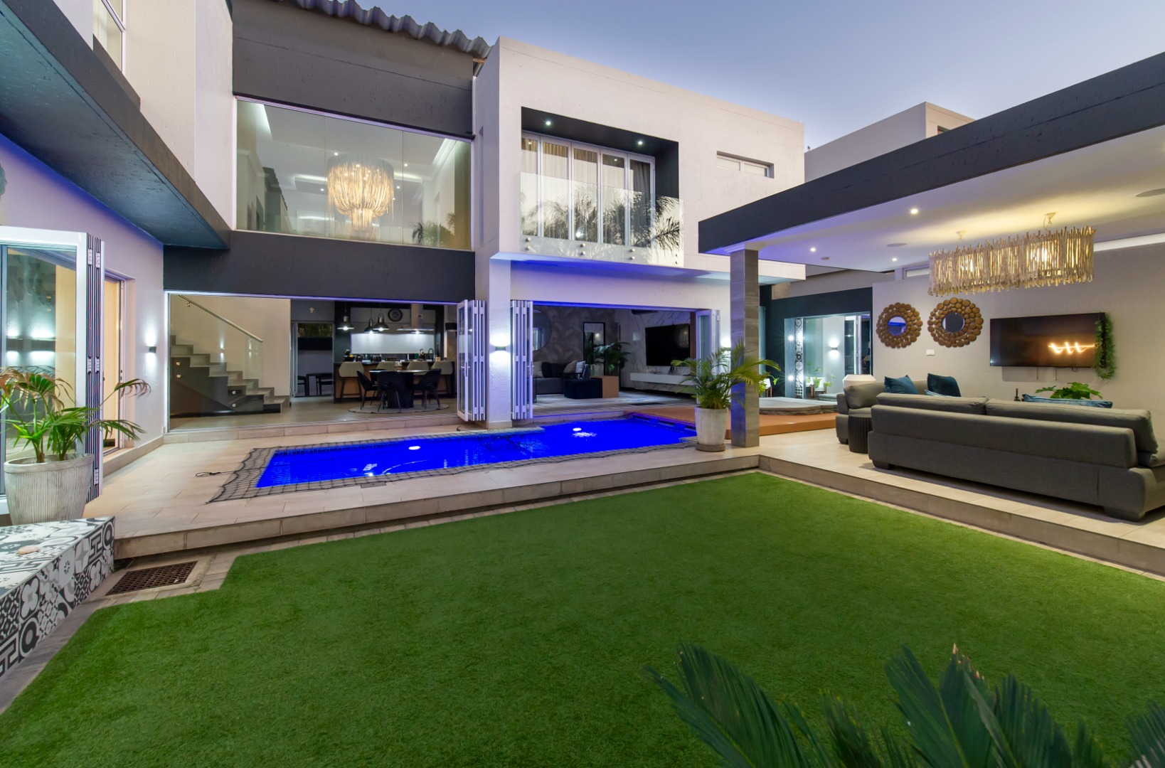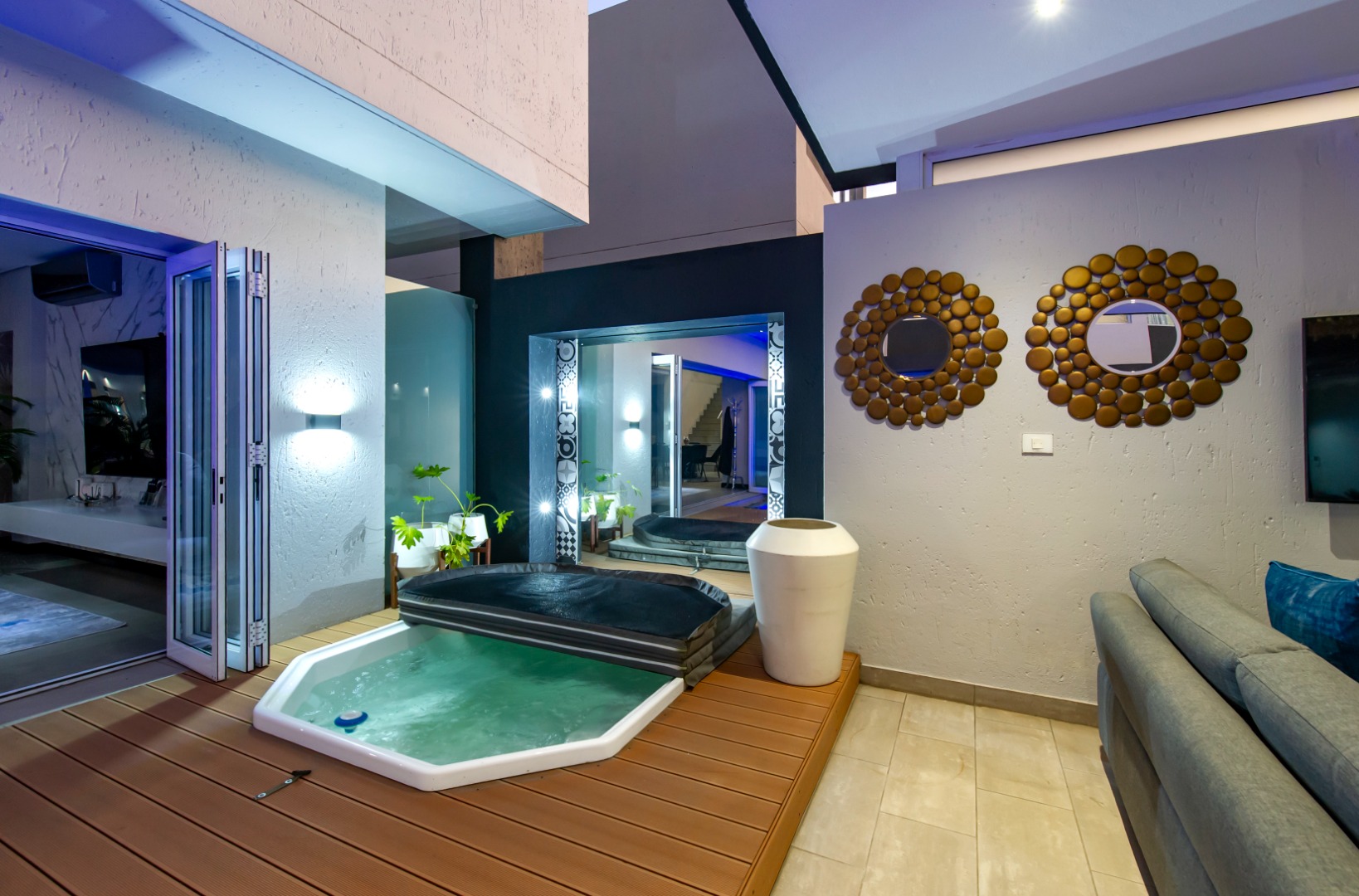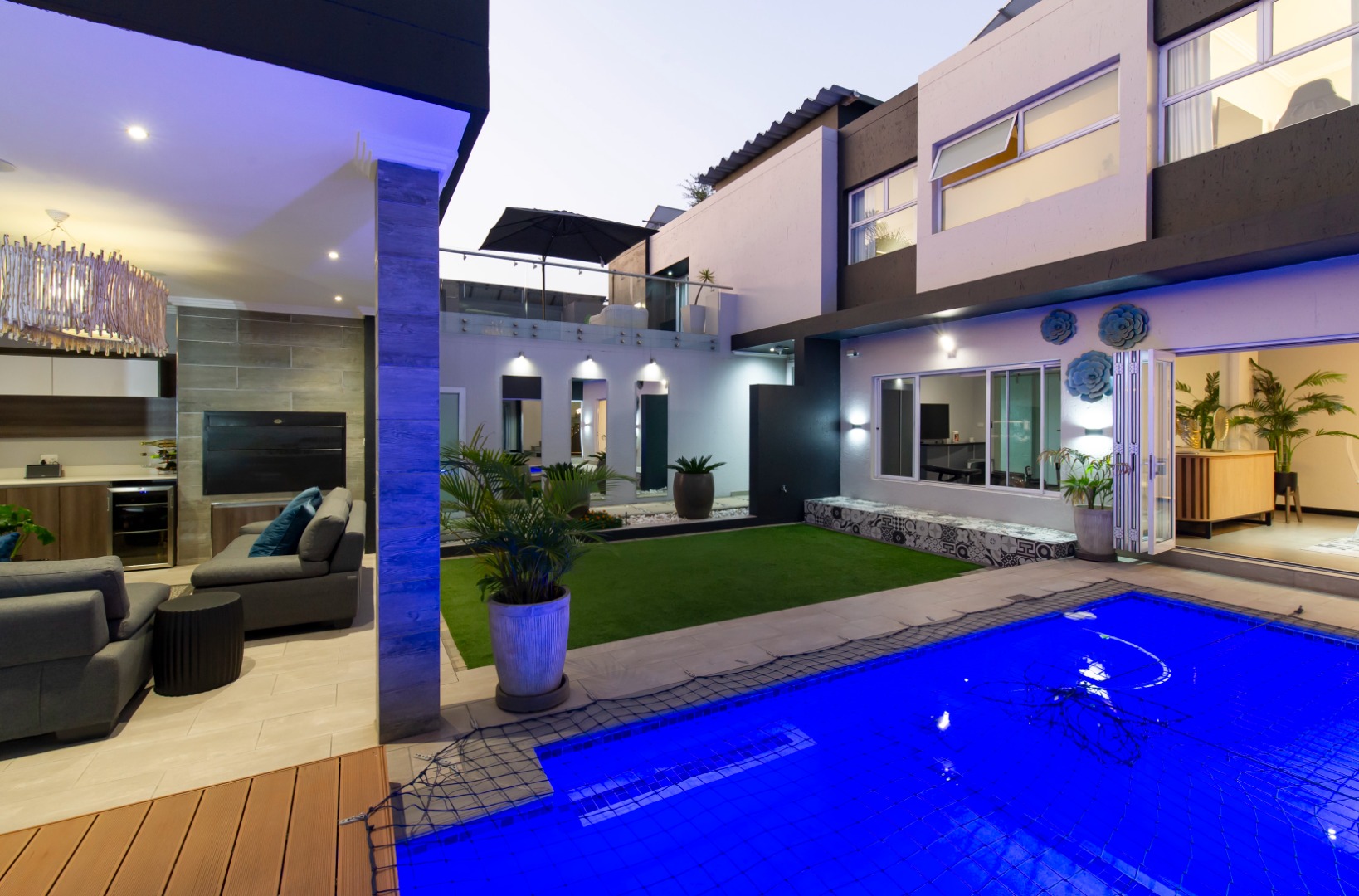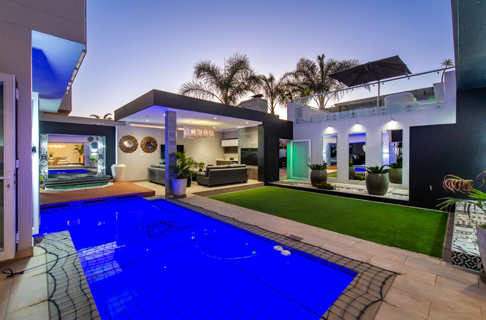 All living and reception areas open onto a magnificent enclosed entertainment space, complete with a covered patio, built-in gas braai , jacuzzi , gym and a sparkling heated swimming pool—perfect for year-round enjoyment.