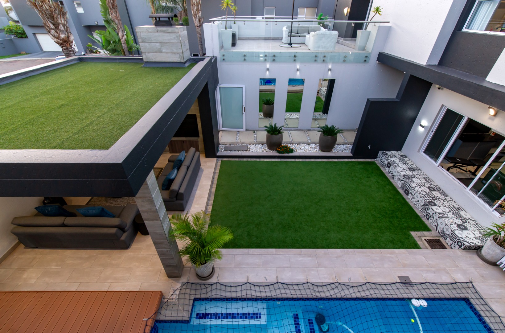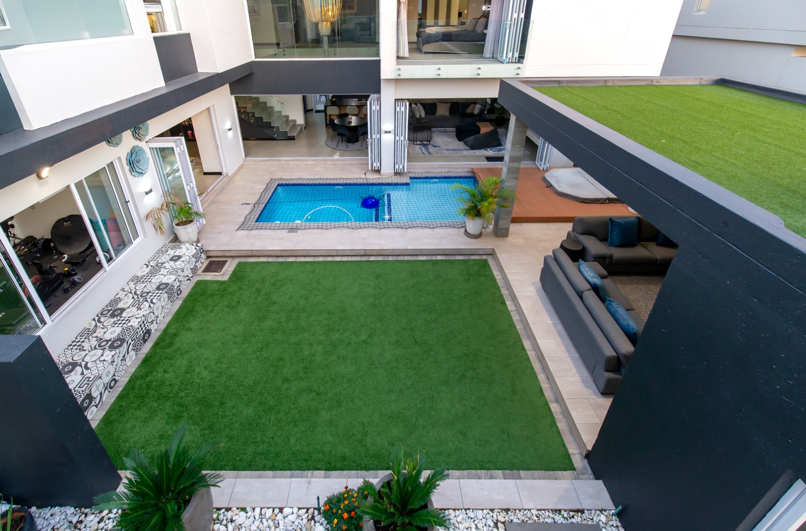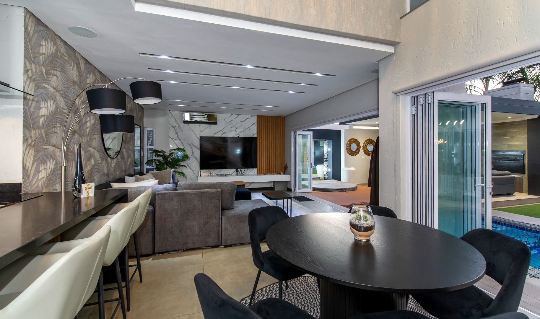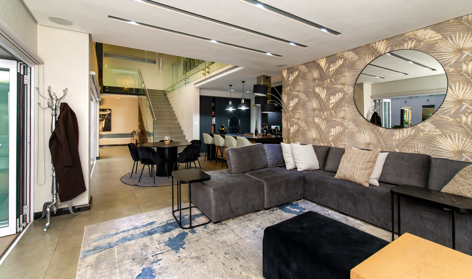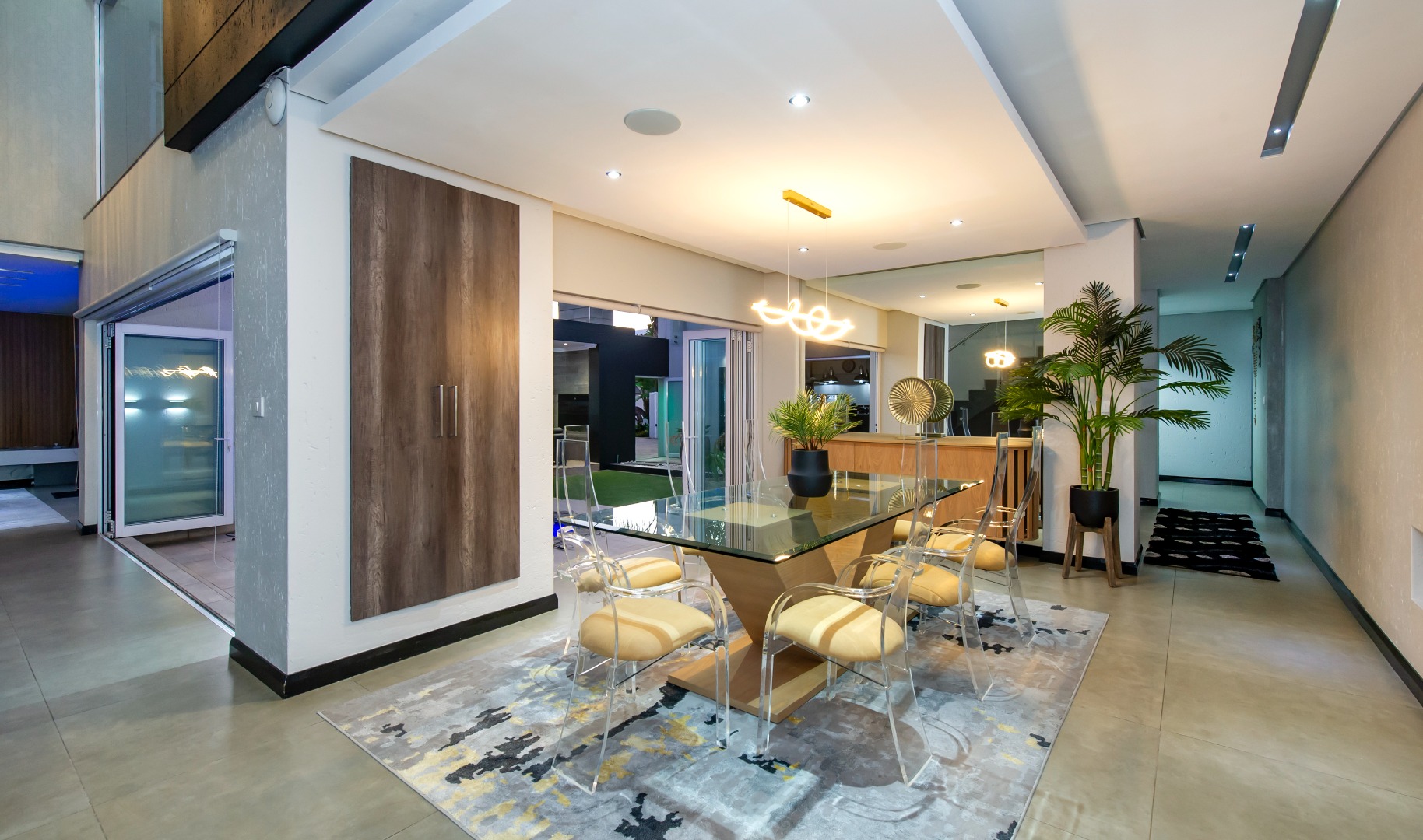 All living and reception areas open onto a magnificent enclosed entertainment space, complete with a covered patio, built-in gas braai , jacuzzi , gym and a sparkling heated swimming pool—perfect for year-round enjoyment.