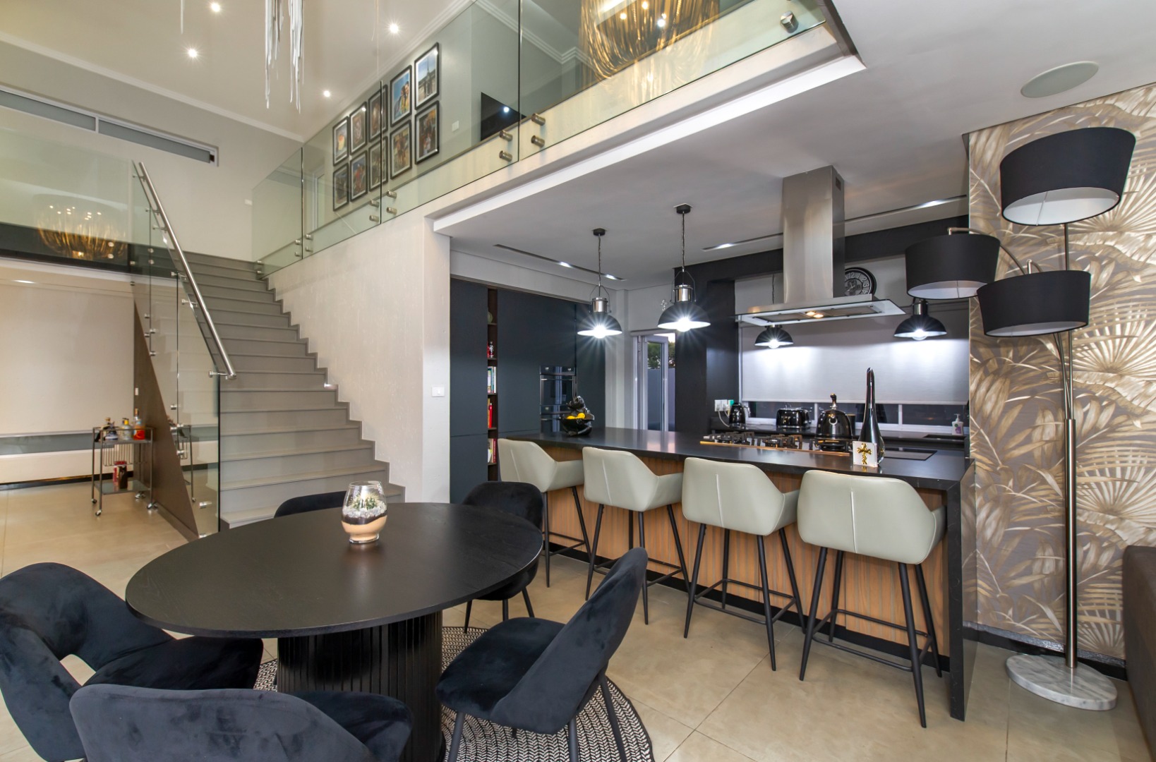 A glass feature staircase leads you Upstairs where you’ll find four luxurious, sunlit bedrooms, including two en-suite rooms, a spacious family bathroom, and a cozy pyjama lounge. The opulent master suite is a private retreat, featuring a walk-in dressing room and an ultra-luxurious spa-like bathroom. Upstairs sun drenched patio leads off one of the bedrooms .