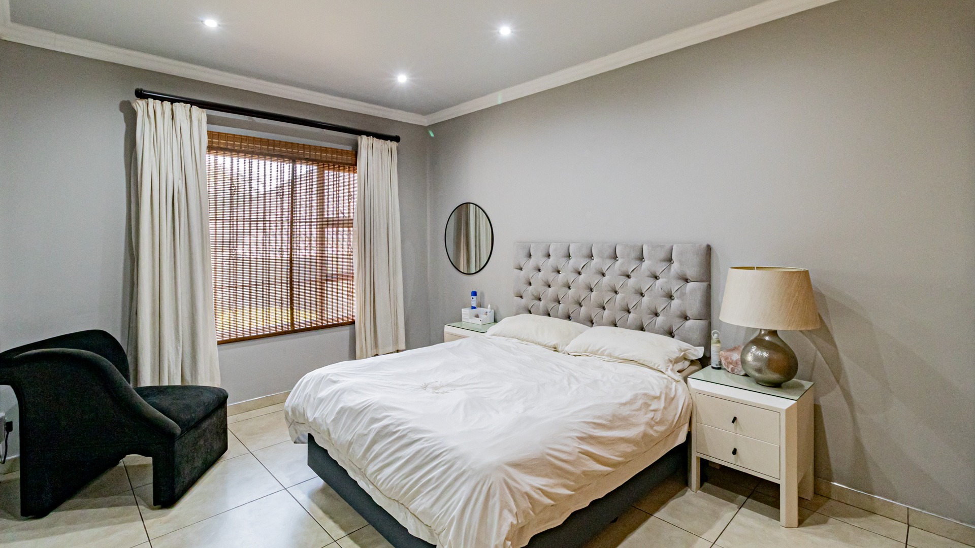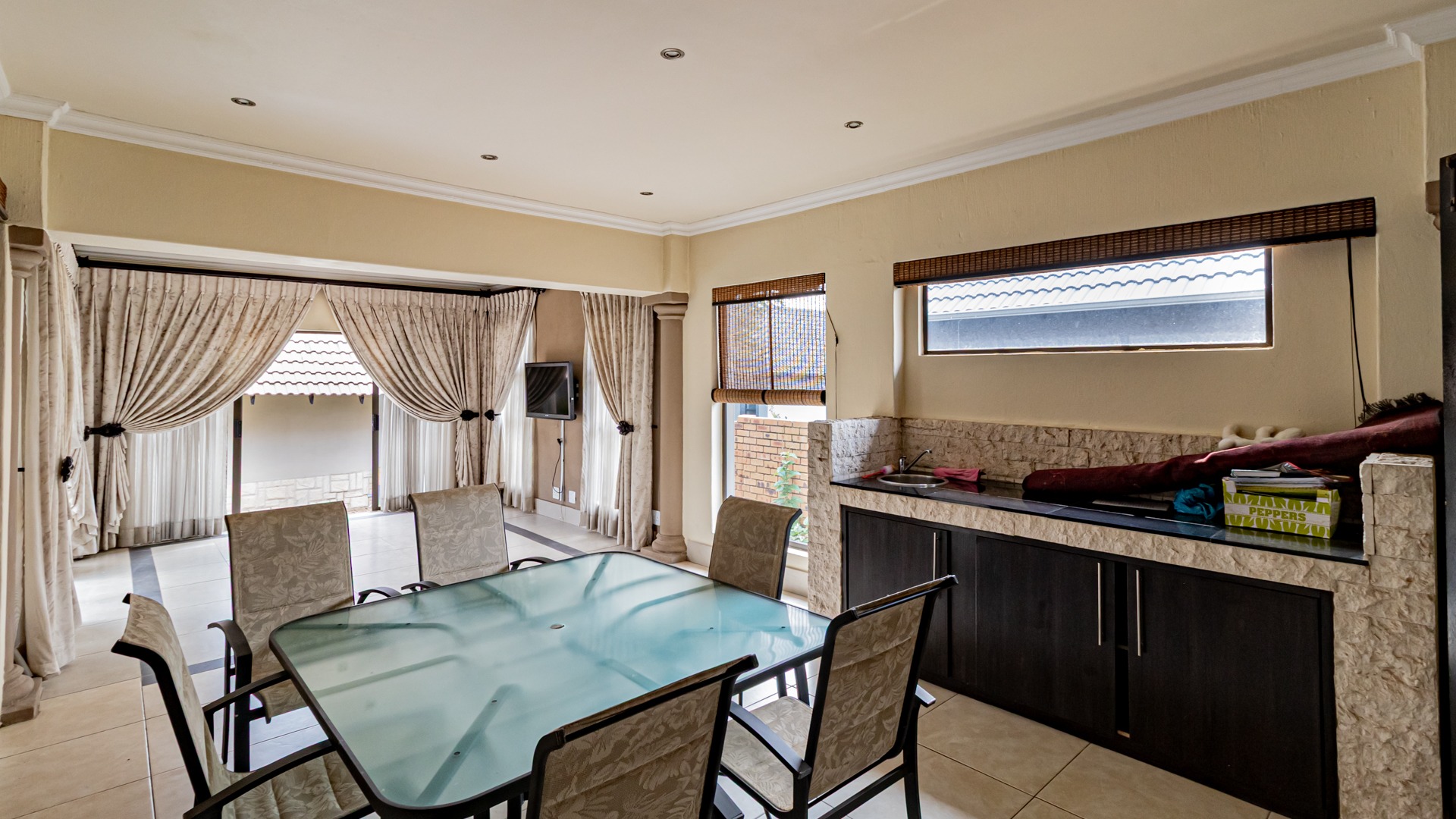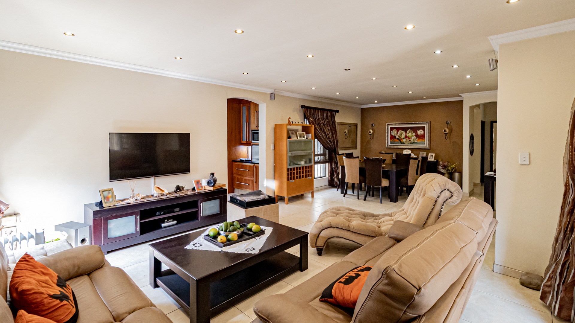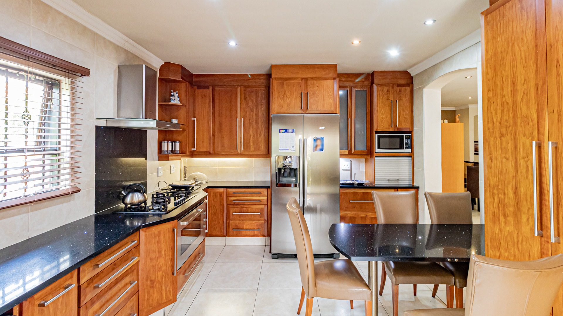 At the heart of the home is a large modern kitchen fitted with granite countertops, a gas hob, and generous cupboard space. The kitchen flows seamlessly into the open-plan lounge and dining area, creating a warm and inviting space ideal for both everyday family life and entertaining. Fully tiled living areas enhance the clean, contemporary feel while ensuring easy maintenance.