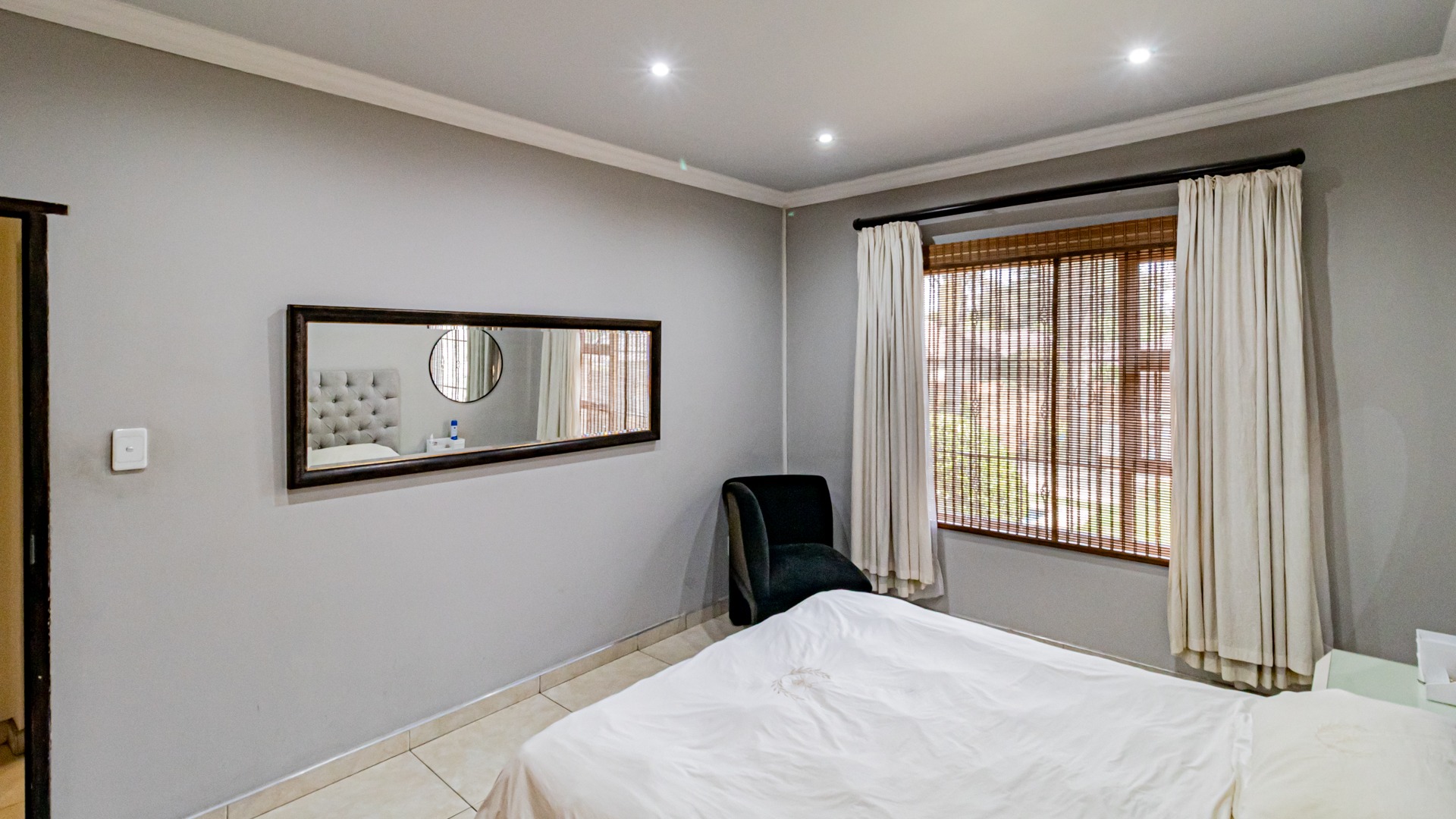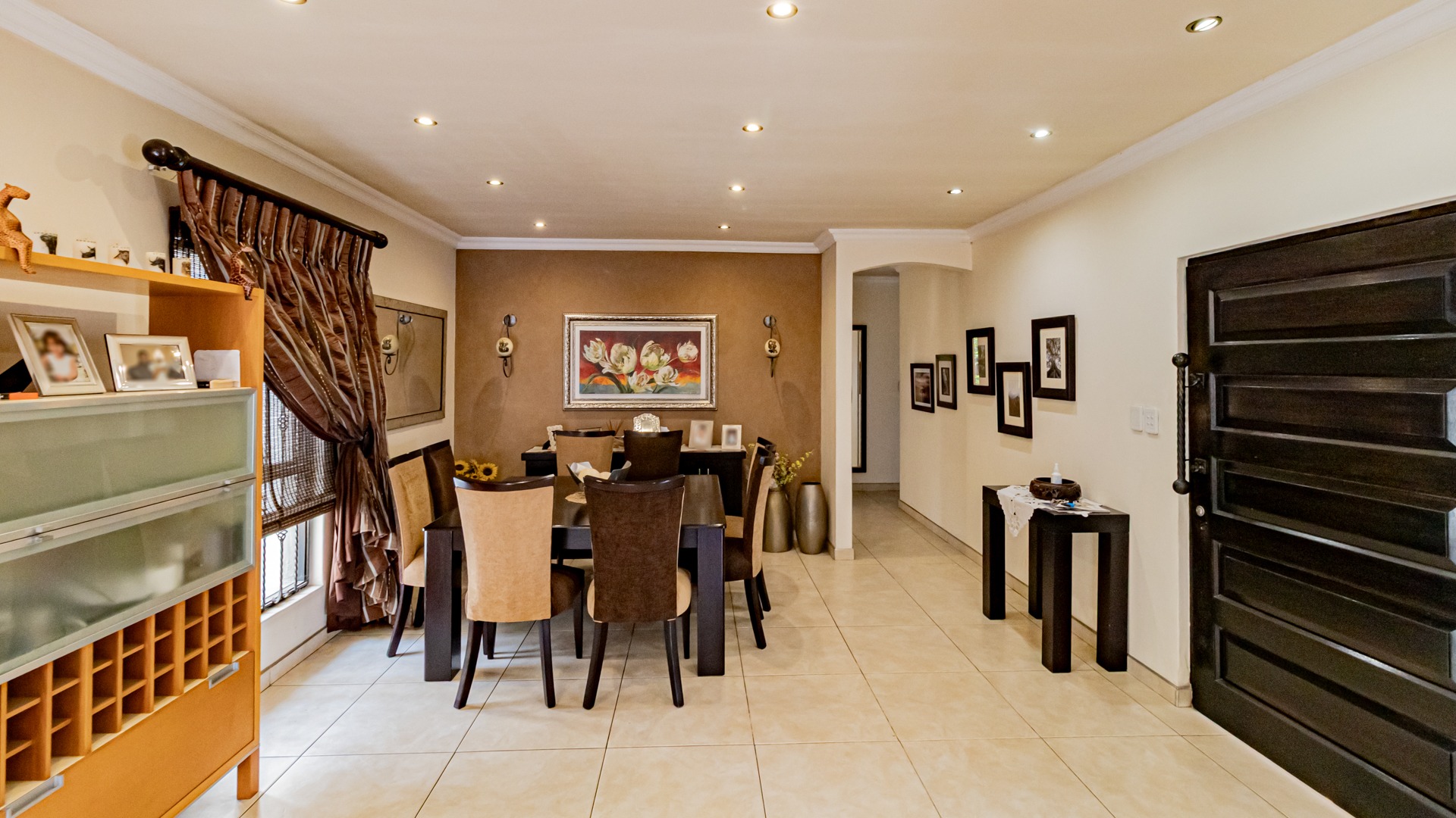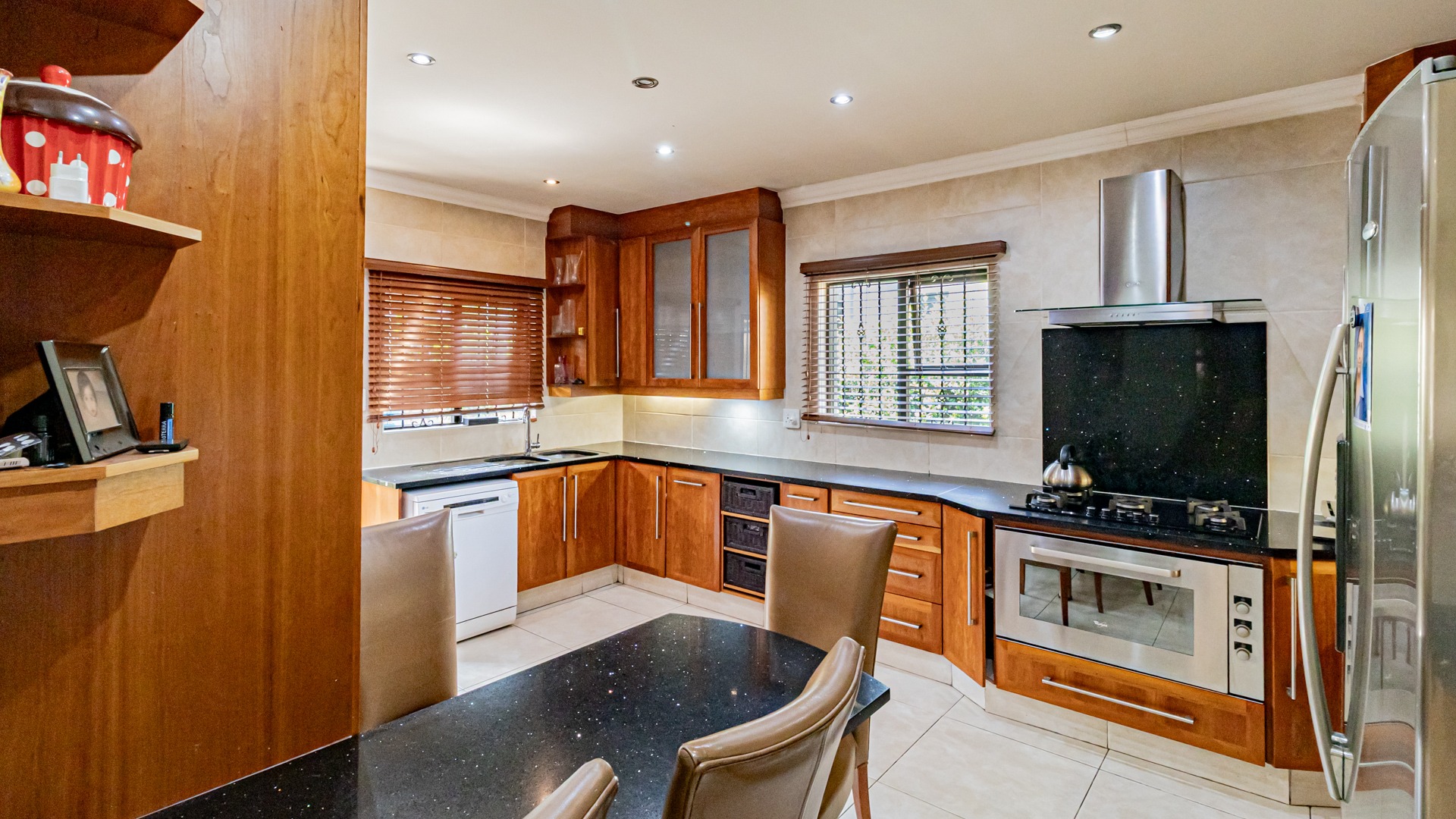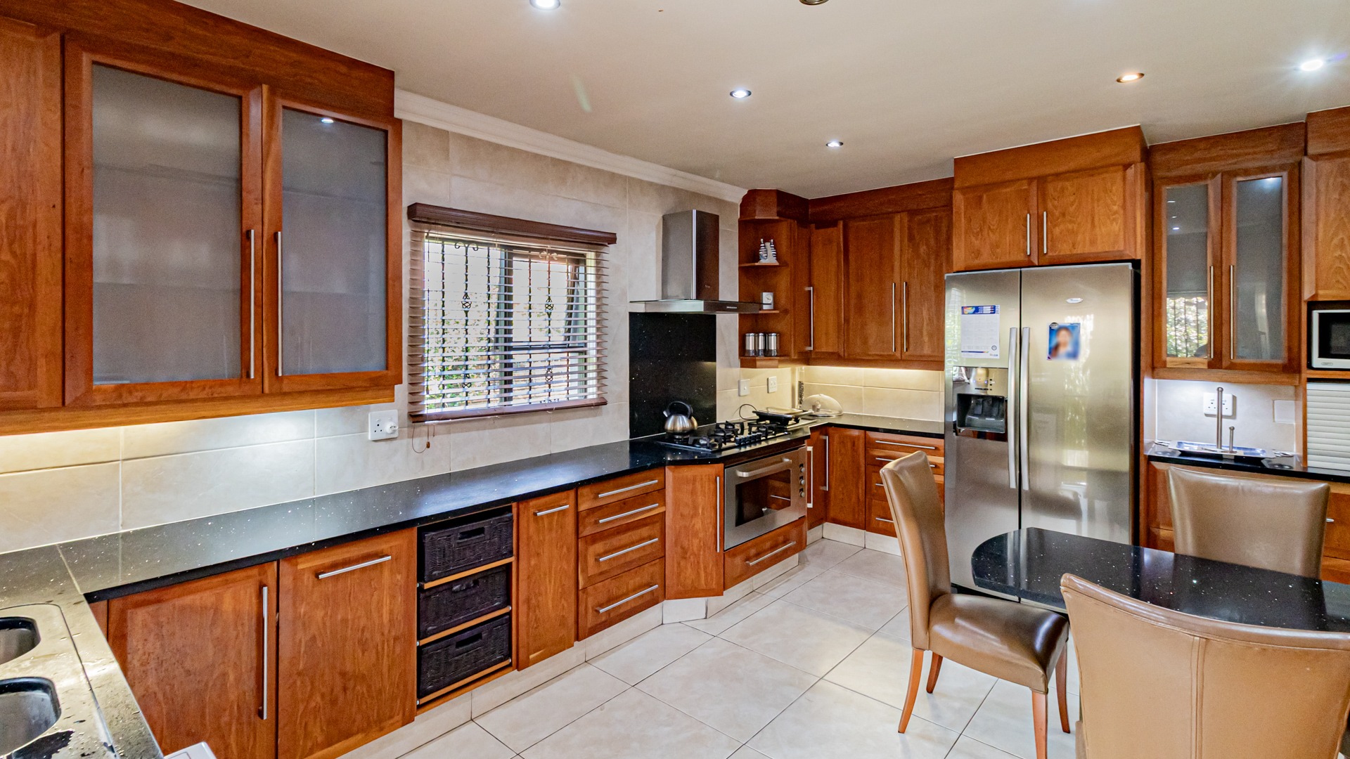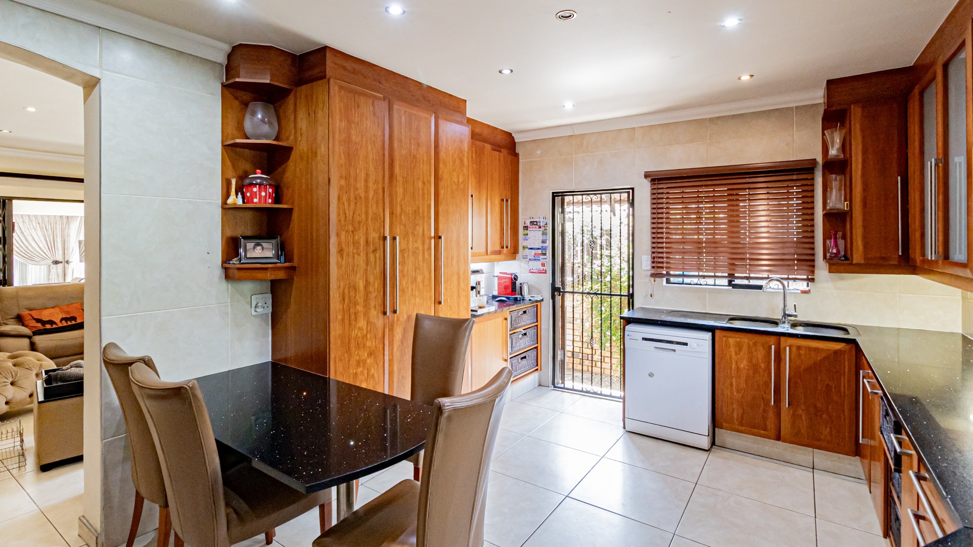At the heart of the home is a large modern kitchen fitted with granite countertops, a gas hob, and generous cupboard space. The kitchen flows seamlessly into the open-plan lounge and dining area, creating a warm and inviting space ideal for both everyday family life and entertaining. Fully tiled living areas enhance the clean, contemporary feel while ensuring easy maintenance.