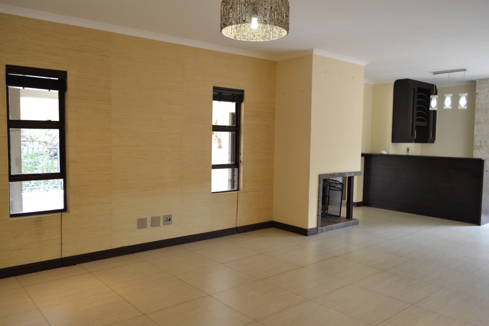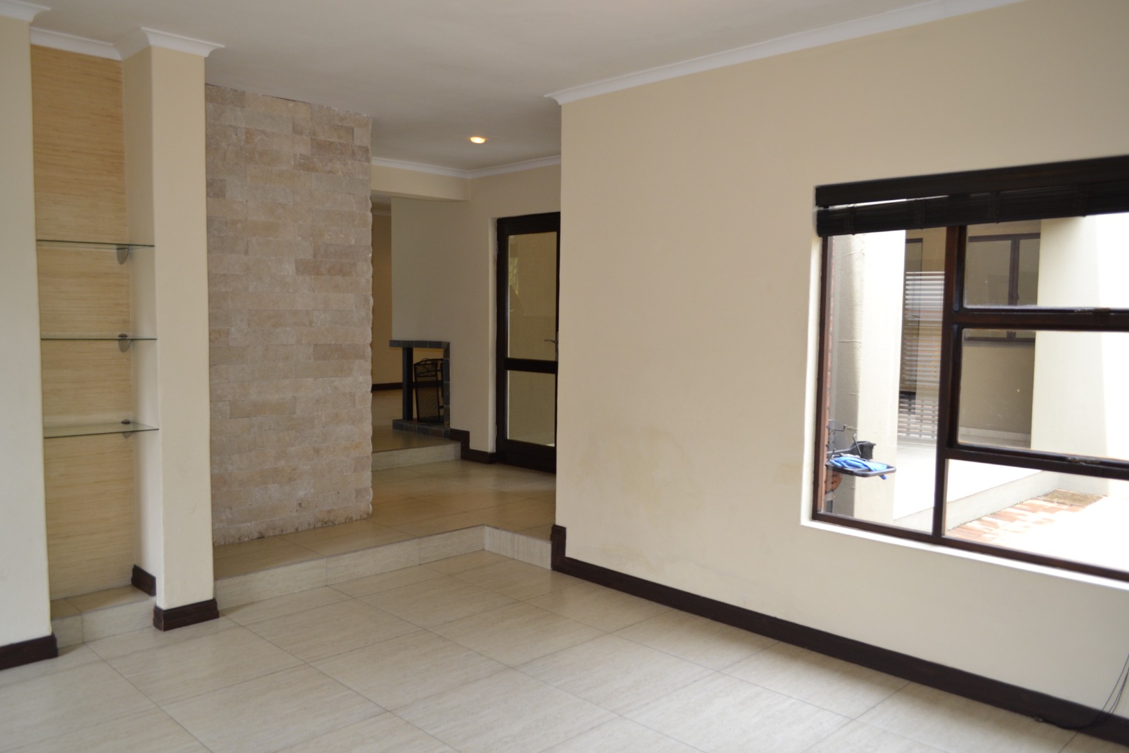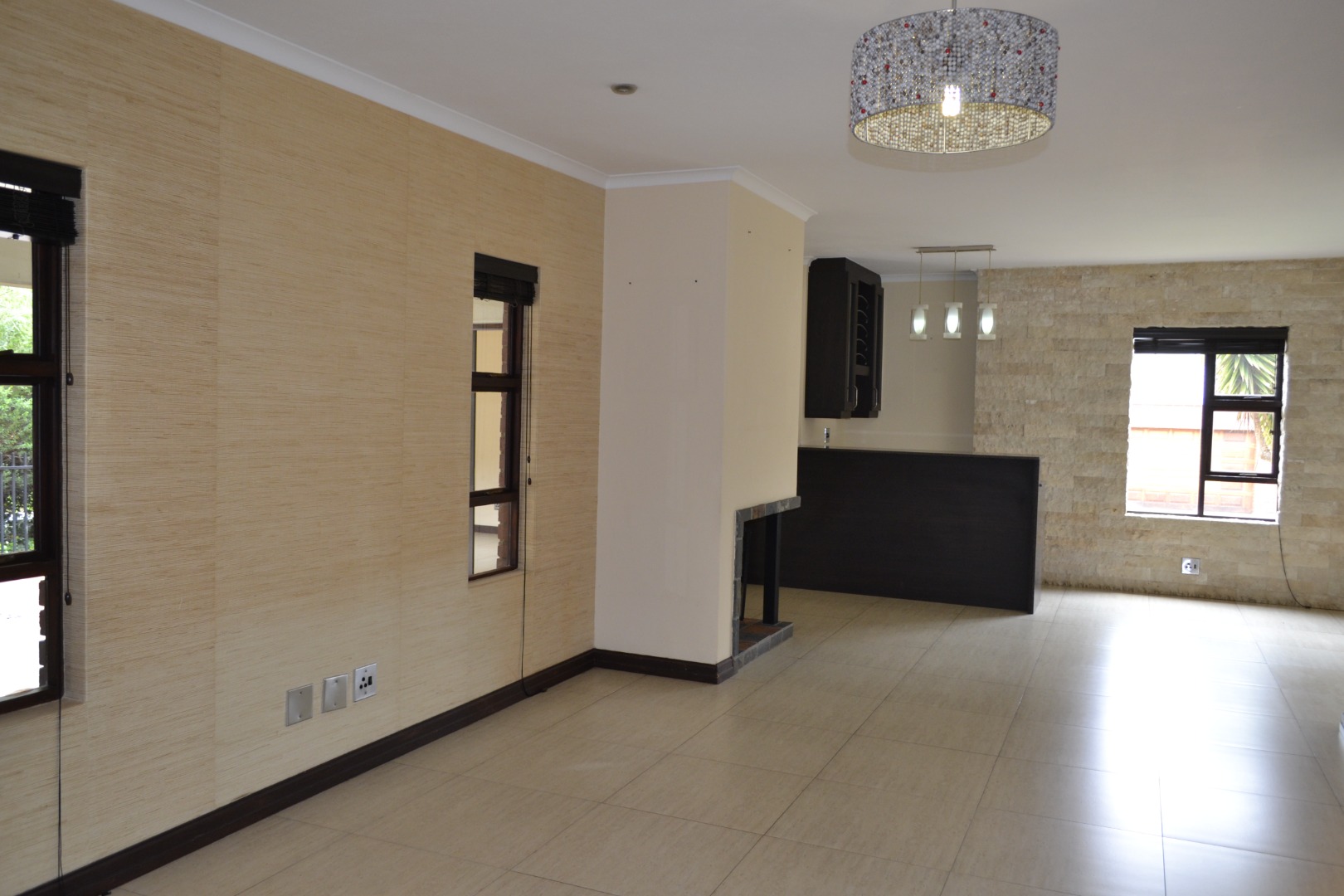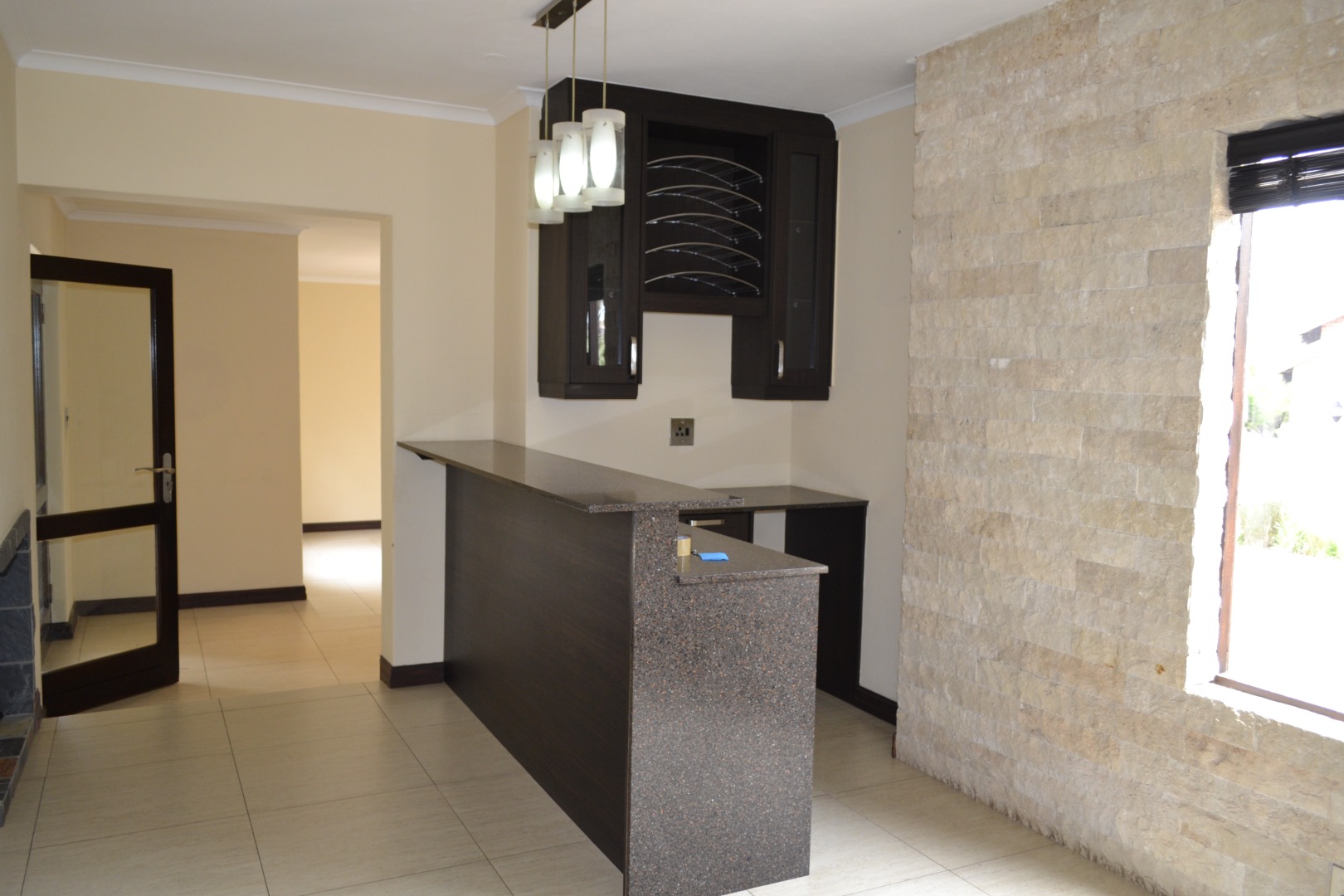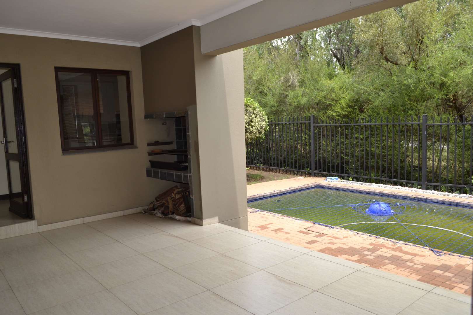 The home features an expansive open-plan living area enhanced by contemporary tiled flooring, a striking stone-clad accent wall, textured wallpaper, and a built-in bar with dedicated wine storage, complemented by a cozy fireplace that creates an inviting space for both entertaining and everyday relaxation. A separate dining room and a dedicated study add versatility for family living and working from home. The kitchen has caesar stone counter tops, ample cupboard space with an attached scullery that has space for two under counter appliances. The living area leads out onto a covered patio that overlooks a private garden, a refreshing swimming pool and is located next to a greenbelt.