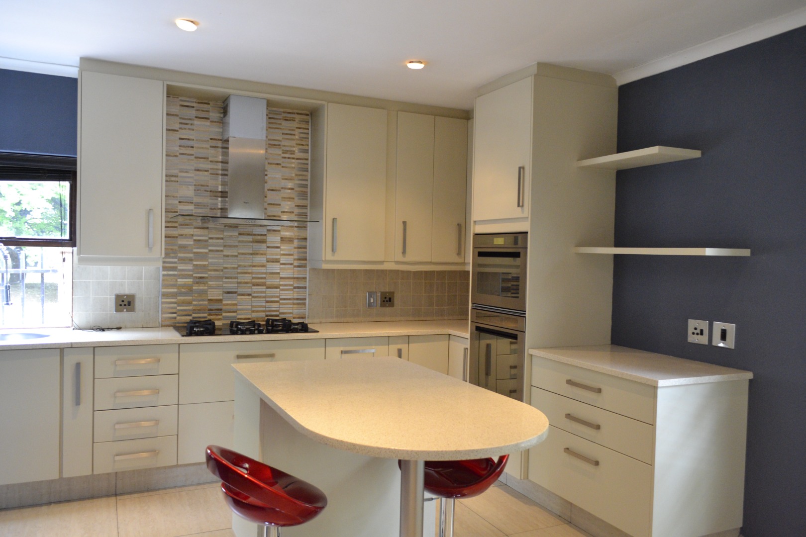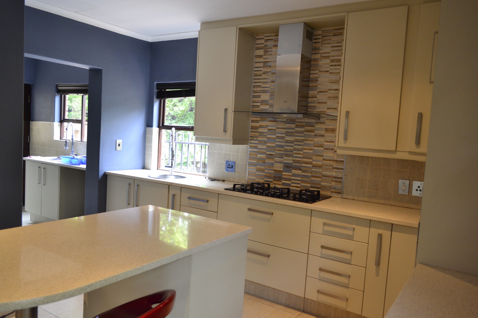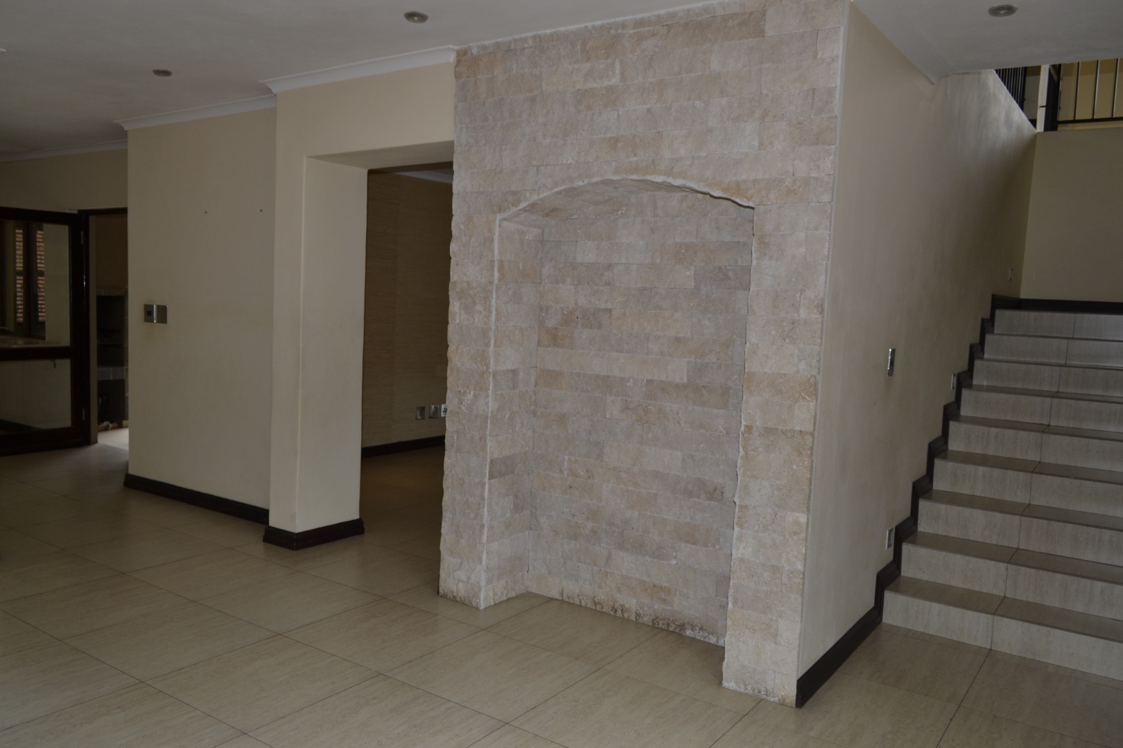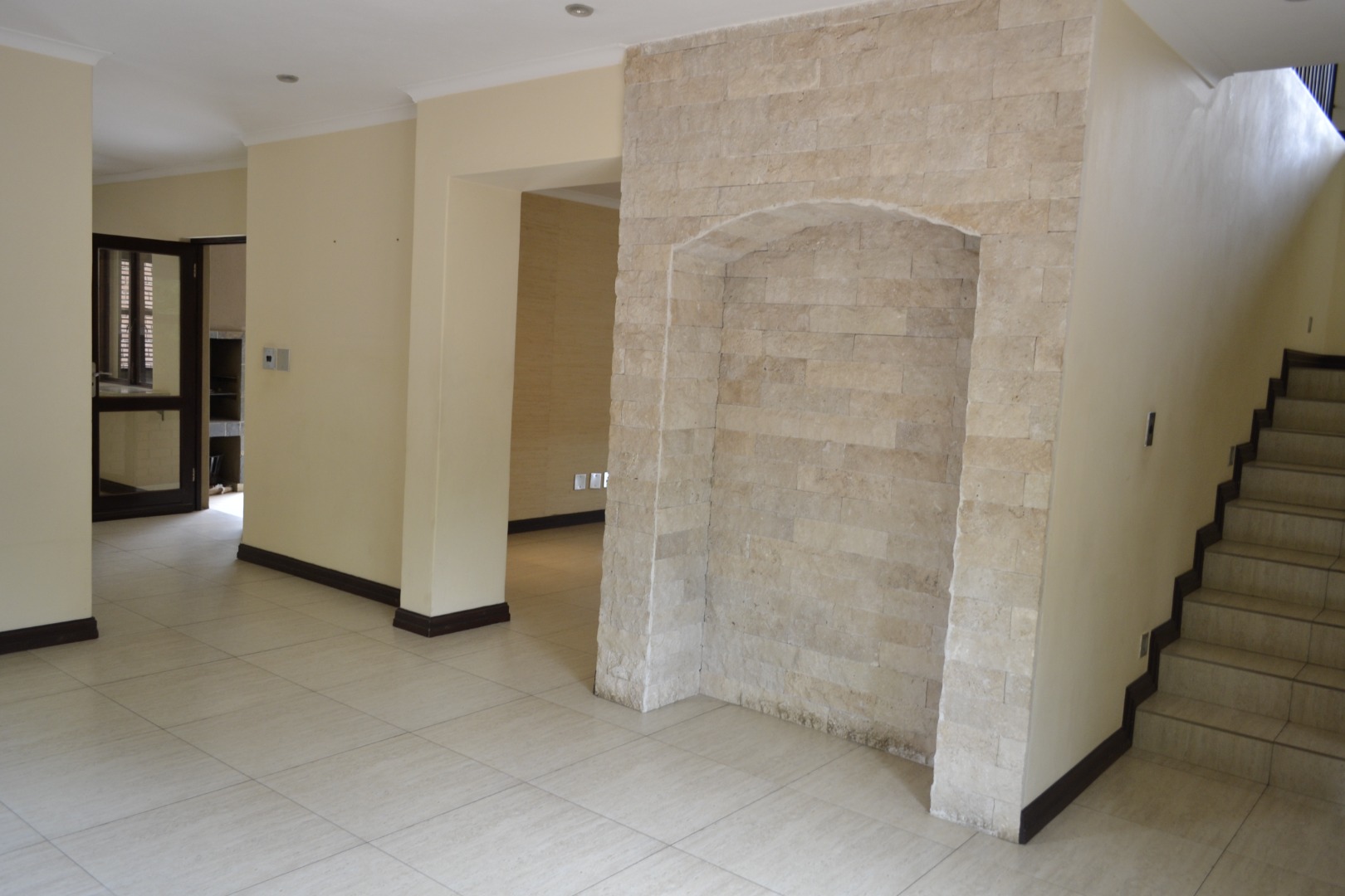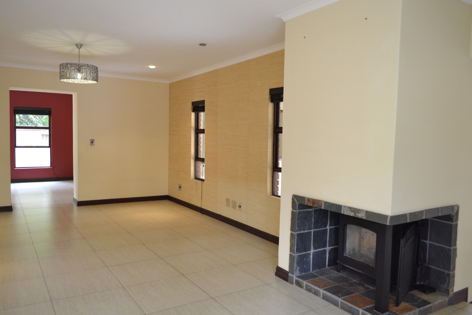 The home features an expansive open-plan living area enhanced by contemporary tiled flooring, a striking stone-clad accent wall, textured wallpaper, and a built-in bar with dedicated wine storage, complemented by a cozy fireplace that creates an inviting space for both entertaining and everyday relaxation. A separate dining room and a dedicated study add versatility for family living and working from home. The kitchen has caesar stone counter tops, ample cupboard space with an attached scullery that has space for two under counter appliances. The living area leads out onto a covered patio that overlooks a private garden, a refreshing swimming pool and is located next to a greenbelt.