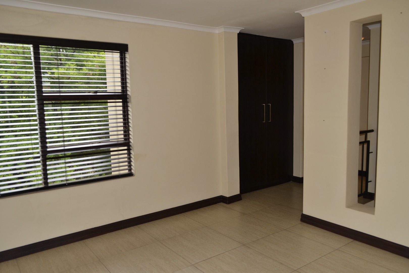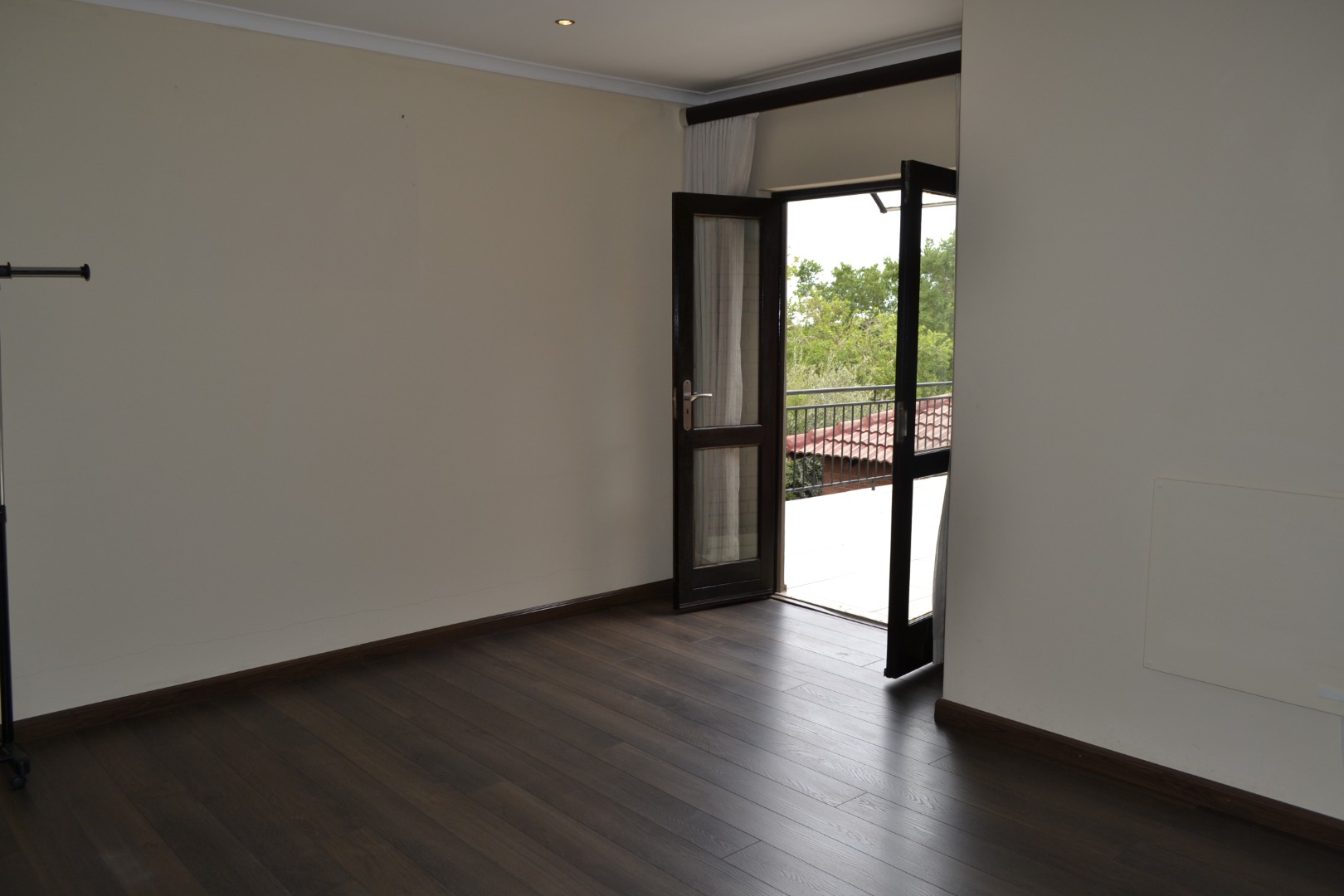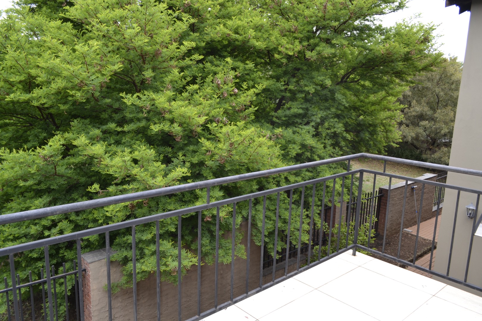 All five bedrooms are generously sized, with one offering dark wood laminate flooring, ample dark wood built-in cupboards, and direct access to a private patio through a large glass door, while the four well-appointed bathrooms comfortably serve a busy household. There is also a balcony overlooking lush greenery, providing a tranquil escape.