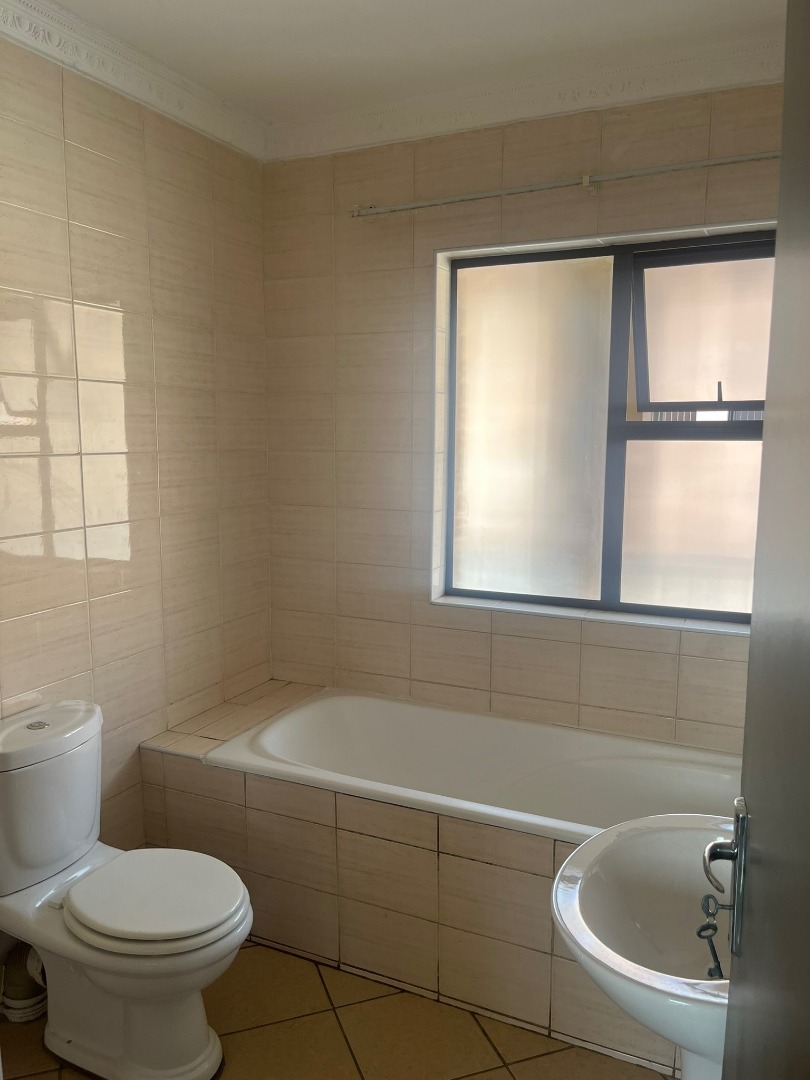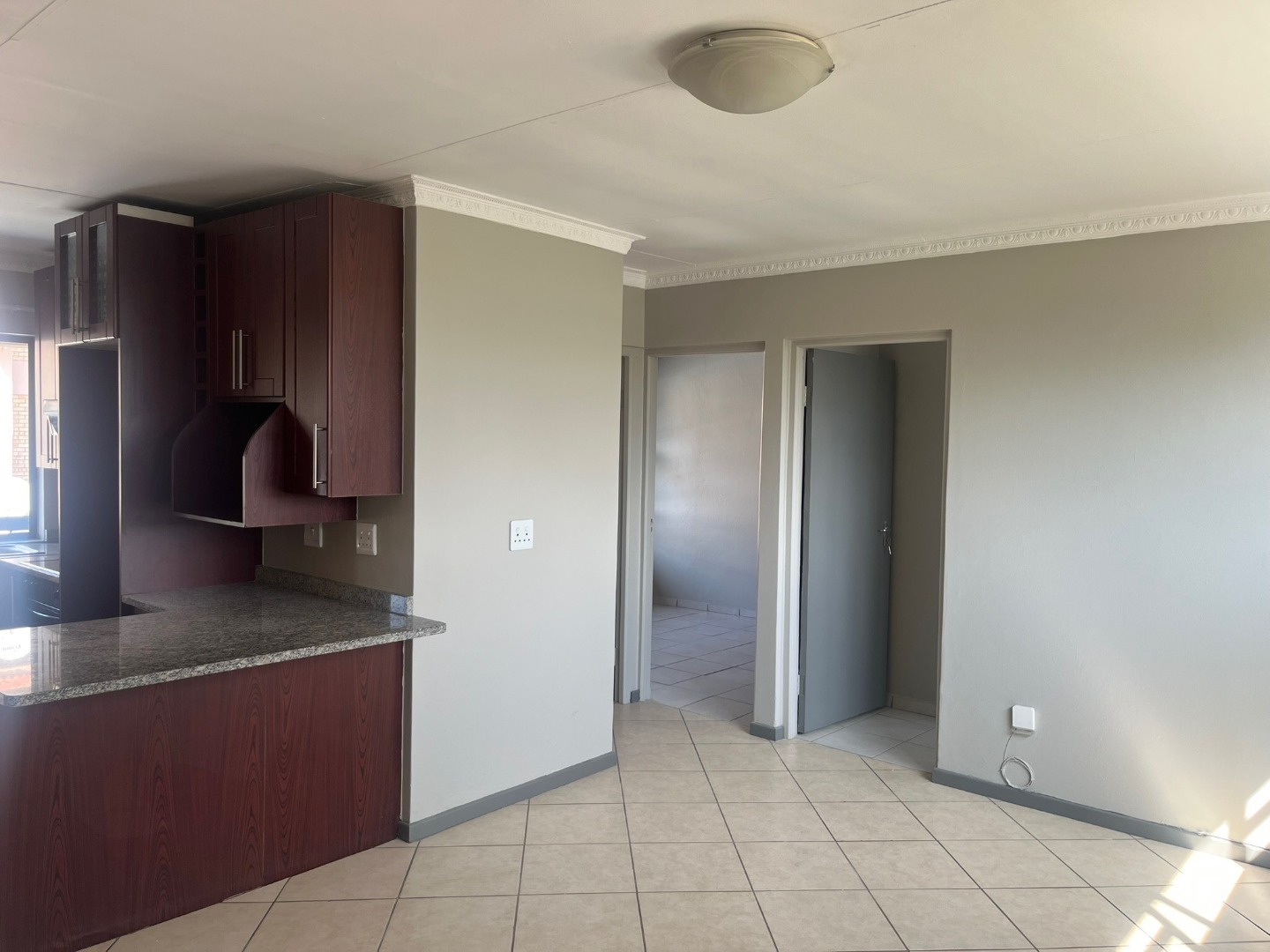 The apartment features a spacious open-plan lounge and dining area, with tiled flooring throughout for easy upkeep and a modern feel. The kitchen is functional and well-equipped, offering good cupboard space, a built-in oven and hob, and room for under-counter appliances.