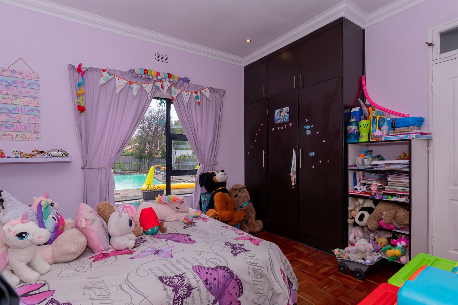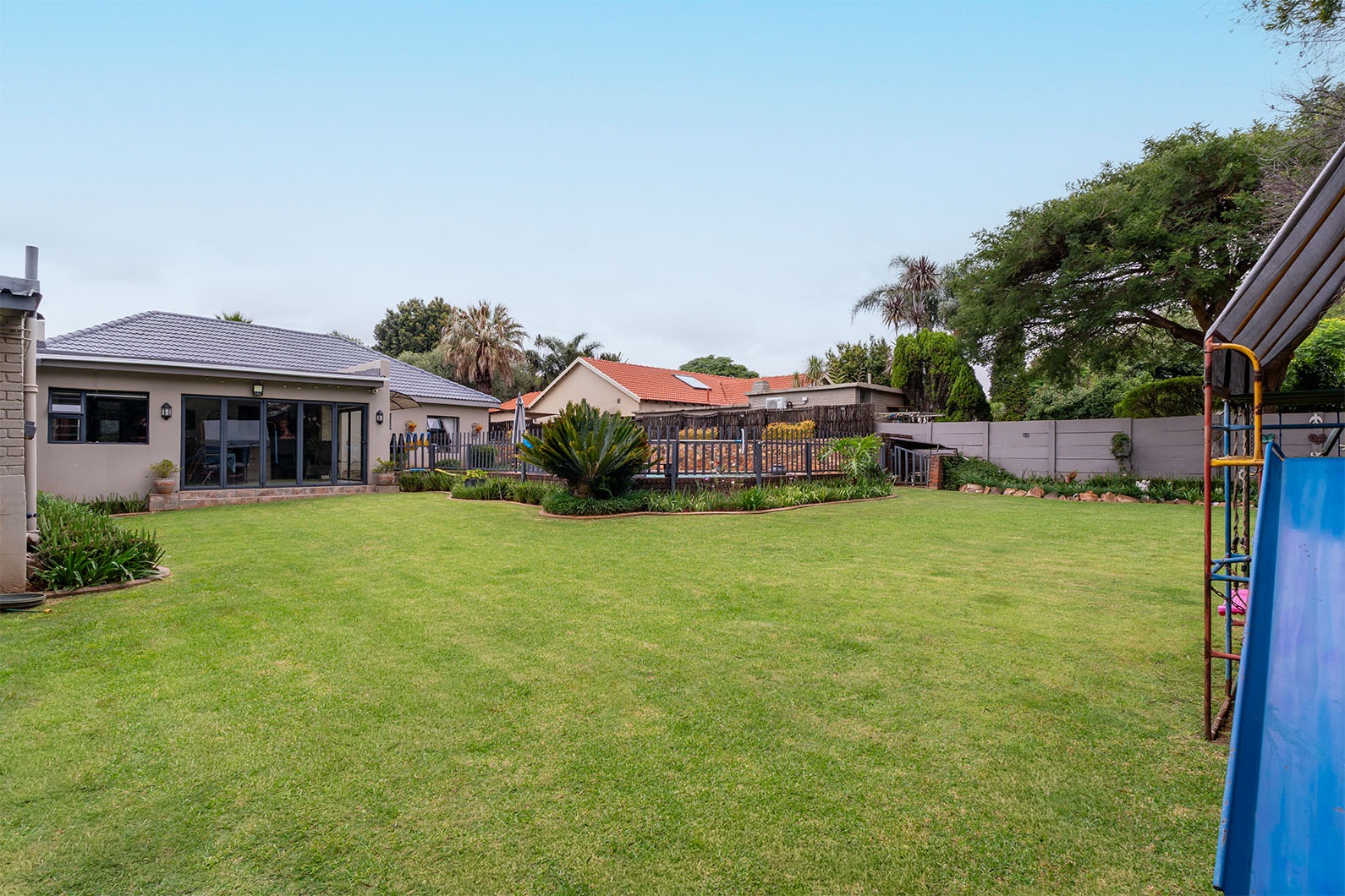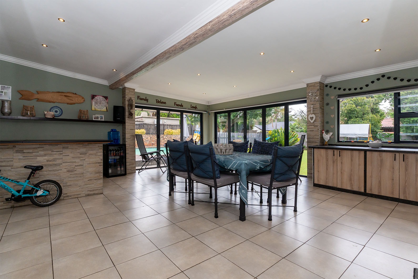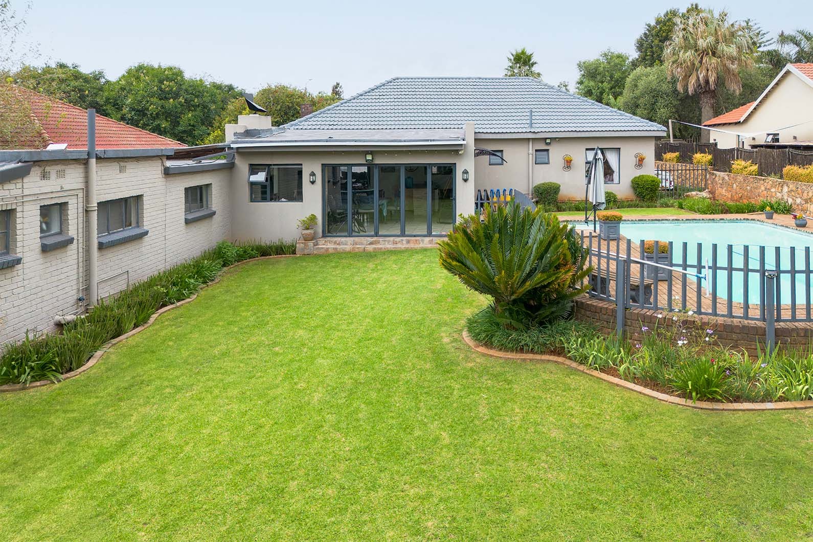 The exterior of the property is an entertainer's delight, set on a generous 991 sqm erf. A built-on entertainment area boasts a built-in braai and a stylish bar, complete with stackable doors that facilitate seamless indoor-outdoor living. This space is perfect for year-round gatherings, overlooking the established garden and sparkling swimming pool.