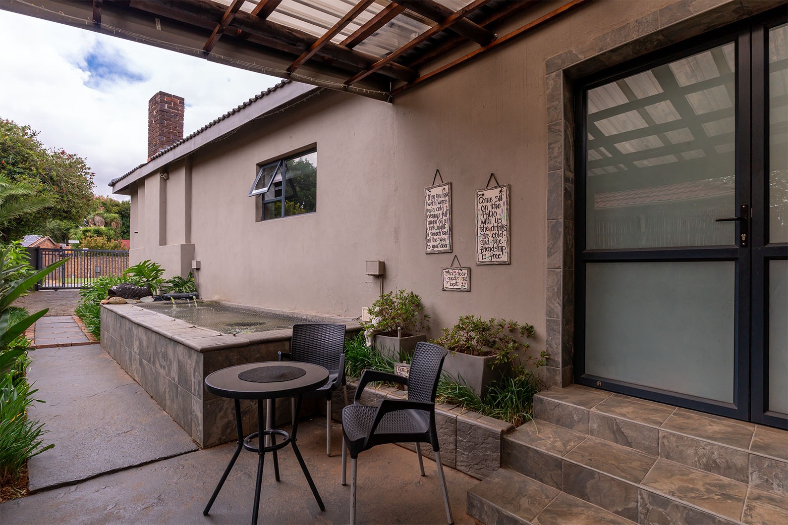 The exterior of the property is an entertainer's delight, set on a generous 991 sqm erf. A built-on entertainment area boasts a built-in braai and a stylish bar, complete with stackable doors that facilitate seamless indoor-outdoor living. This space is perfect for year-round gatherings, overlooking the established garden and sparkling swimming pool.