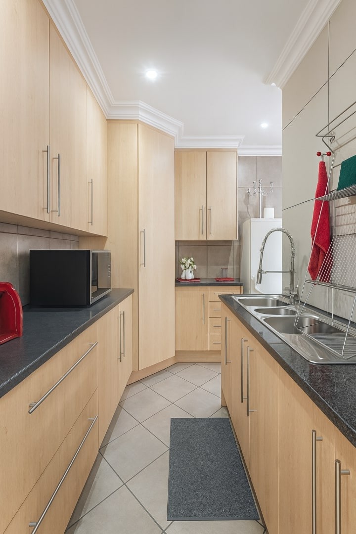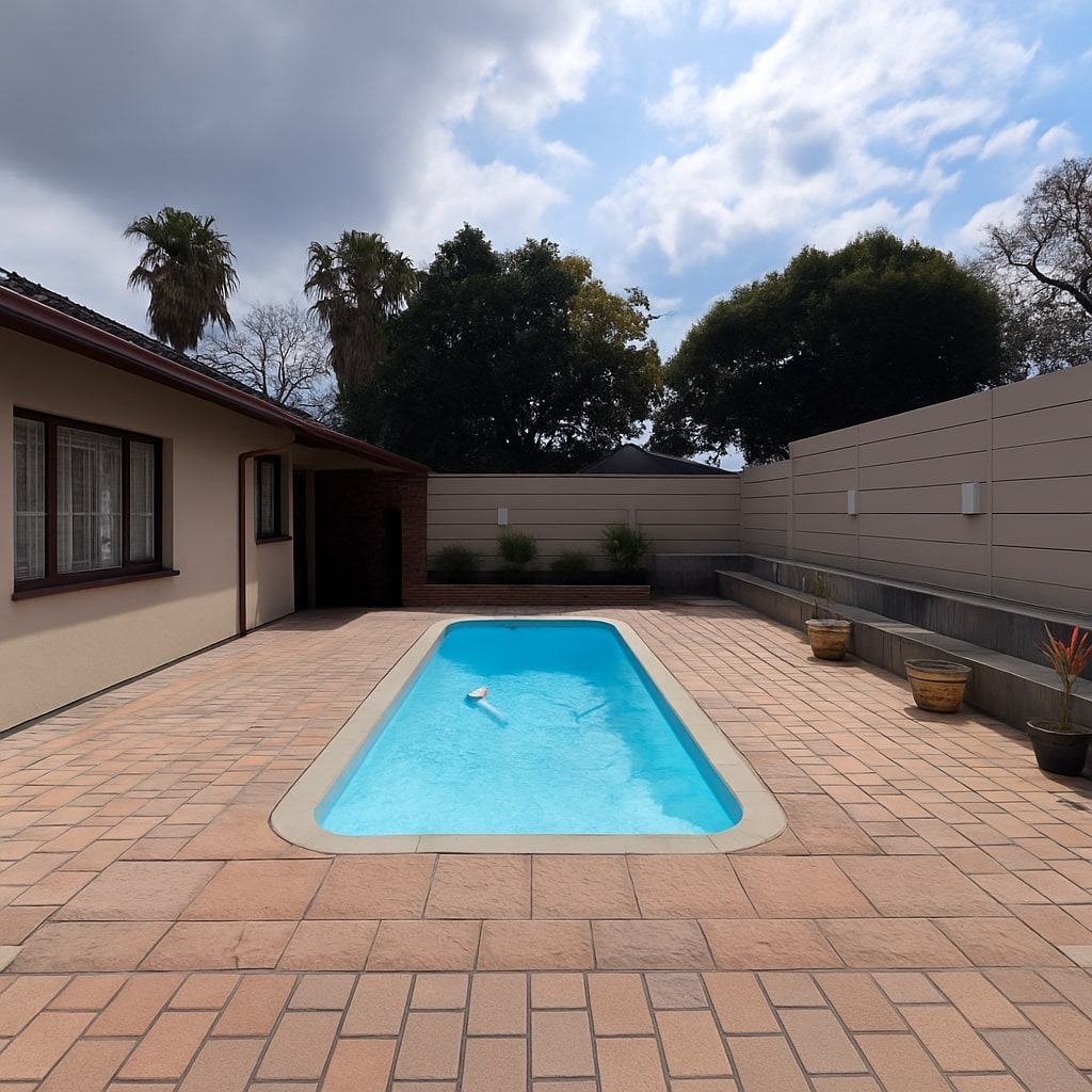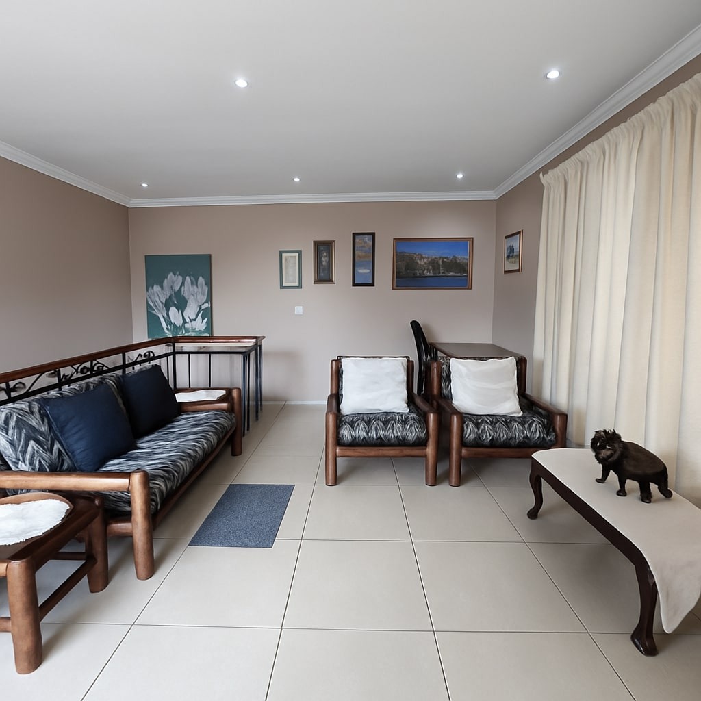 Set on a substantial 1481 sqm erf, the outdoor area is designed for relaxation and entertainment, featuring a private garden and a refreshing swimming pool. A built-in braai is perfect for hosting gatherings with family and friends. Security is paramount, with the home situated in a gated community and further secured by an alarm system, electric fencing, and a totally walled perimeter. Modern connectivity is assured with fibre readiness.