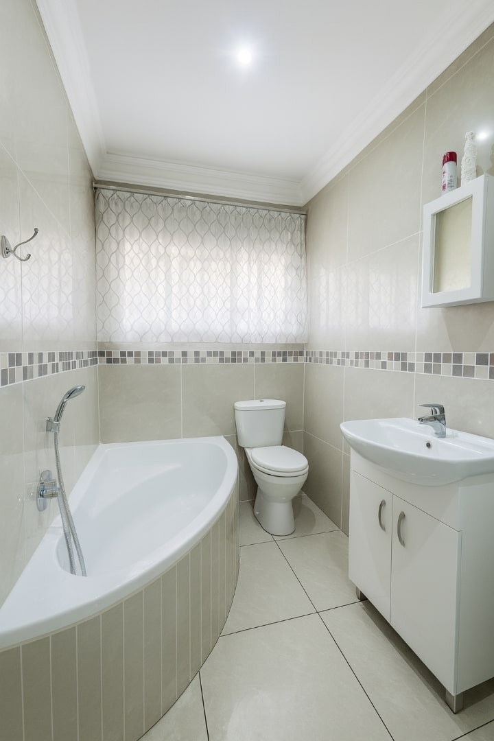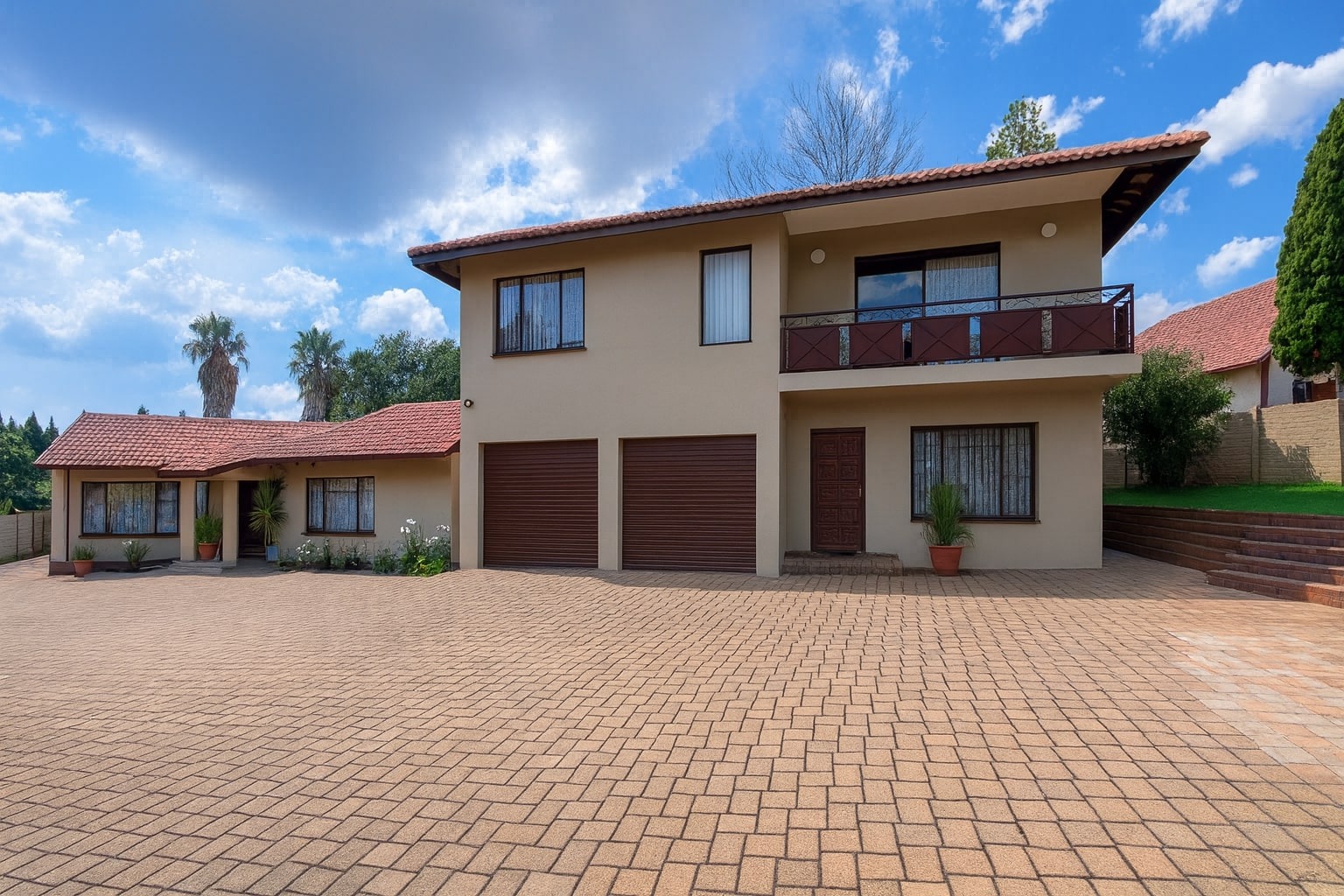 Discover this expansive six-bedroom family residence nestled within a secure gated community in Marais Steyn Park, Edenvale. Boasting an impressive kerb appeal, the property features a well-maintained exterior with a traditional tiled roof, neutral stucco, and an upper-level balcony. A large paved driveway leads to a double garage, complemented by three additional parking bays. The attached single-story wing presents an excellent opportunity for a private flatlet or versatile extended living space, enhancing the home's functionality.