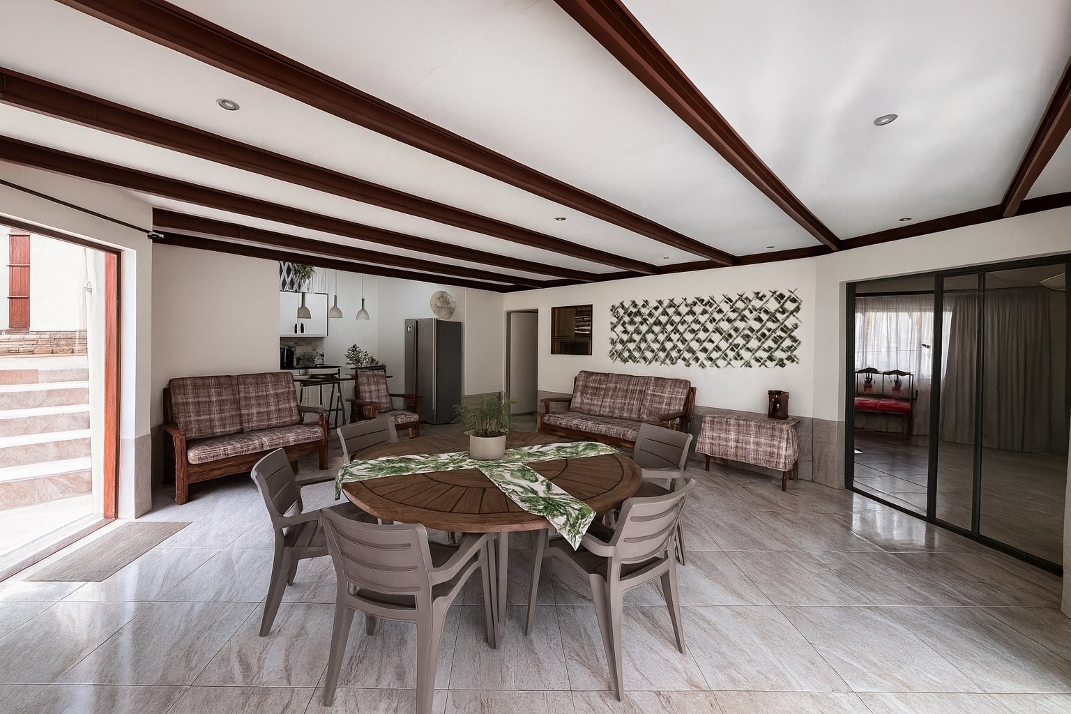The interior offers a flexible layout with two distinct lounges and two dining rooms, catering to diverse family needs. The heart of the home comprises two modern kitchens, each equipped with light wood or white cabinetry, dark countertops, and breakfast bars, with one featuring a gas range. Open-plan living areas are adorned with tiled flooring, recessed lighting, and crown molding, creating a bright and inviting atmosphere. Exposed wooden beams add character, while sliding doors seamlessly connect indoor spaces to the outdoors.