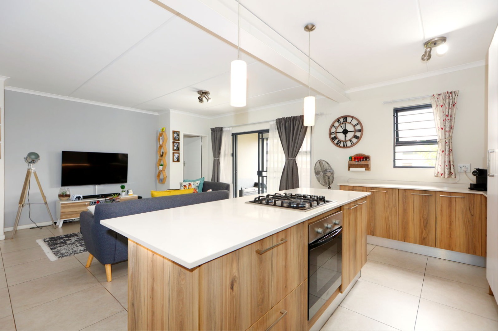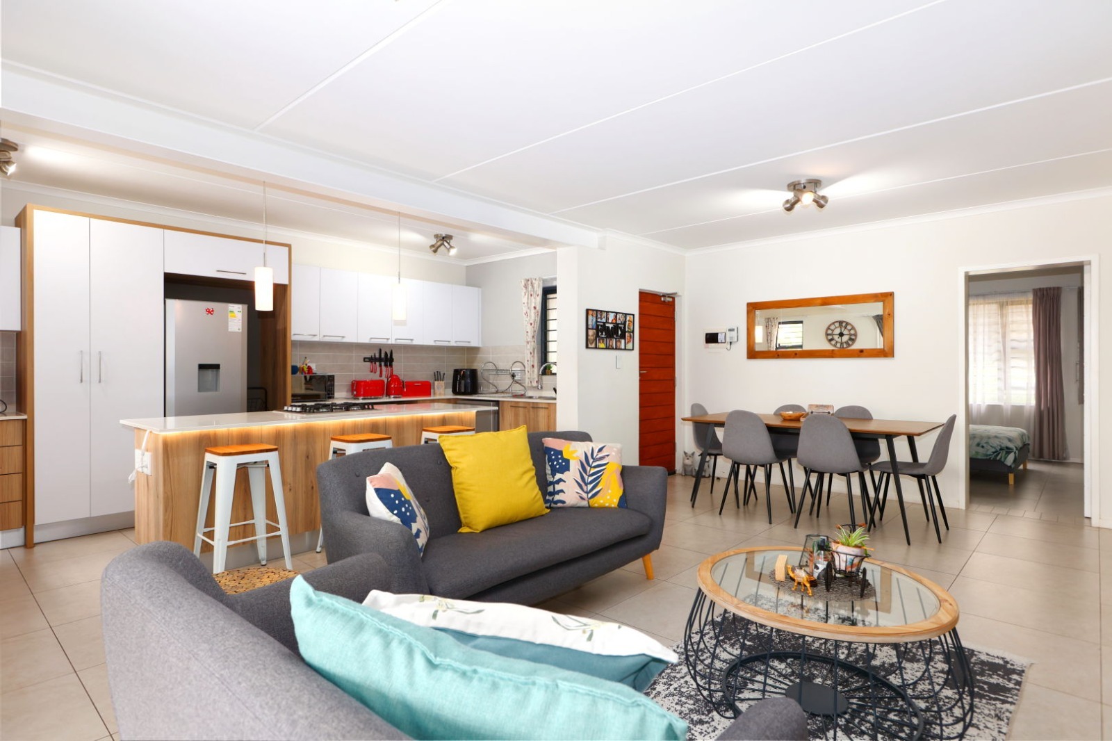 The home features a spacious open-plan layout, seamlessly combining the kitchen, dining, and TV/family area. This inviting living space flows effortlessly onto a private patio, overlooking a lush, green garden, ideal for relaxing or entertaining guests.