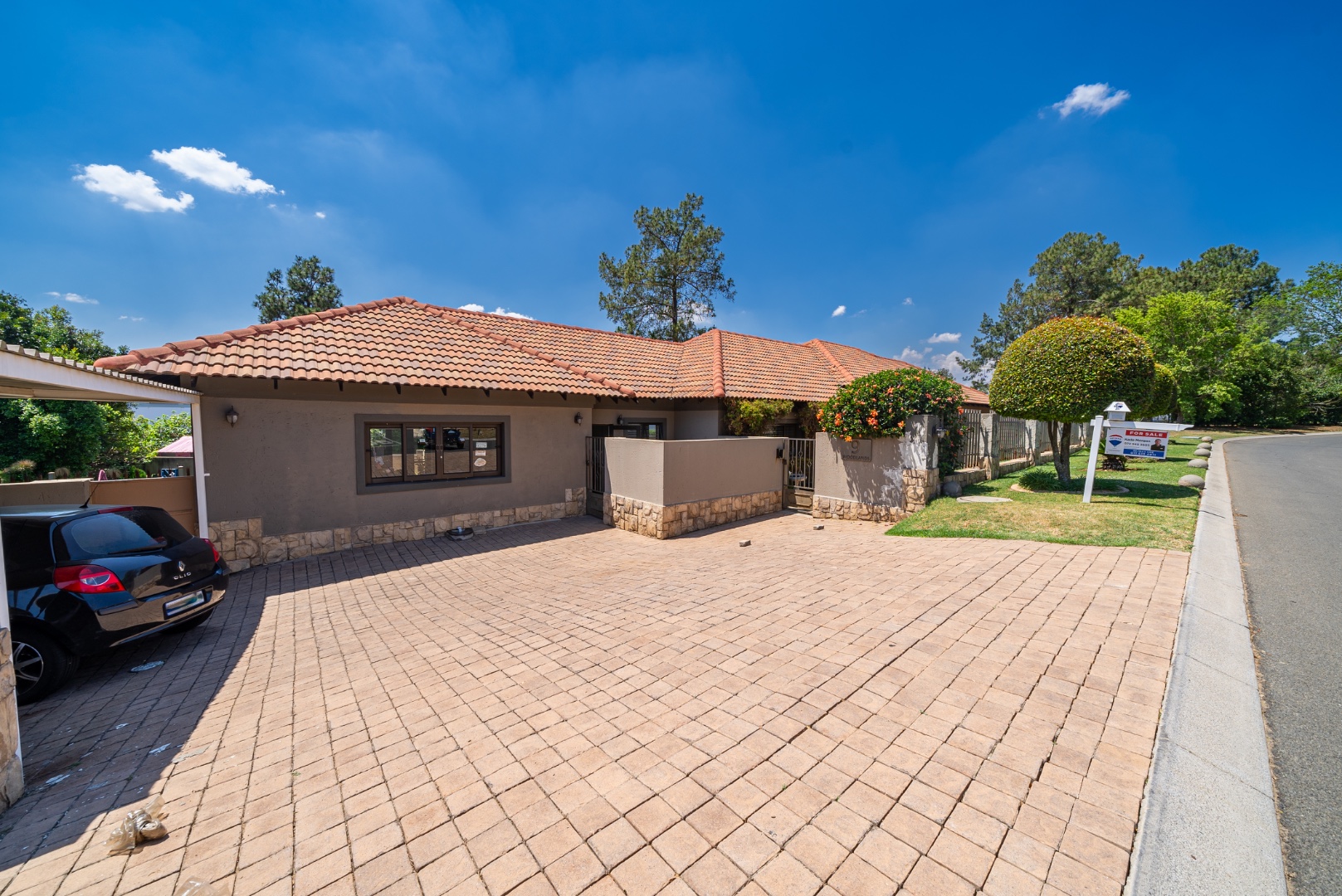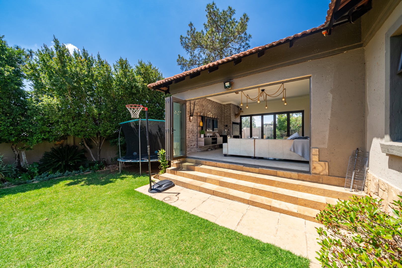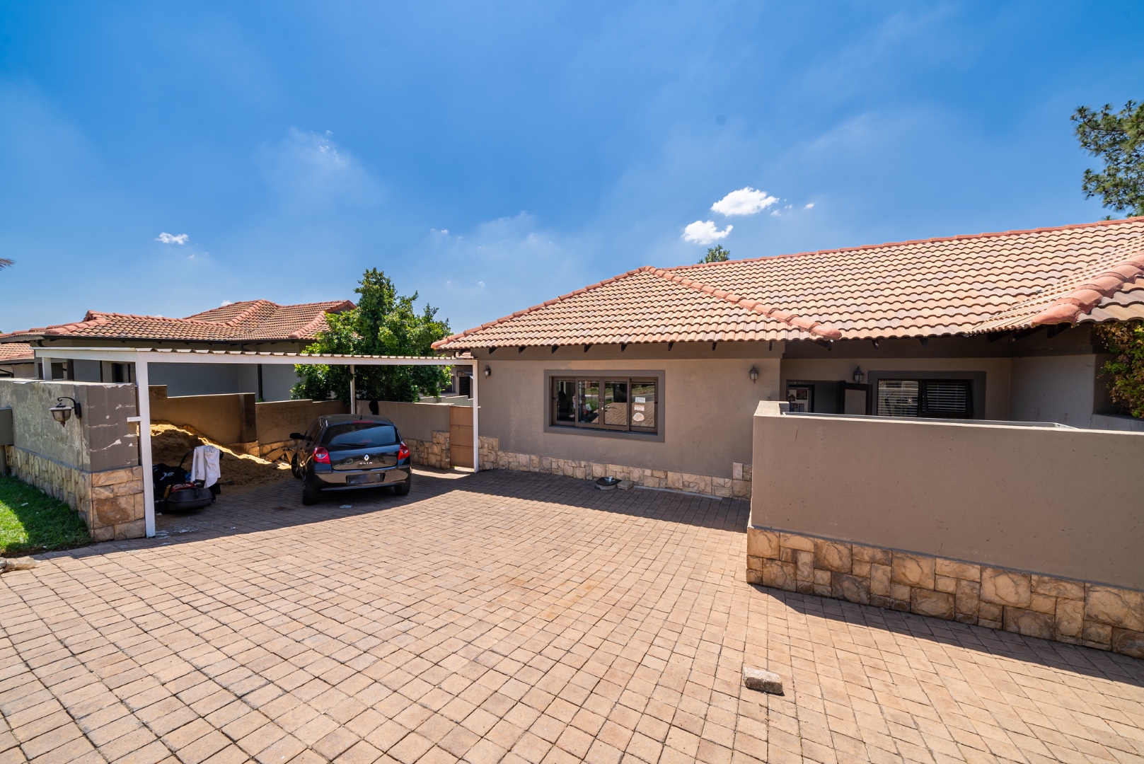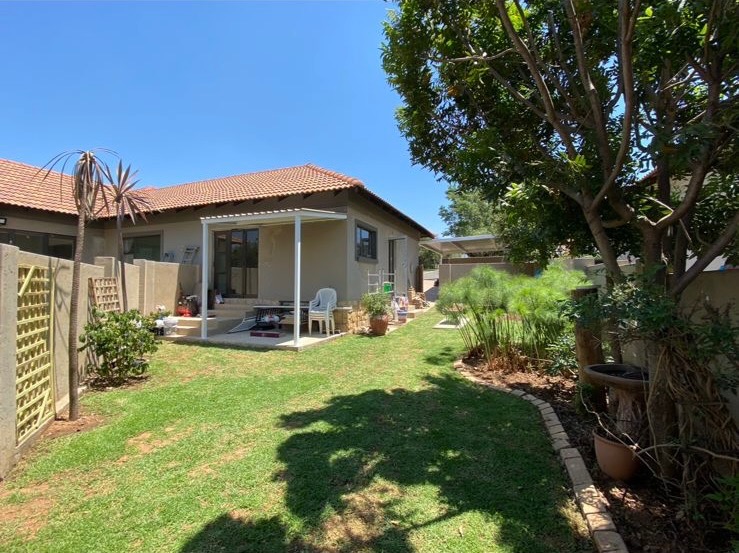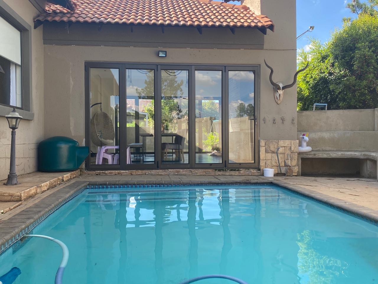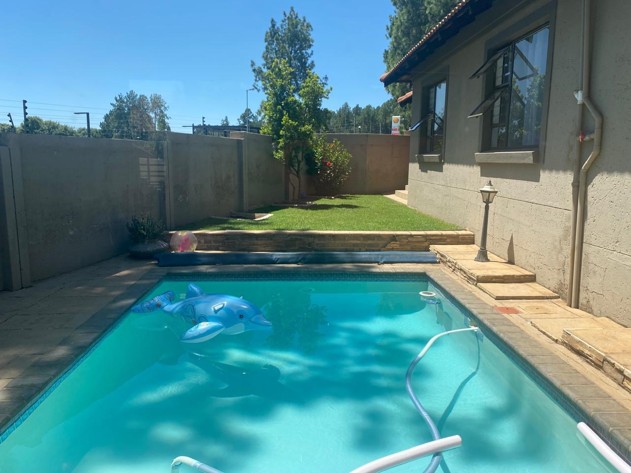 Outdoor living is a delight with a private swimming pool, perfect for enjoying South African summers. The property includes a garden and paving, complemented by a built-in braai for all seasons and entertaining. Parking has three dedicated parking spaces.
