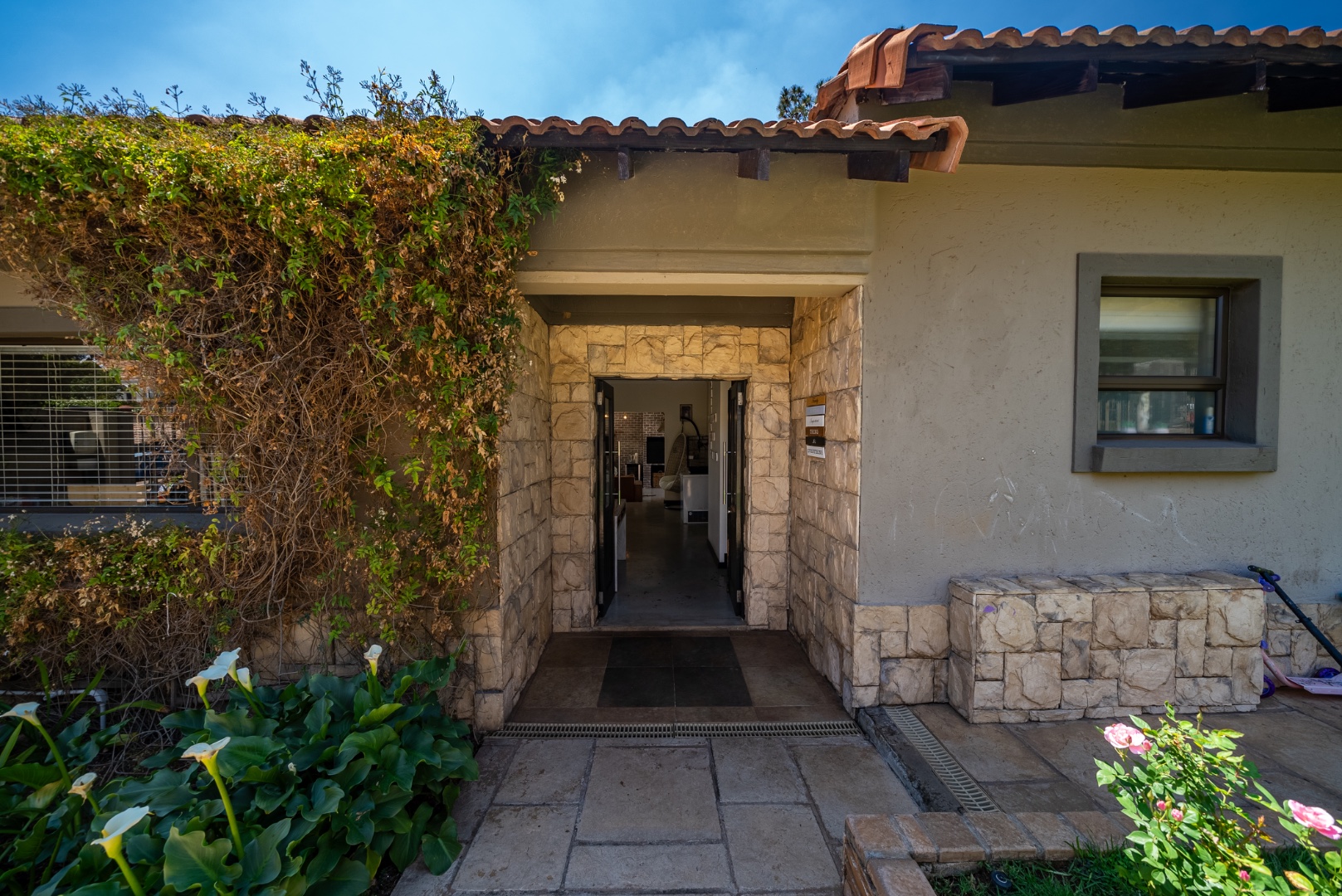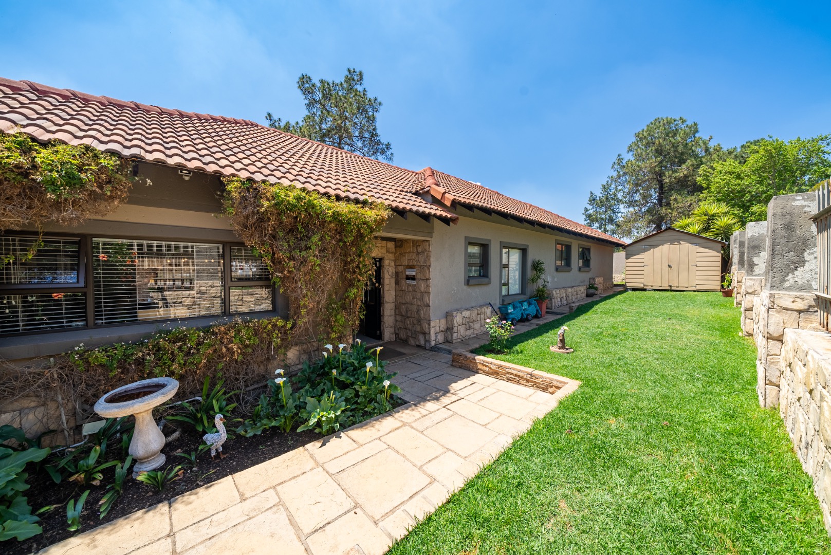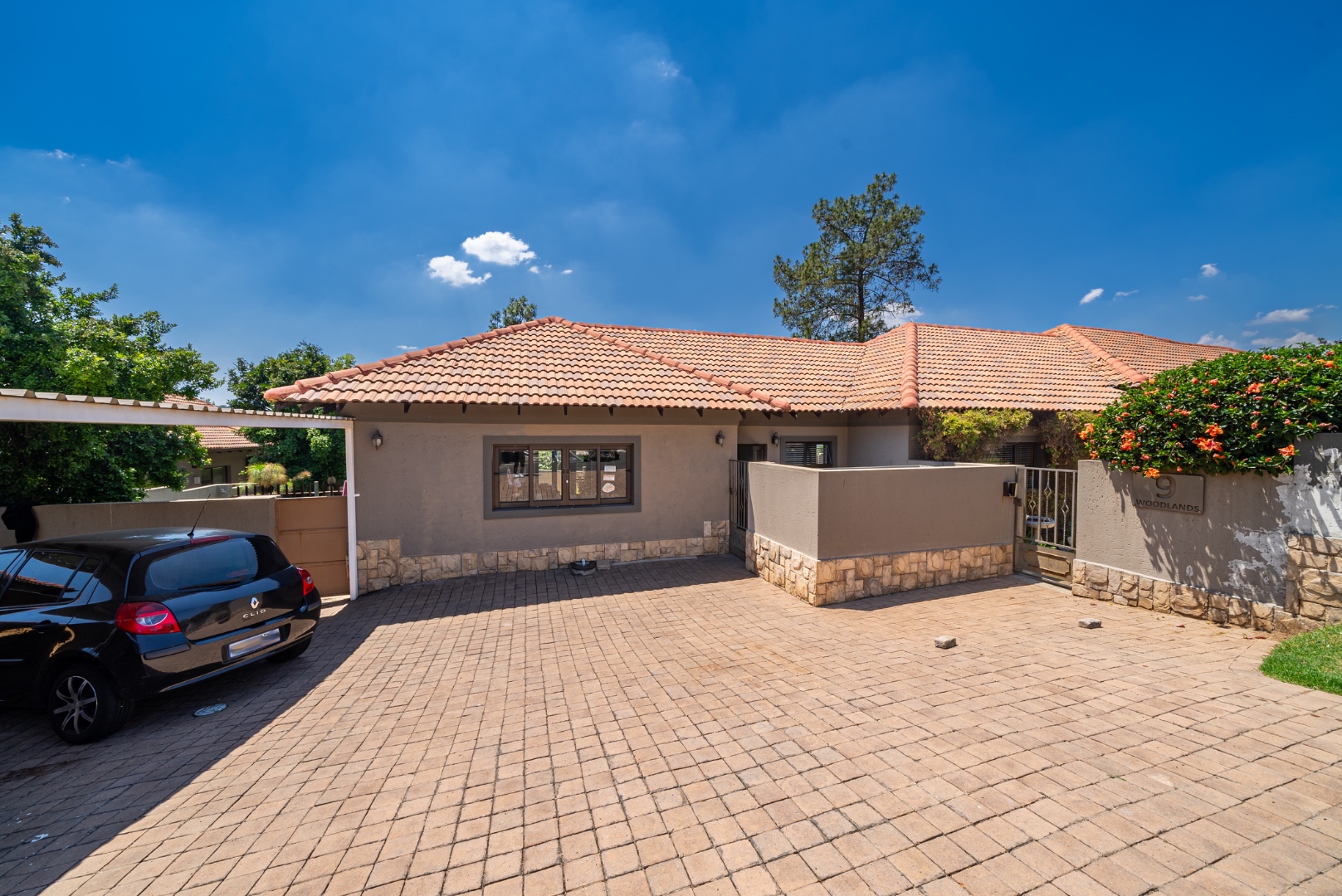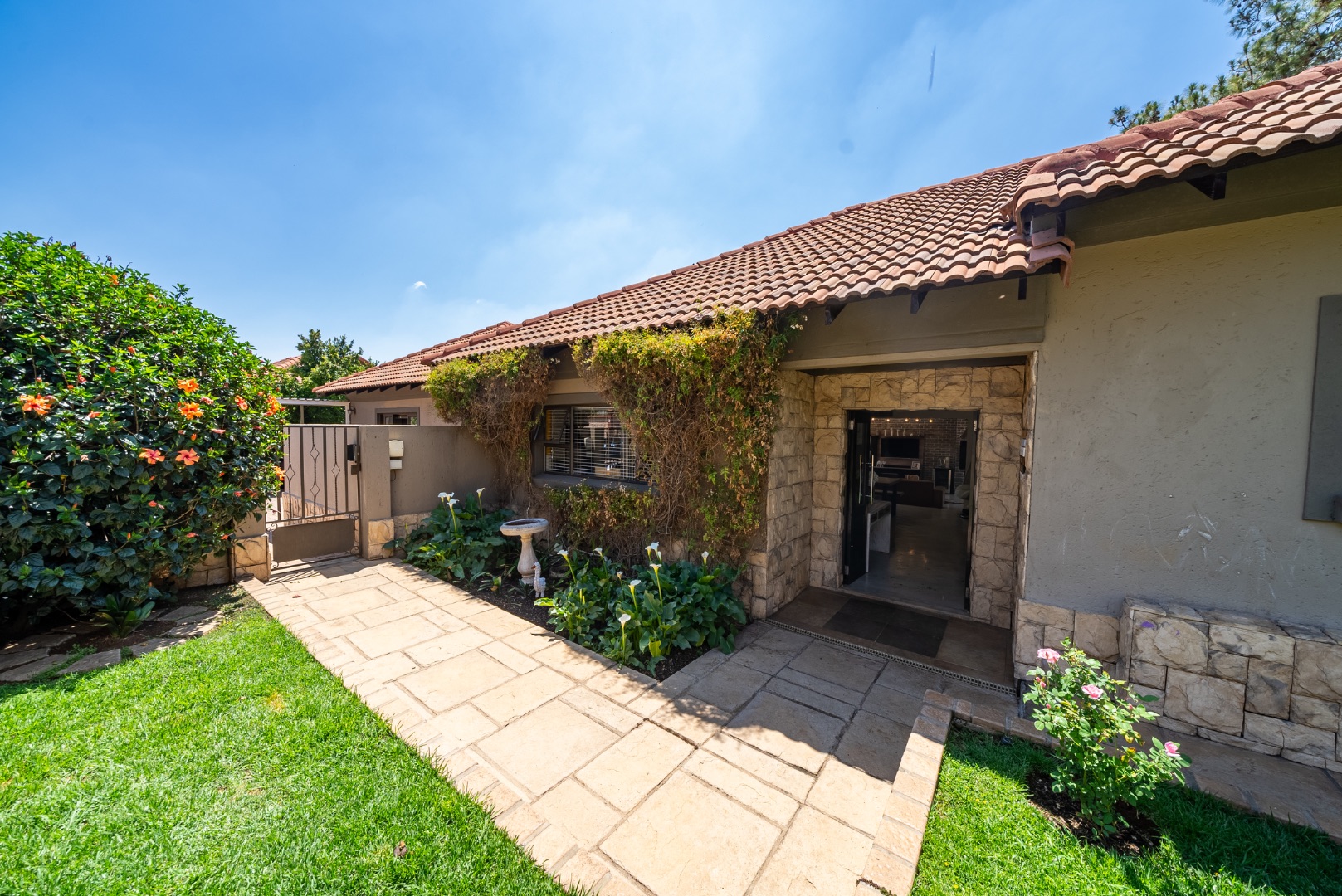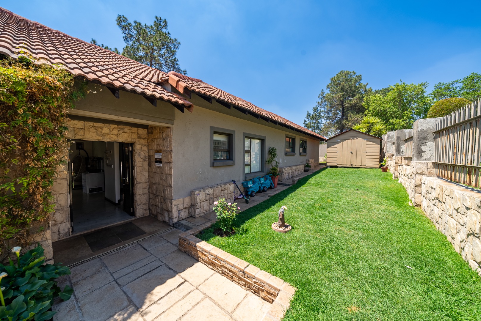 Outdoor living is a delight with a private swimming pool, perfect for enjoying South African summers. The property includes a garden and paving, complemented by a built-in braai for all seasons and entertaining. Parking has three dedicated parking spaces.