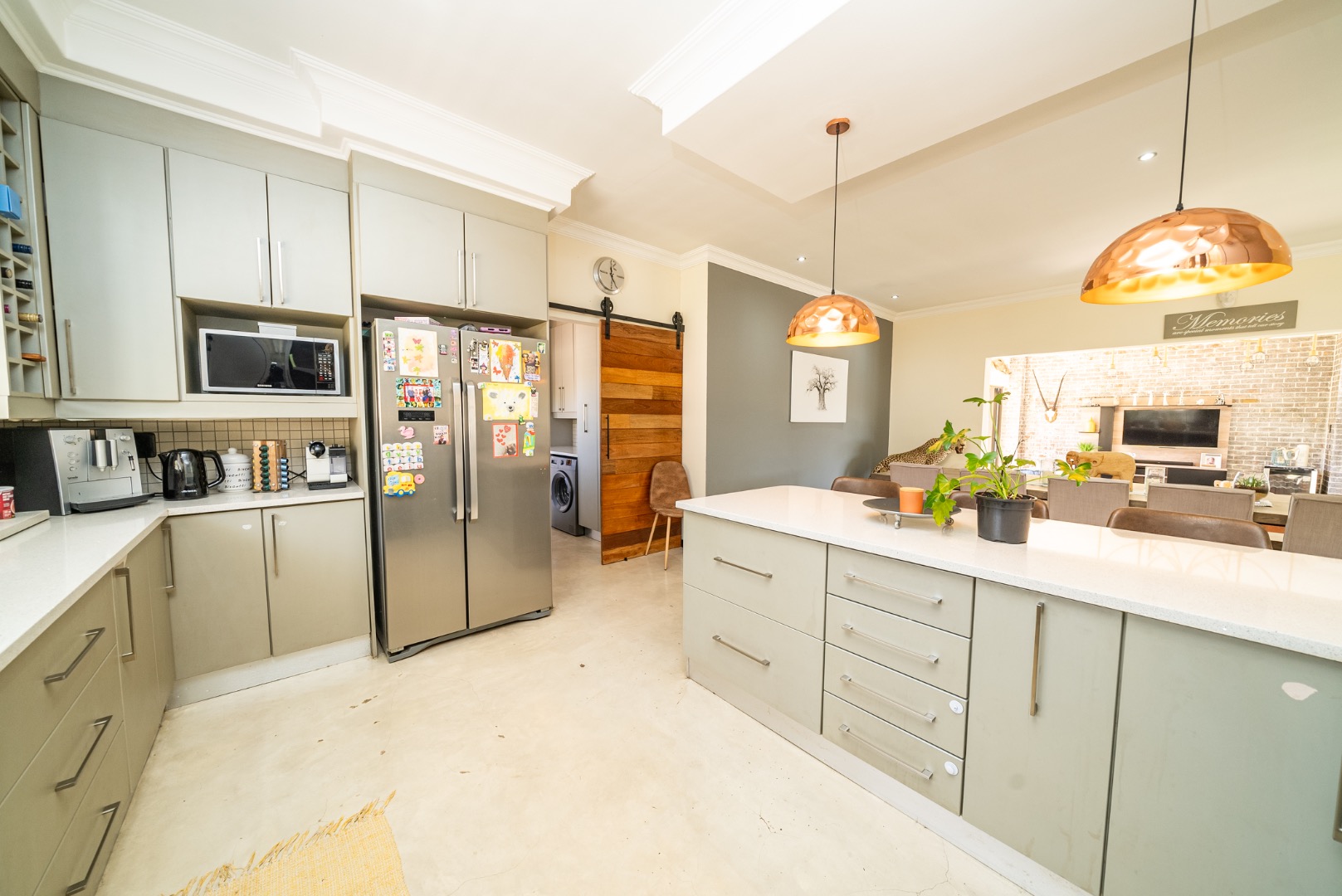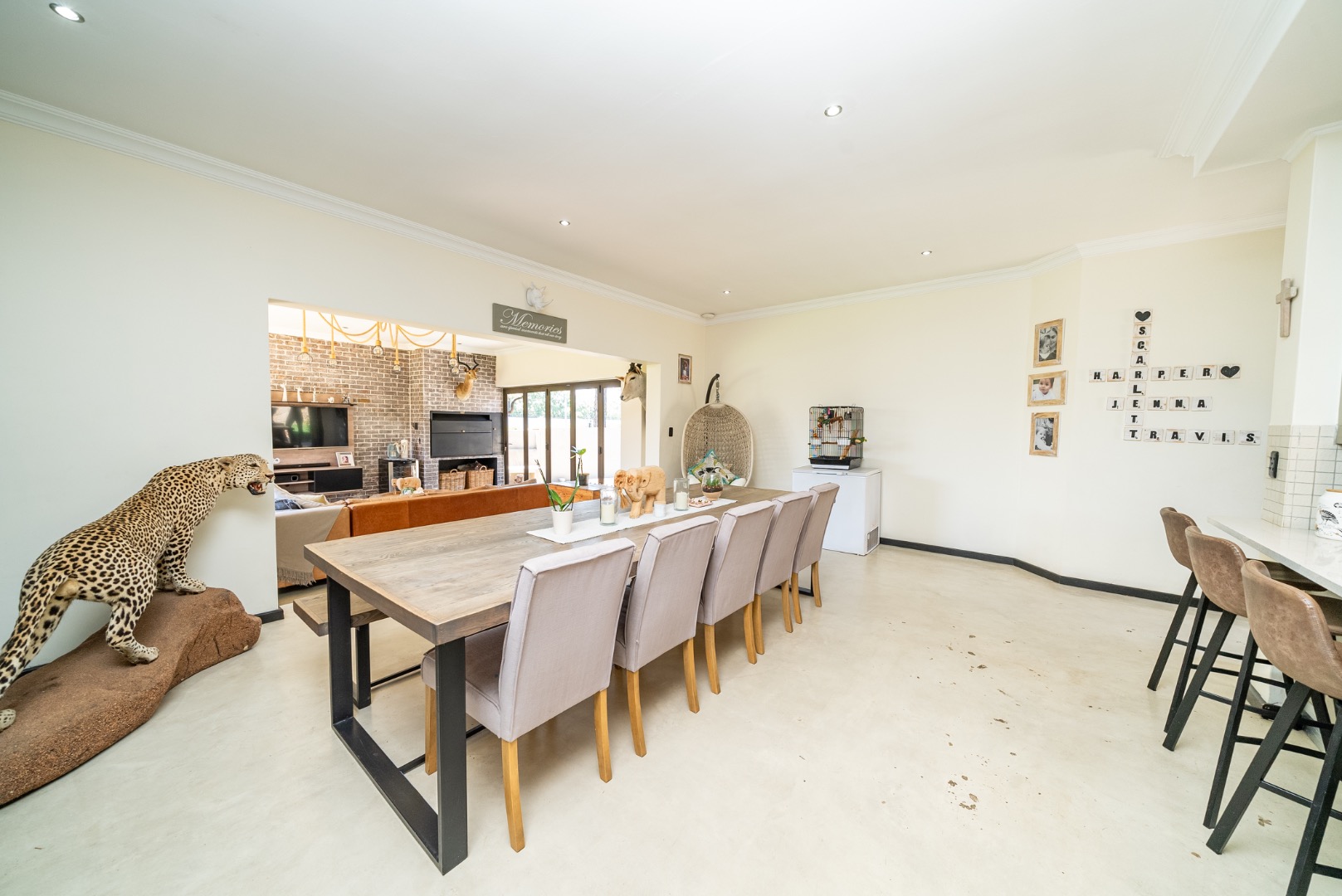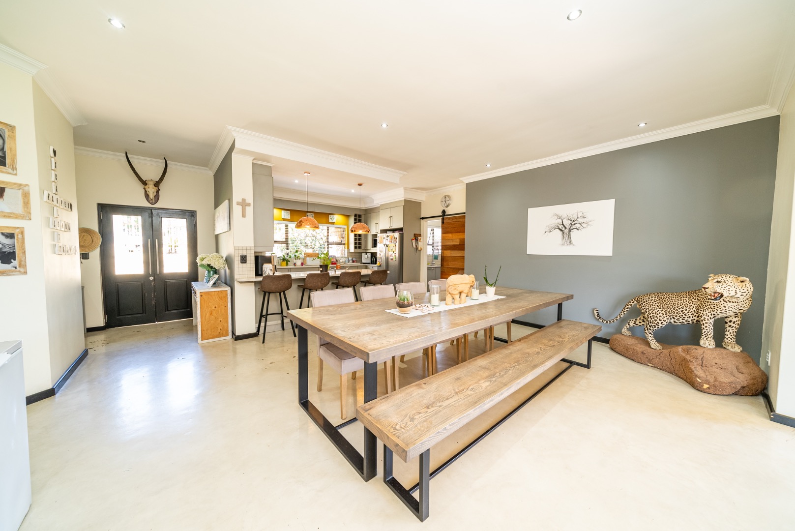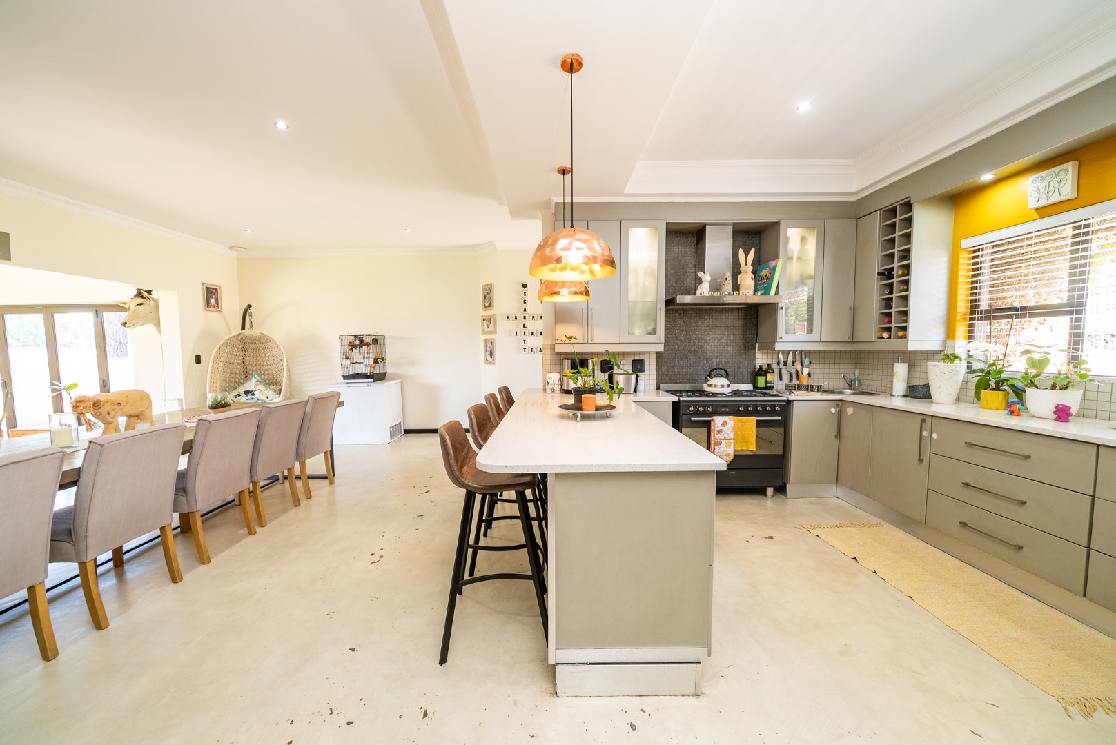 The interior features an inviting open-plan design, seamlessly connecting living spaces. With two lounges and a dedicated dining room, there is abundant room for both relaxation and formal gatherings. The property benefits from two kitchens, both showcasing modern two-tone cabinetry and ample natural light, providing excellent functionality and style for diverse culinary needs. Sliding doors enhance the flow and connect indoor areas with the outdoors.