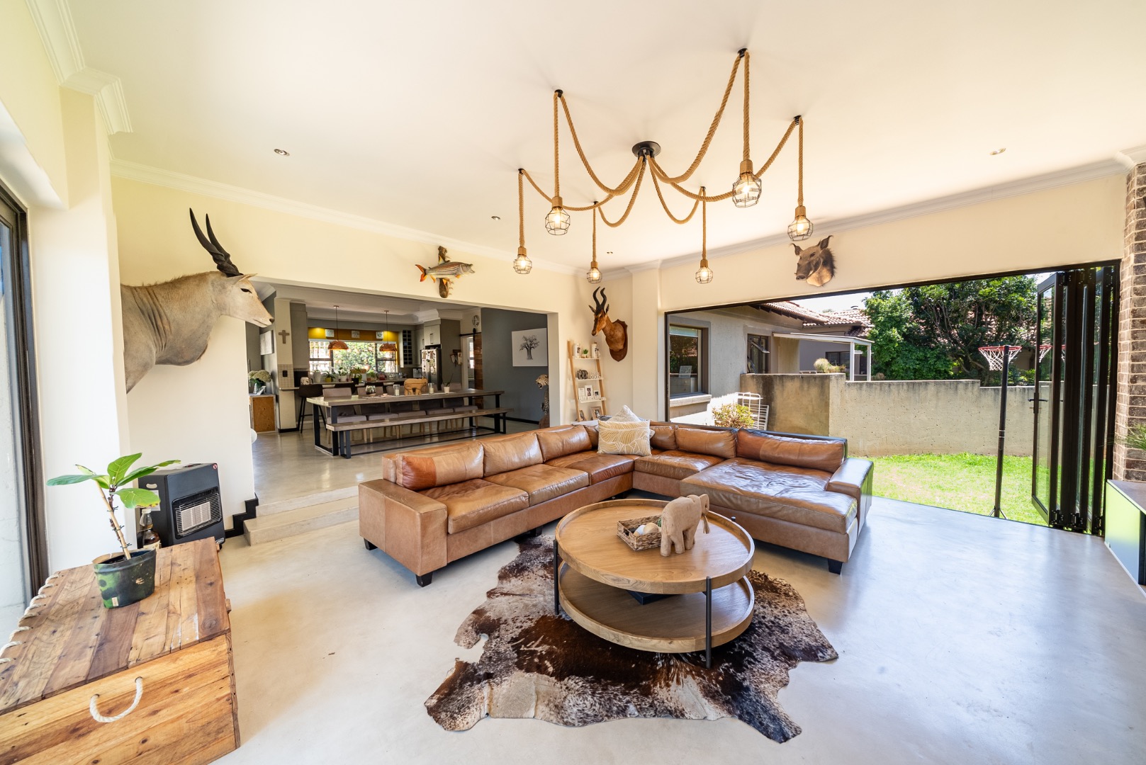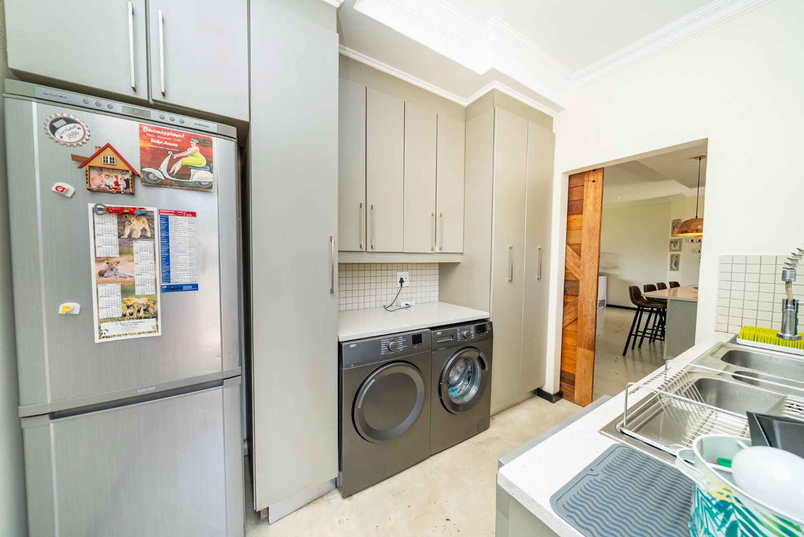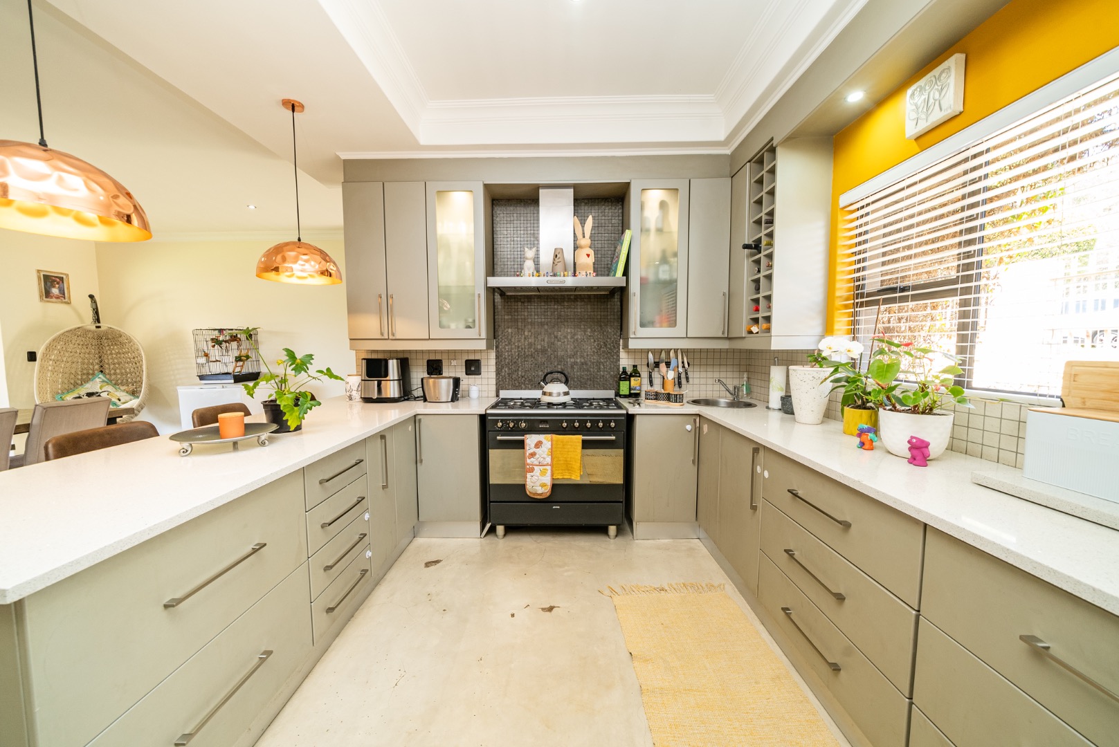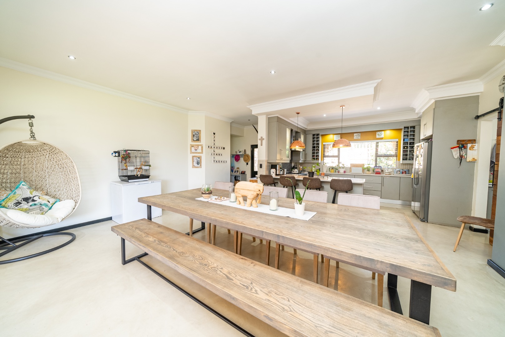 The interior features an inviting open-plan design, seamlessly connecting living spaces. With two lounges and a dedicated dining room, there is abundant room for both relaxation and formal gatherings. The property benefits from two kitchens, both showcasing modern two-tone cabinetry and ample natural light, providing excellent functionality and style for diverse culinary needs. Sliding doors enhance the flow and connect indoor areas with the outdoors.