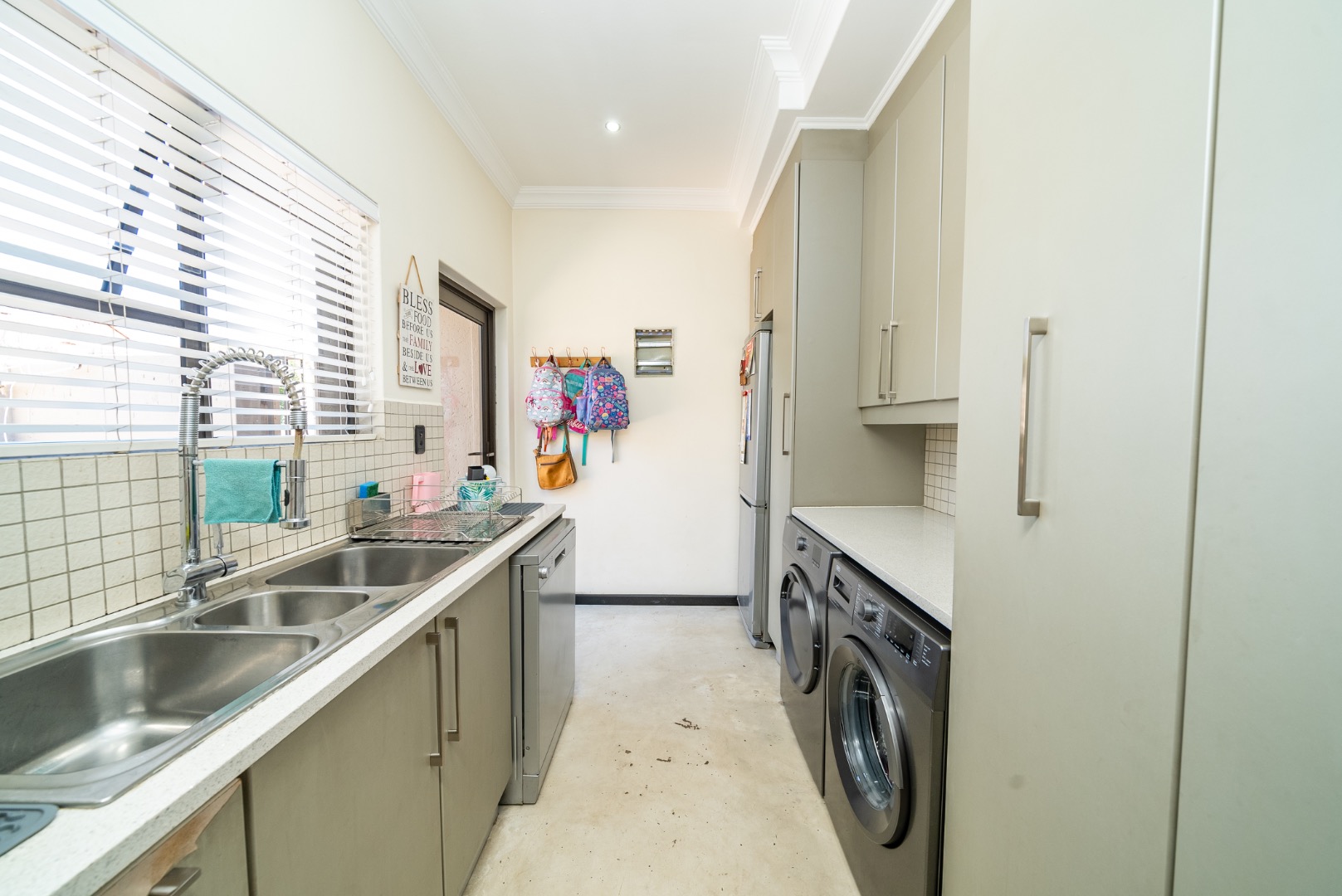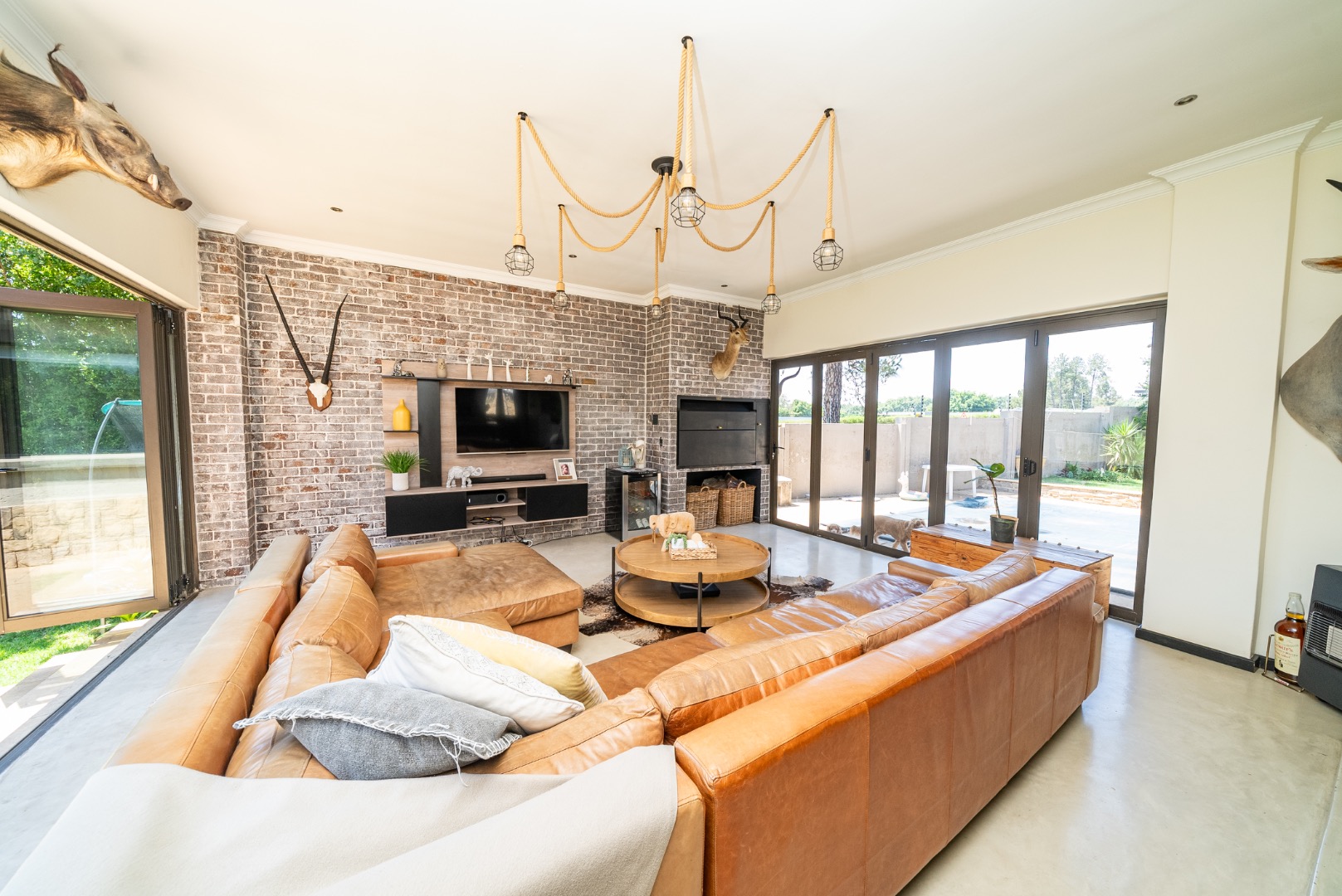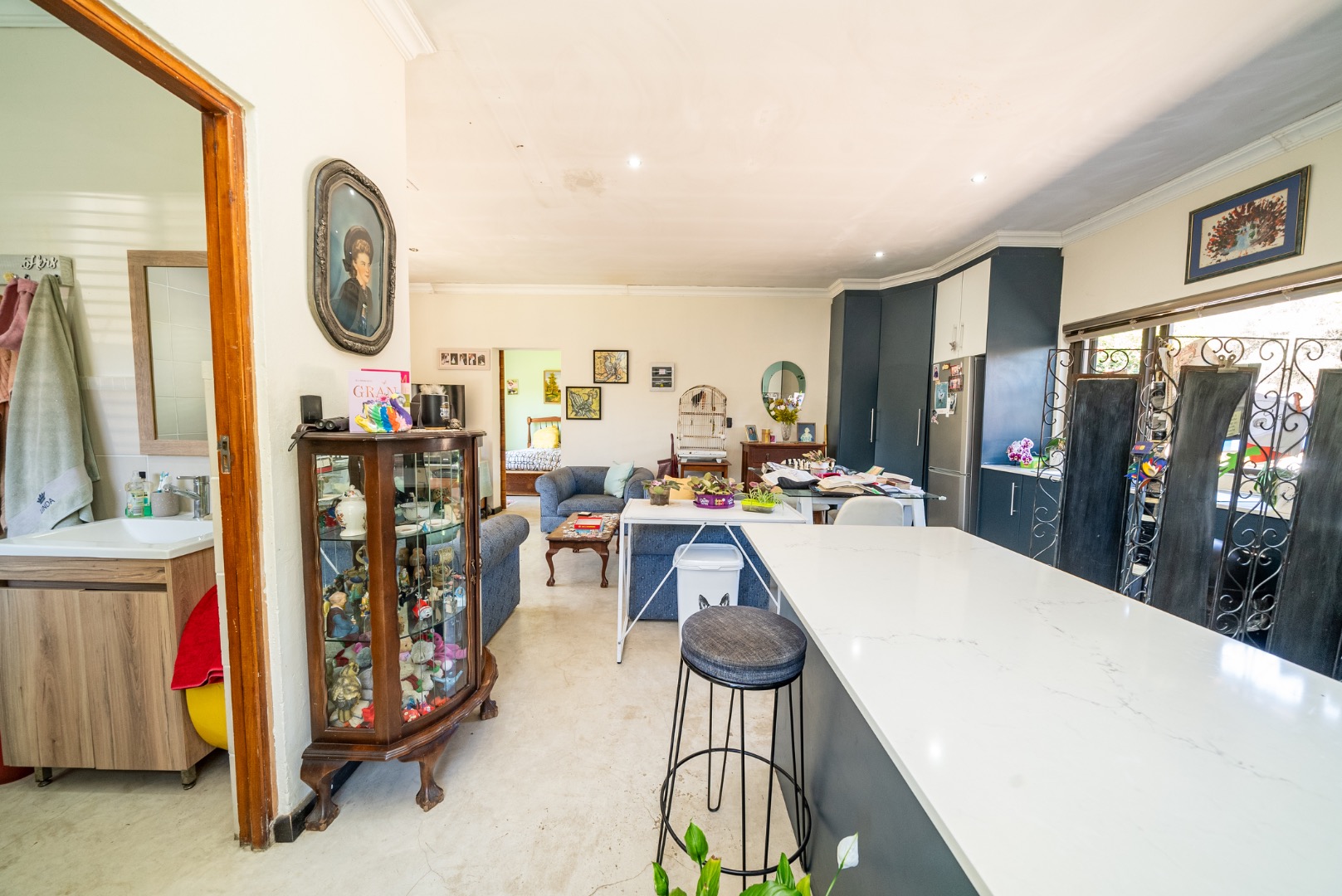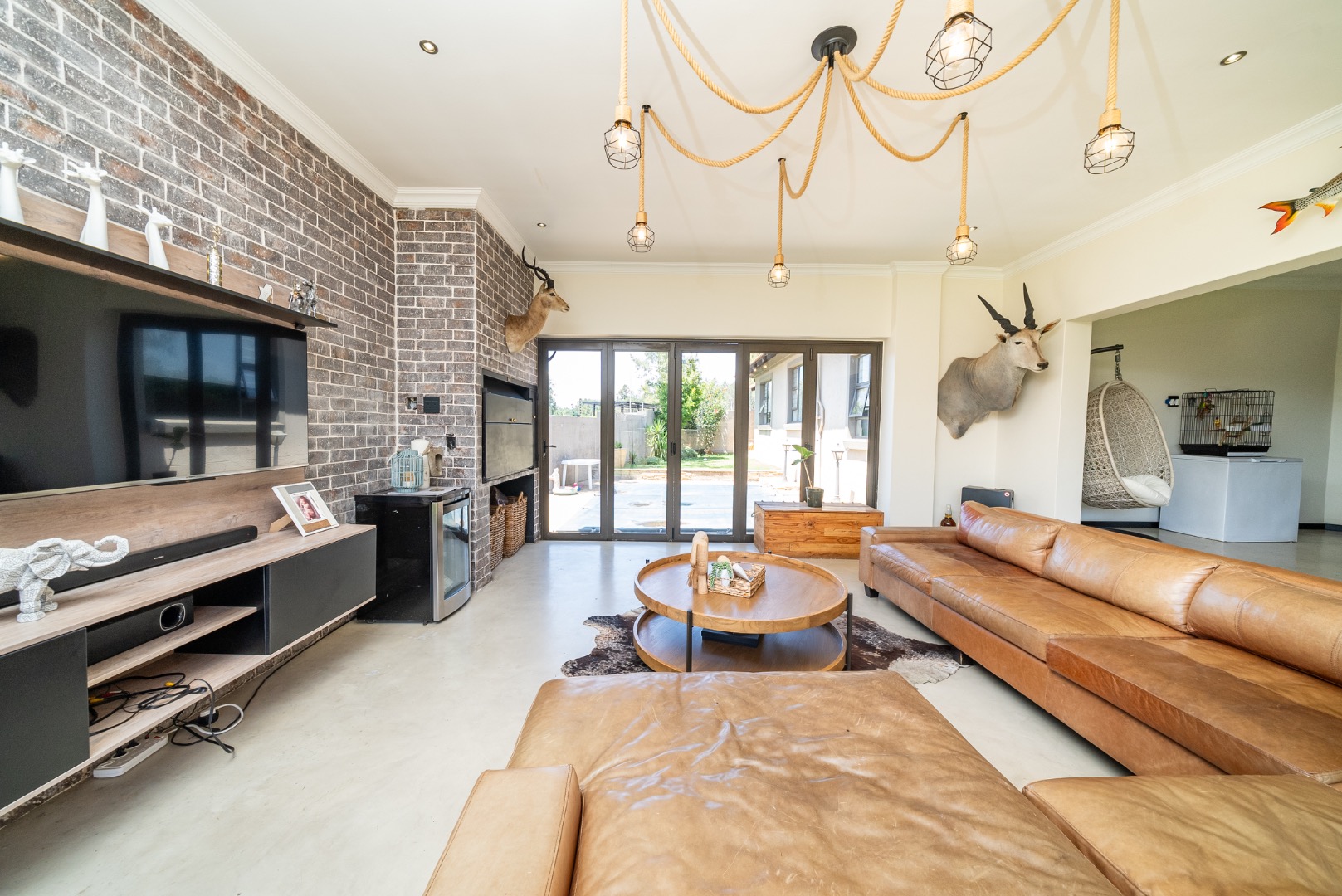 The interior features an inviting open-plan design, seamlessly connecting living spaces. With two lounges and a dedicated dining room, there is abundant room for both relaxation and formal gatherings. The property benefits from two kitchens, both showcasing modern two-tone cabinetry and ample natural light, providing excellent functionality and style for diverse culinary needs. Sliding doors enhance the flow and connect indoor areas with the outdoors.