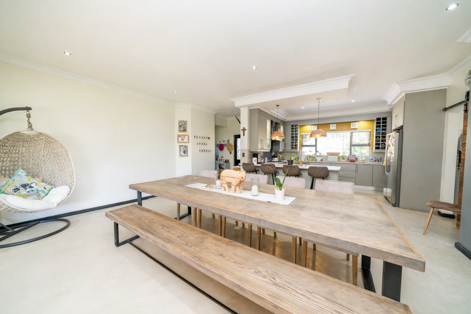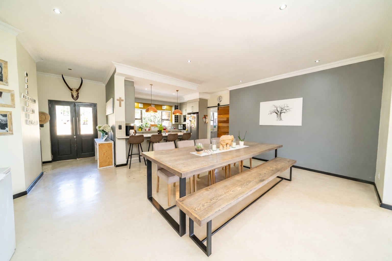 The interior features an inviting open-plan design, seamlessly connecting living spaces. With two lounges and a dedicated dining room, there is abundant room for both relaxation and formal gatherings. The property benefits from two kitchens, both showcasing modern two-tone cabinetry and ample natural light, providing excellent functionality and style for diverse culinary needs. Sliding doors enhance the flow and connect indoor areas with the outdoors.