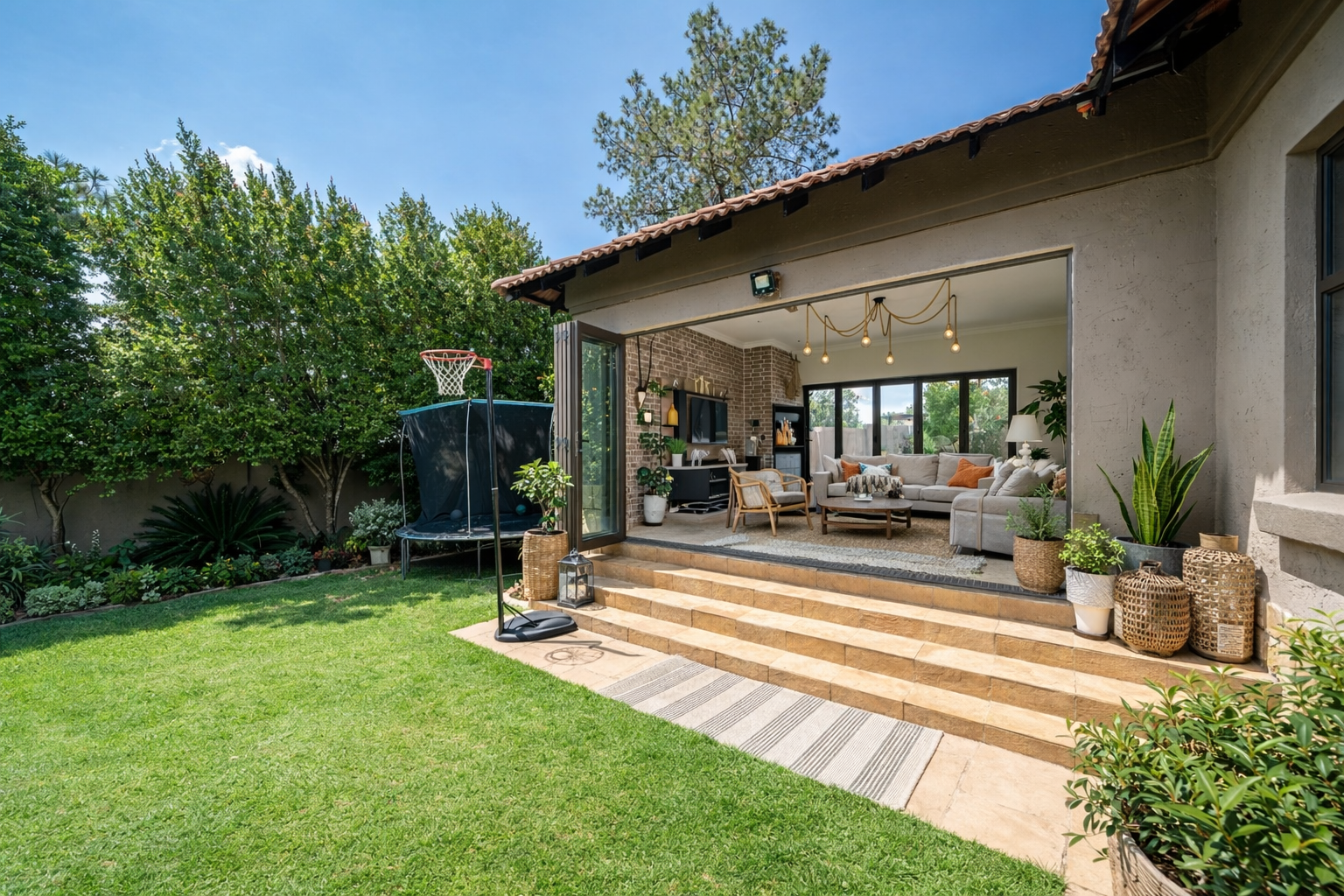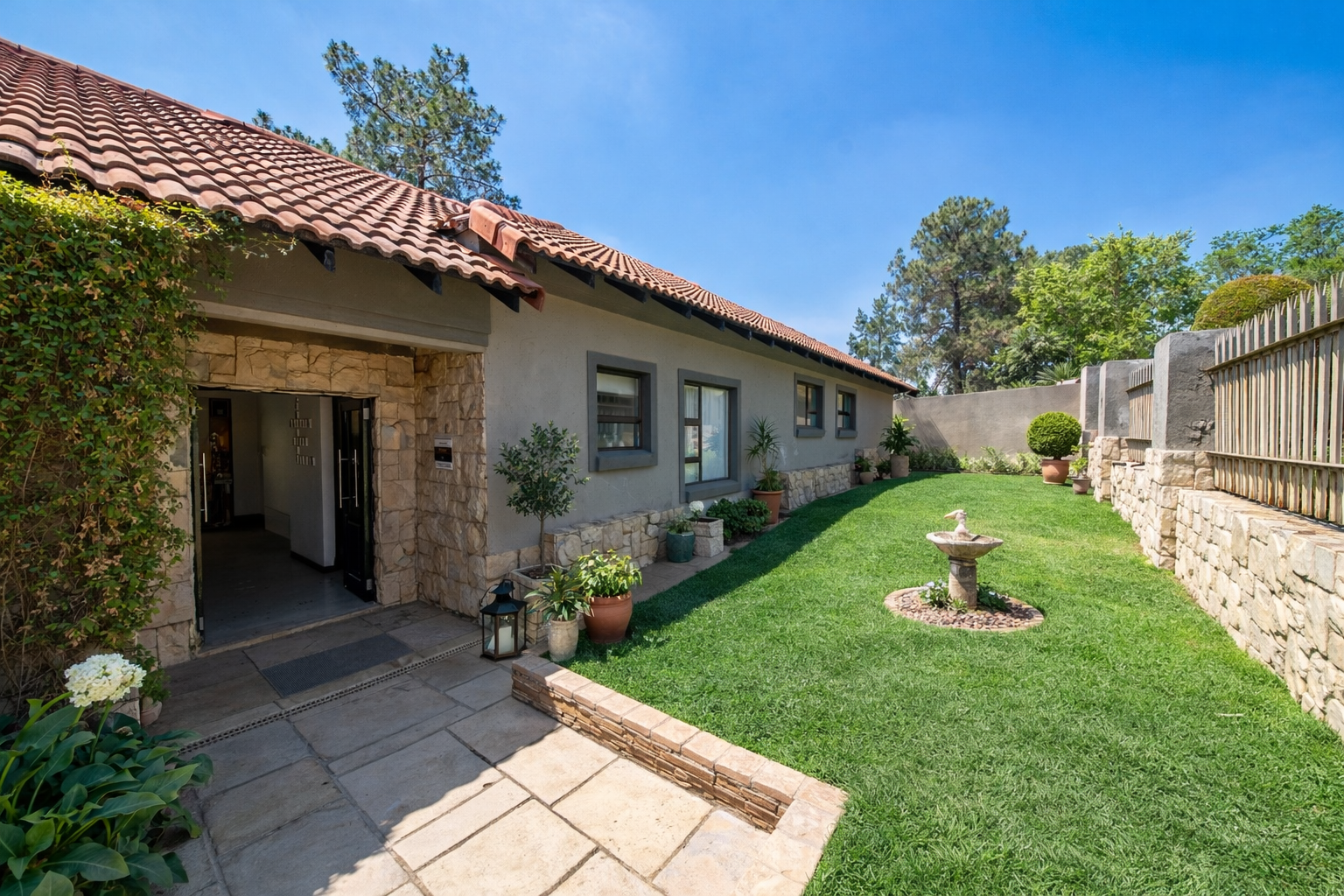 Outdoor living is a delight with a private swimming pool, perfect for enjoying South African summers. The property includes a garden and paving, complemented by a built-in braai for all seasons and entertaining. Parking has three dedicated parking spaces.