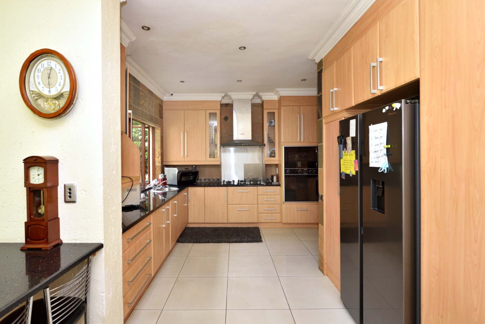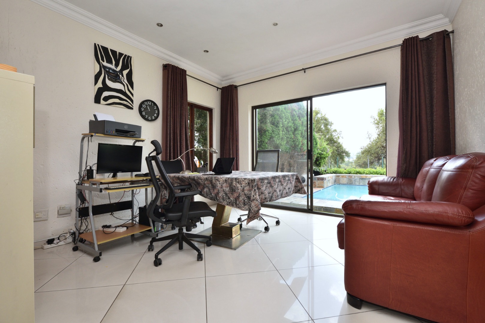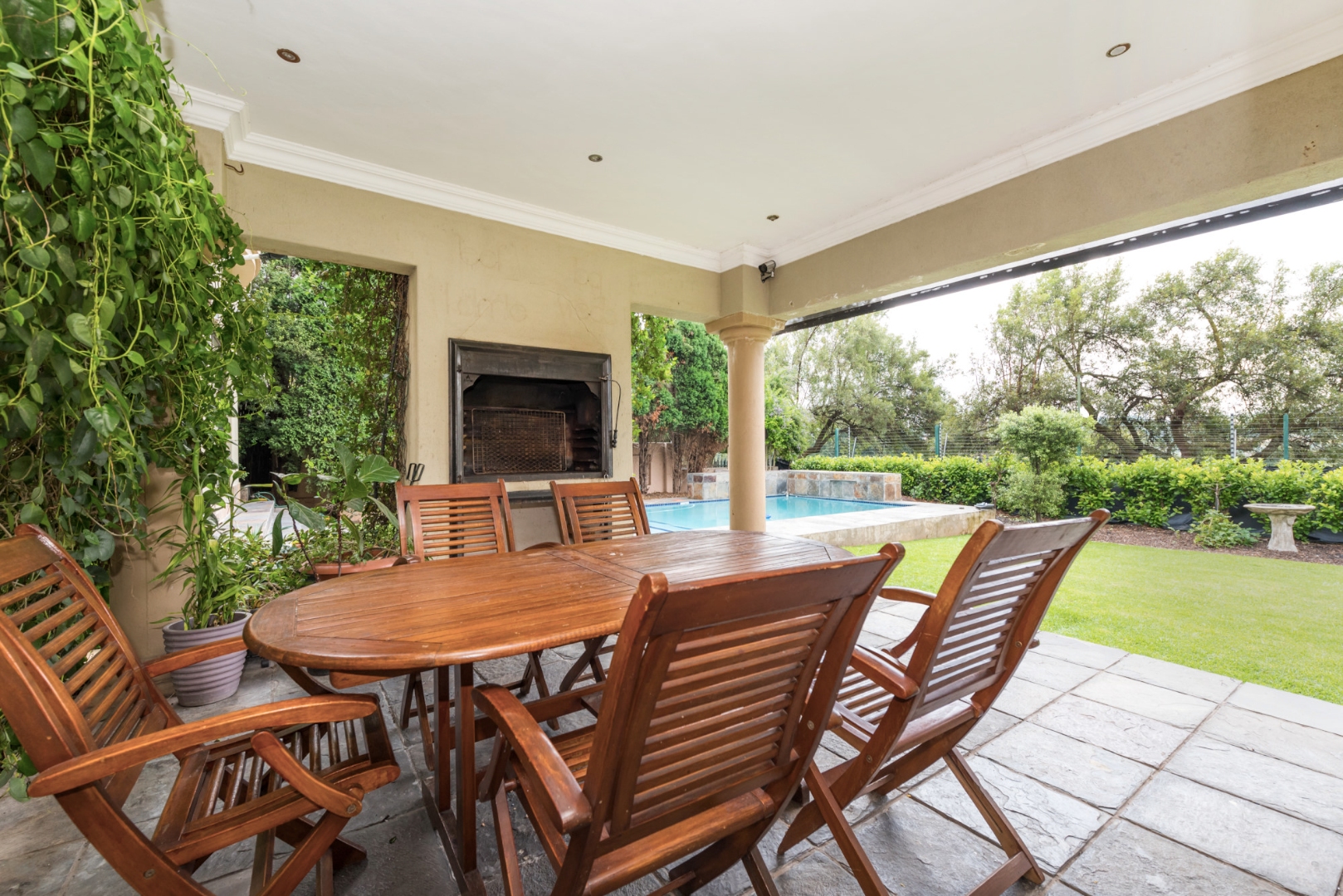 From the moment you enter, you’re welcomed by porcelain tiled flooring throughout. The ground floor features a modern open-plan kitchen with sleek granite countertops, a gas hob, electric oven, extractor fan, and a central breakfast counter. A separate scullery area accommodates three undercounter appliances, adding to the home’s practicality. The kitchen opens onto a bright and sunny lounge, which in turn leads to a covered patio complete with built-in braai—an ideal space for relaxed entertaining while enjoying views of the sparkling heated pool and the expansive private garden.