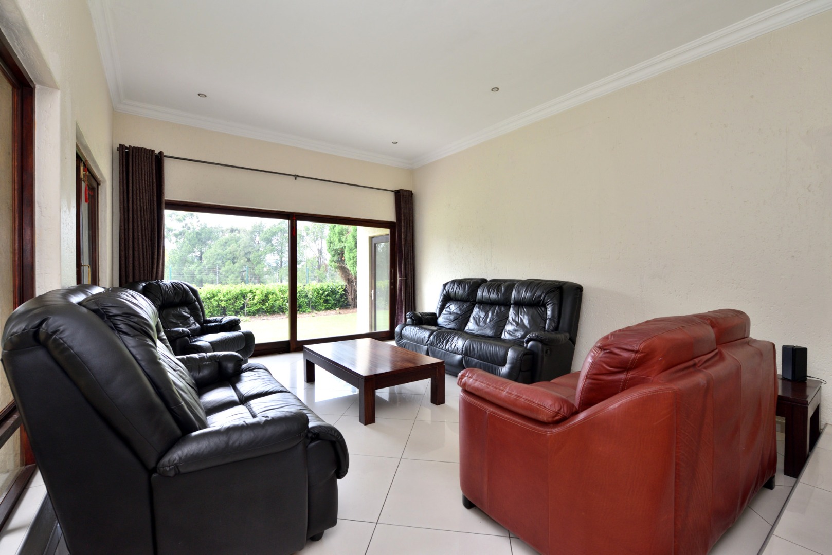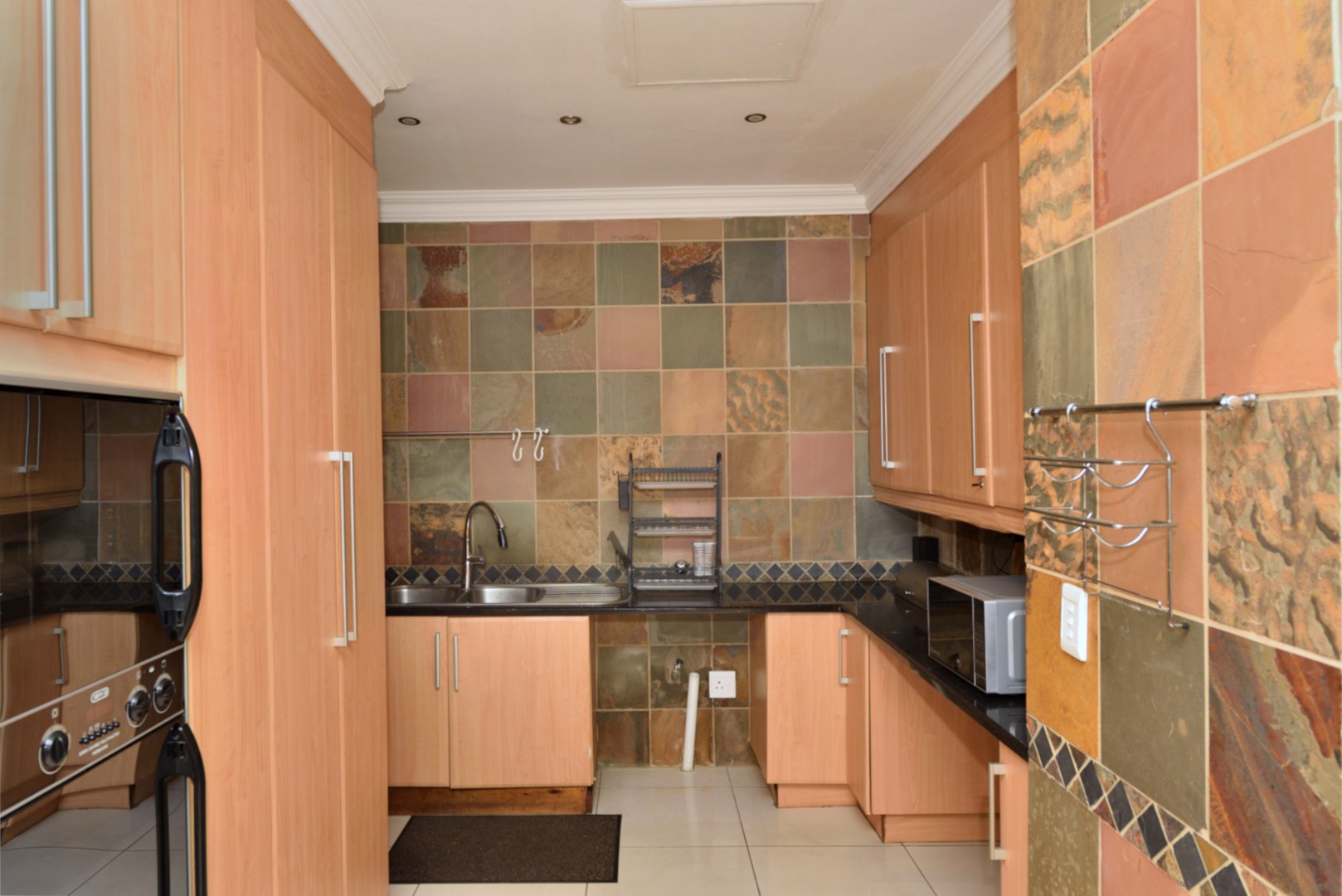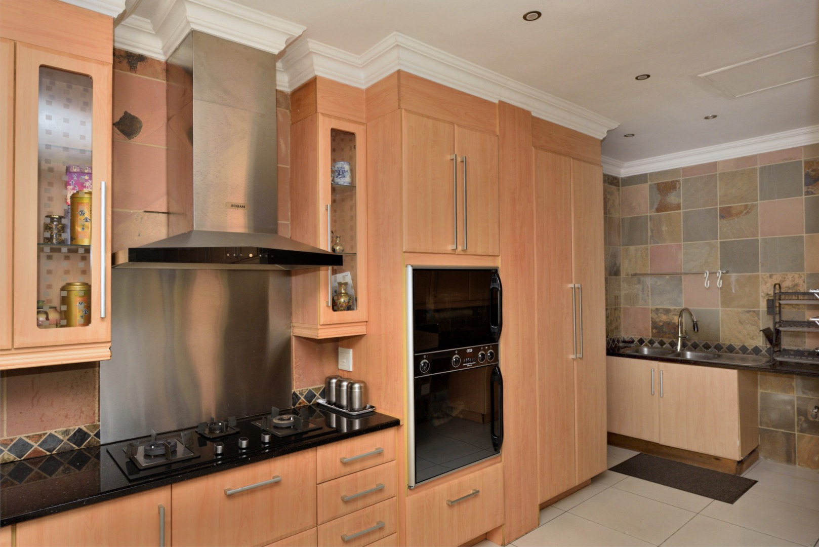 From the moment you enter, you’re welcomed by porcelain tiled flooring throughout. The ground floor features a modern open-plan kitchen with sleek granite countertops, a gas hob, electric oven, extractor fan, and a central breakfast counter. A separate scullery area accommodates three undercounter appliances, adding to the home’s practicality. The kitchen opens onto a bright and sunny lounge, which in turn leads to a covered patio complete with built-in braai—an ideal space for relaxed entertaining while enjoying views of the sparkling heated pool and the expansive private garden.