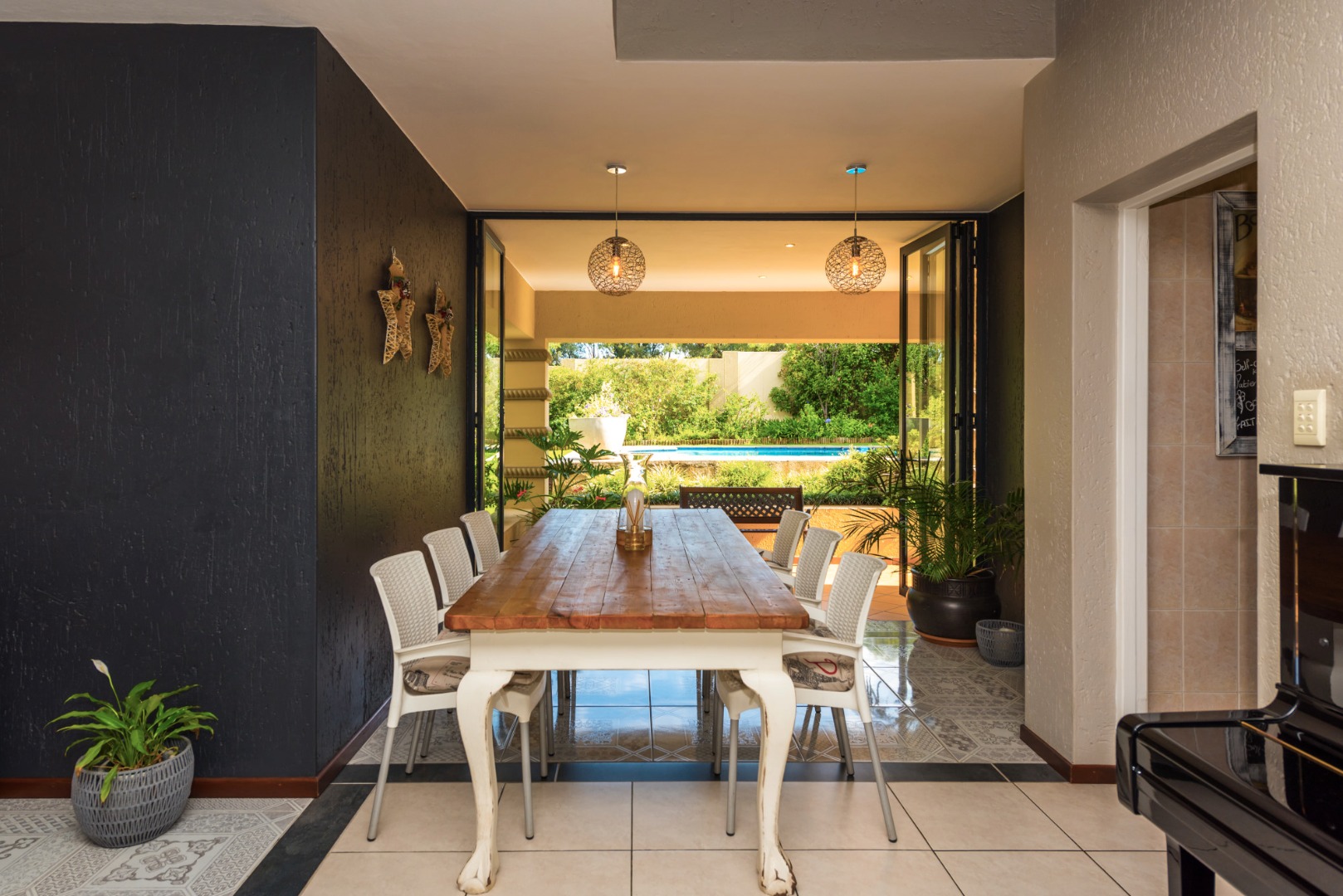 The living spaces are designed for easy family living and effortless entertaining. The open-plan lounge and dining room create a warm and welcoming atmosphere, while an additional dining area flows out to a covered entertainment patio fitted with a built-in braai. This outdoor area overlooks the sparkling pool and private back garden, making it ideal for hosting family and friends.