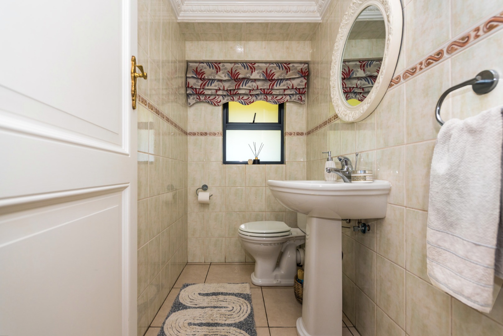 The modern, separate kitchen features Rustenburg black granite tops, a gas hob, electric oven and extractor fan, along with a practical three-seater breakfast counter. A separate scullery provides under-counter space for three appliances as well as room for a double-door fridge. Downstairs also includes a generous study and a guest toilet for added convenience.