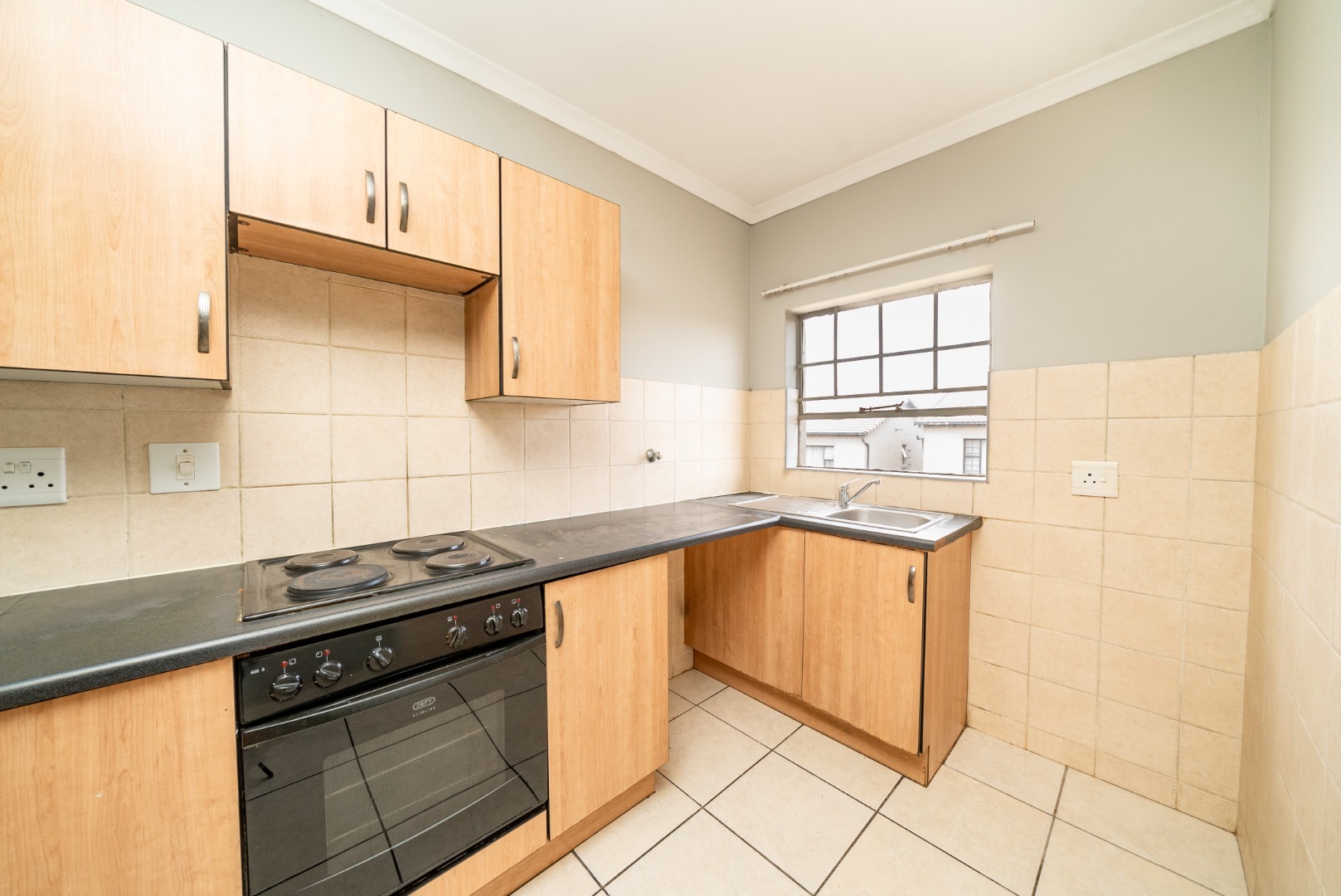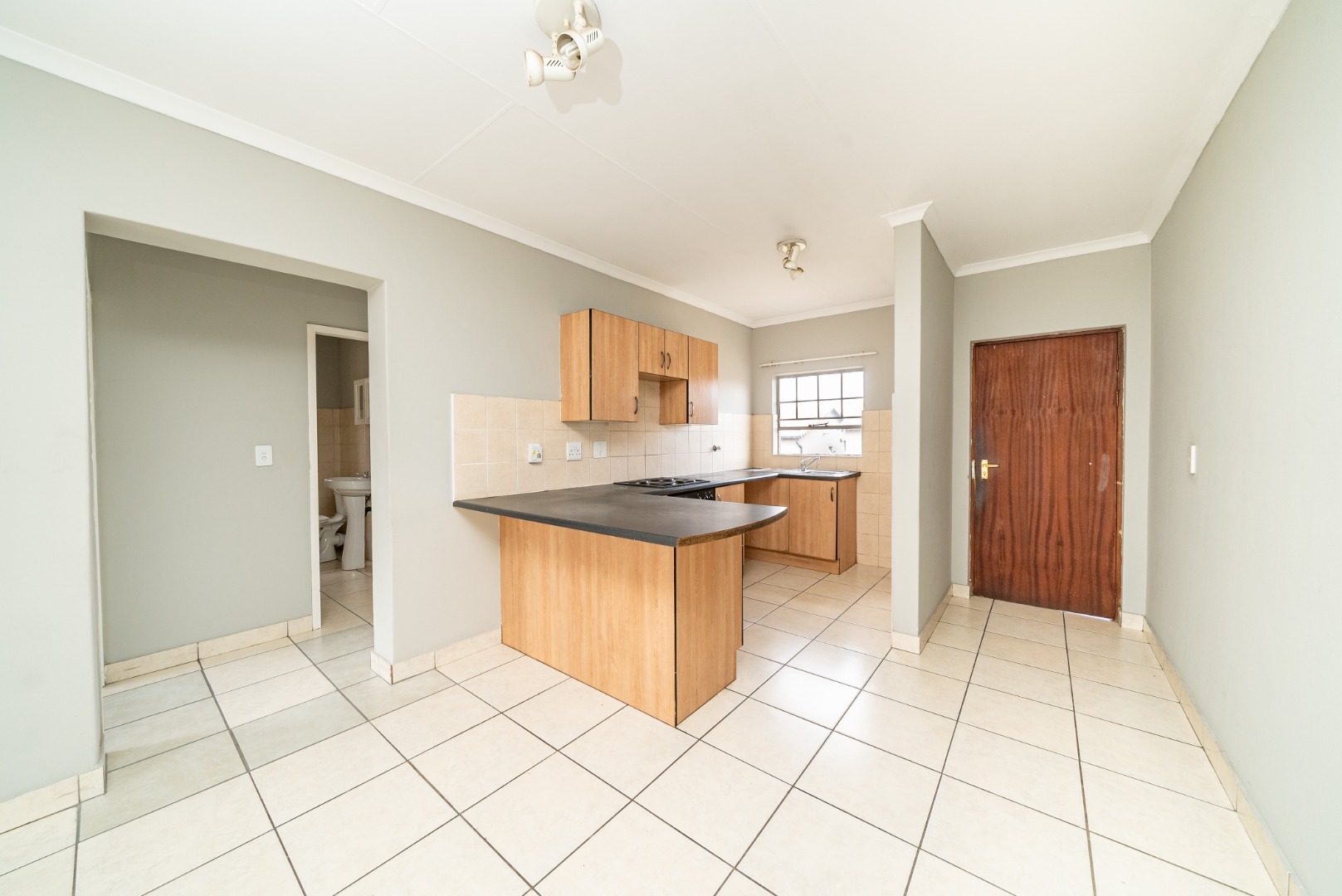 Discover this inviting two-bedroom residence nestled within a secure estate in Albemarle, Germiston. Designed for comfortable living, the property features a well-appointed open-plan lounge and kitchen area, creating a seamless flow ideal for daily life and entertaining. The kitchen is equipped with light wood-effect cabinetry, dark countertops, a built-in electric stove and oven, and a convenient breakfast bar, all complemented by durable tiled flooring and a practical tiled backsplash.