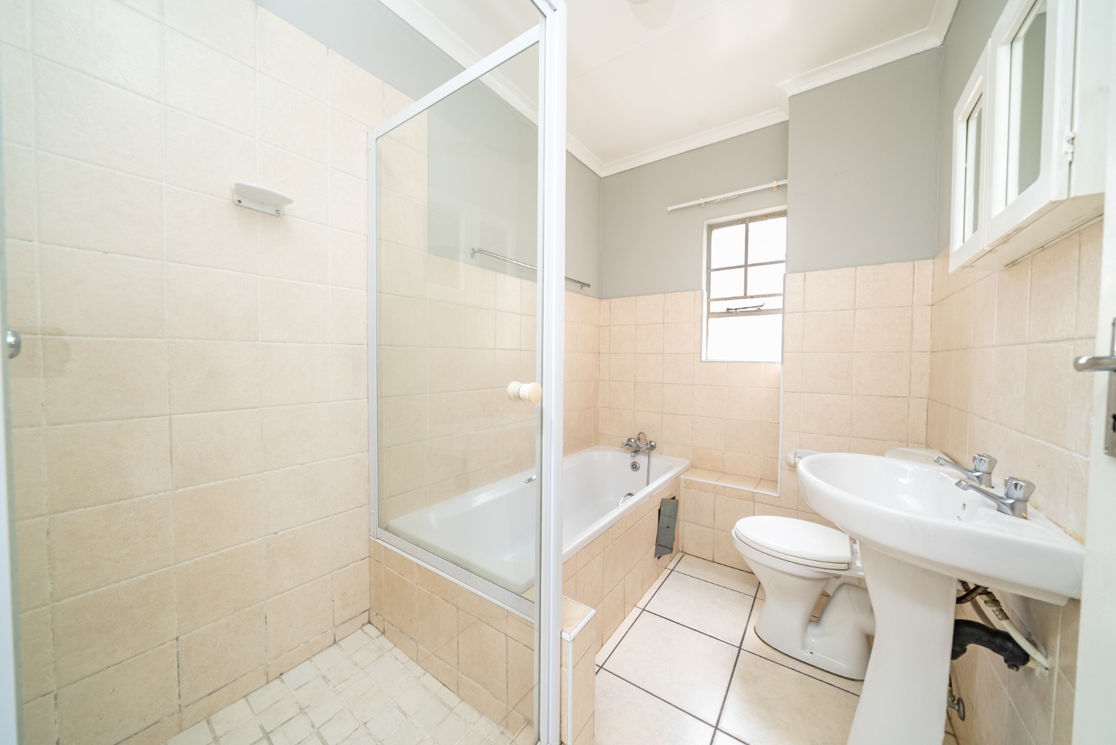 This home offers two comfortable bedrooms, each featuring neutral wall colours and easy-to-maintain tiled flooring. Ample storage is provided by built-in wardrobes in both rooms, ensuring a clutter-free environment. The single bathroom is functional, comprising a bathtub with a glass shower screen, a pedestal sink, and a toilet, finished with beige/cream wall tiles.