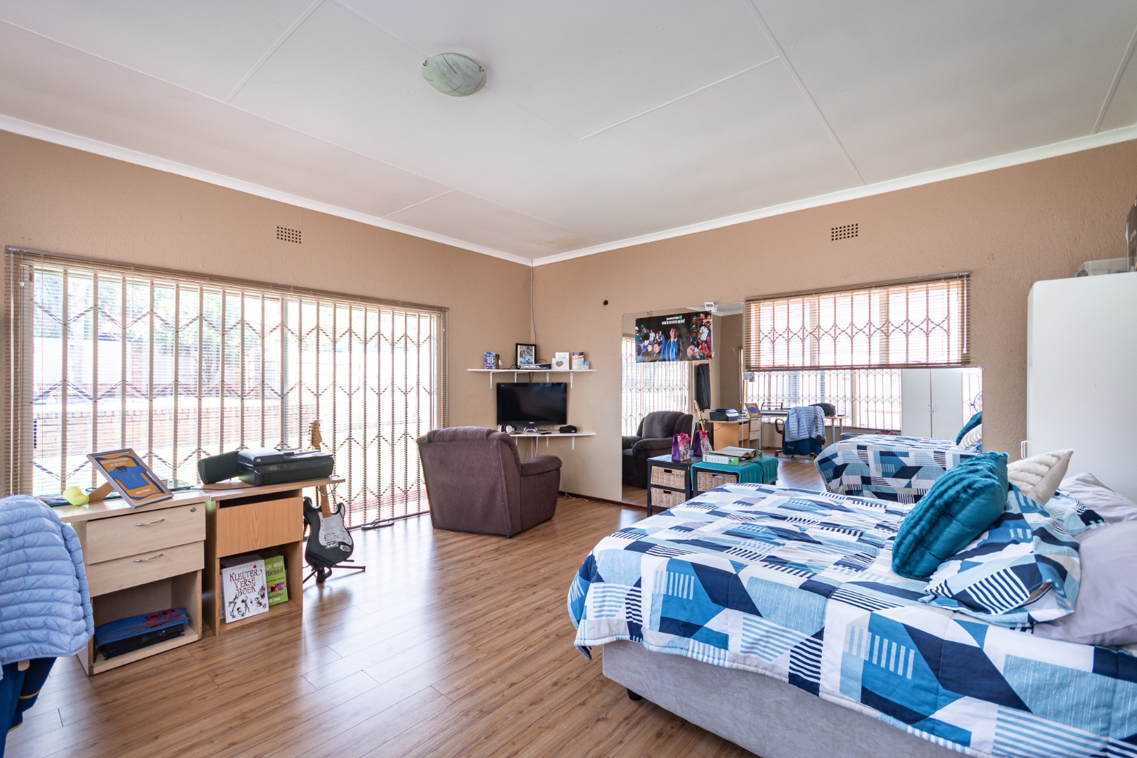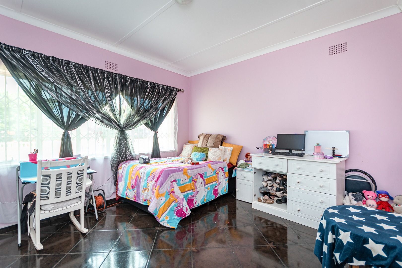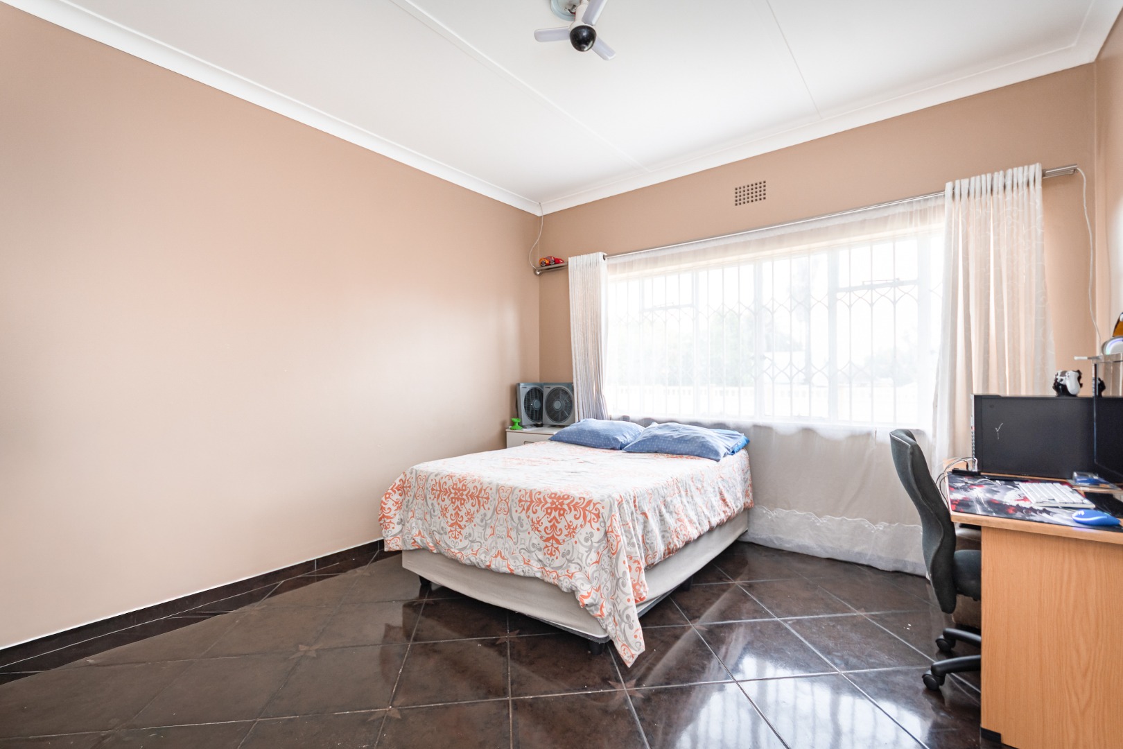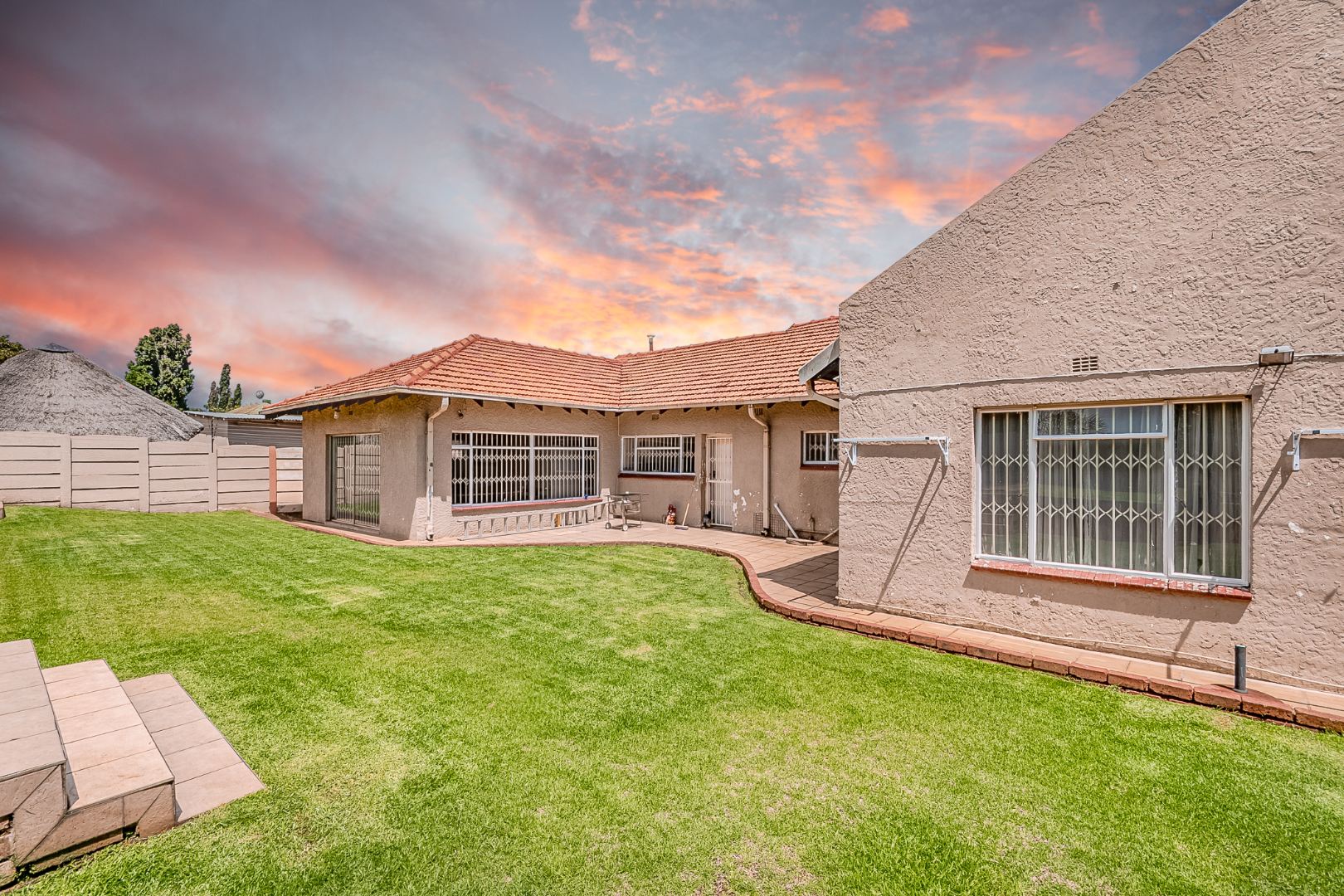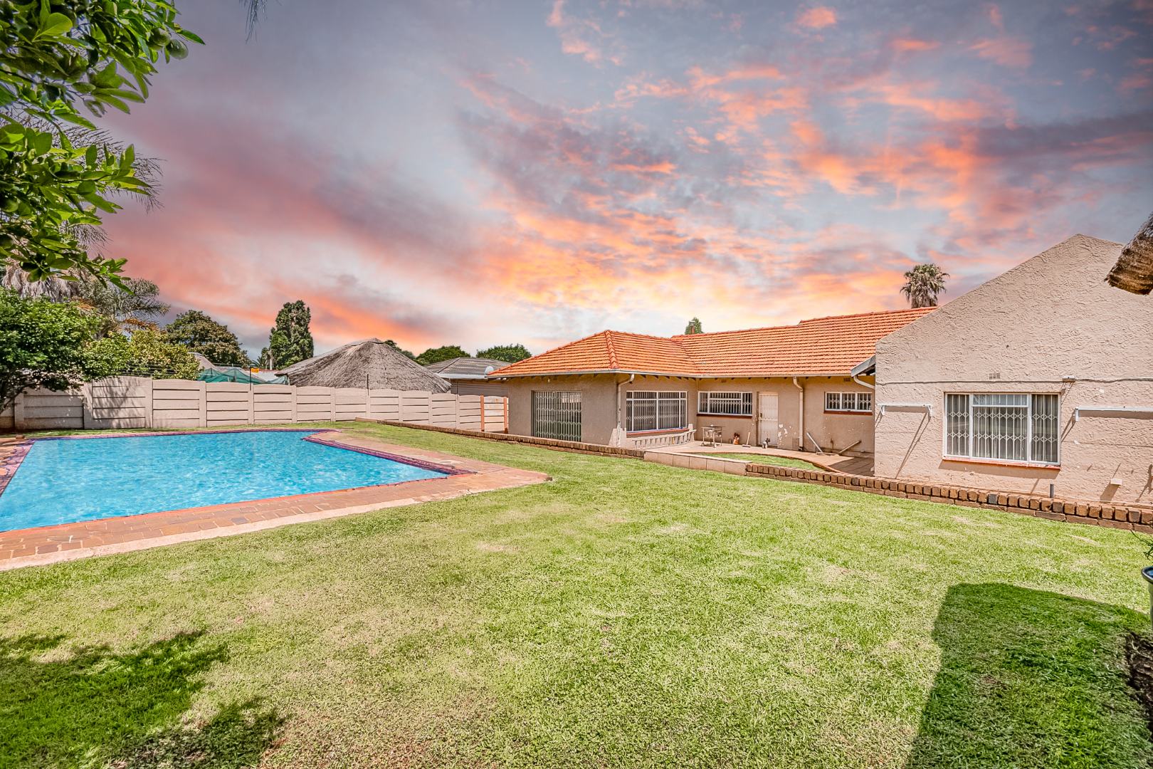 Discover this spacious family home located in the established suburban area of Lambton, Germiston. This property offers a comfortable and convenient lifestyle, ideal for families seeking ample living space and outdoor amenities. The single-story residence features a neat exterior, combining brick and stucco finishes under a classic terracotta-style tiled roof. A well-maintained front lawn and paved driveway contribute to its inviting curb appeal, while robust security gates and window bars provide enhanced peace of mind. Inside, the home boasts durable dark tiled flooring throughout its generous living areas. The main lounge is bathed in natural light from large windows and includes a dedicated office or study nook, perfect for remote work or a quiet retreat. The functional kitchen is equipped with white fitted cabinets, dark speckled countertops, an integrated oven, hob, and extractor fan, alongside tiled walls for easy maintenance and space for essential appliances. Accommodation comprises four comfortable bedrooms and two bathrooms, catering to family needs. One particularly large room features modern wood-look laminate flooring and abundant natural light, offering versatile use as a shared living space or a spacious studio. The expansive backyard is a true highlight, featuring a large kidney-shaped swimming pool with brick paving, perfect for recreation and relaxation. A thatched lapa provides an ideal outdoor entertainment area, set amidst a green lawn and mature trees. The property also includes a single garage and additional parking, with pets allowed. Key Features: * 4 Bedrooms, 2 Bathrooms * Spacious Living Area with Office Nook * Functional Kitchen with White Cabinetry * Large Backyard with Swimming Pool * Thatched Lapa for Outdoor Entertainment * Single Garage and Additional Parking * Durable Tiled Flooring * Security Gates and Window Bars * Erf Size: 991.00 sqm * Pet-Friendly