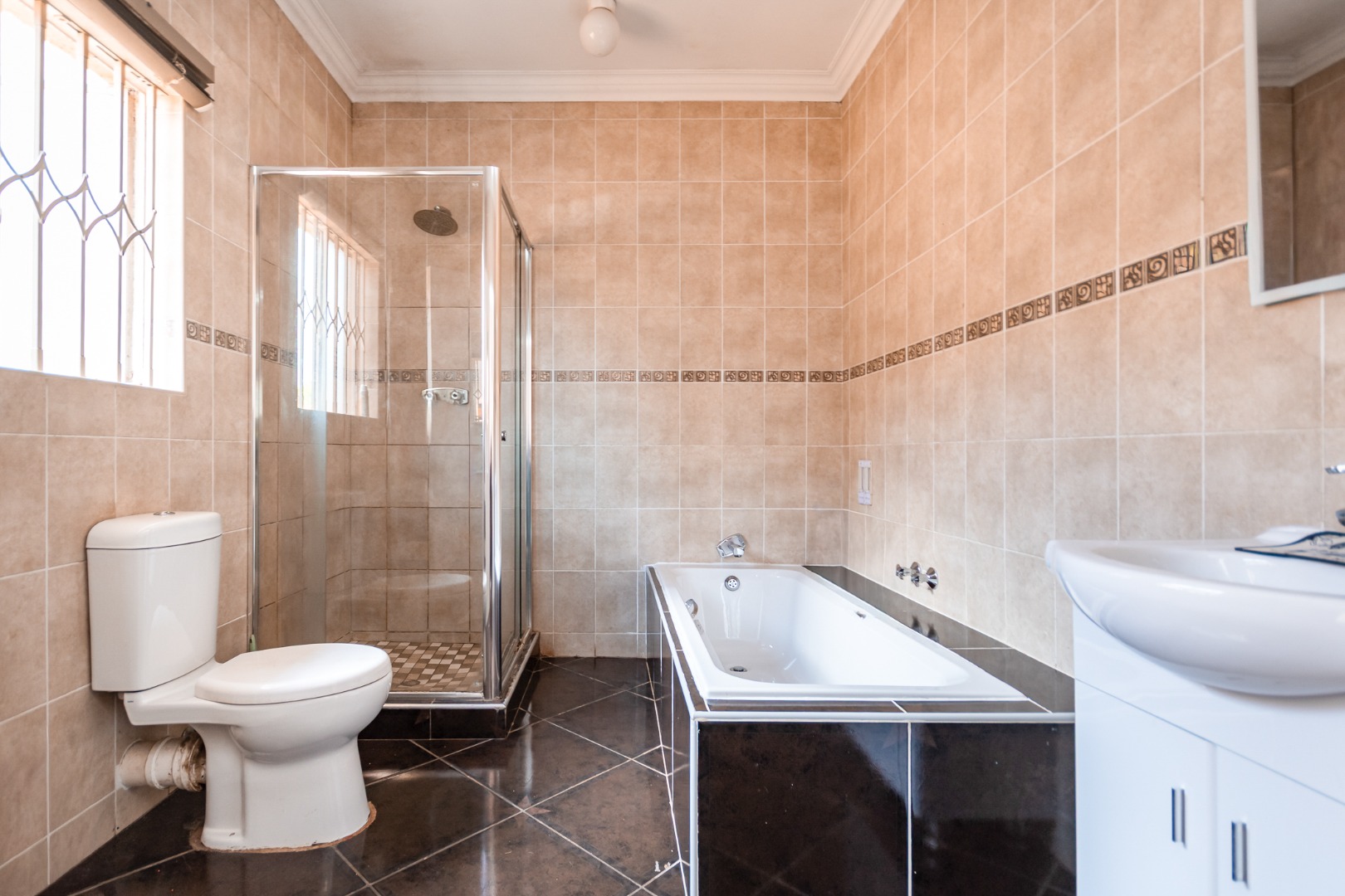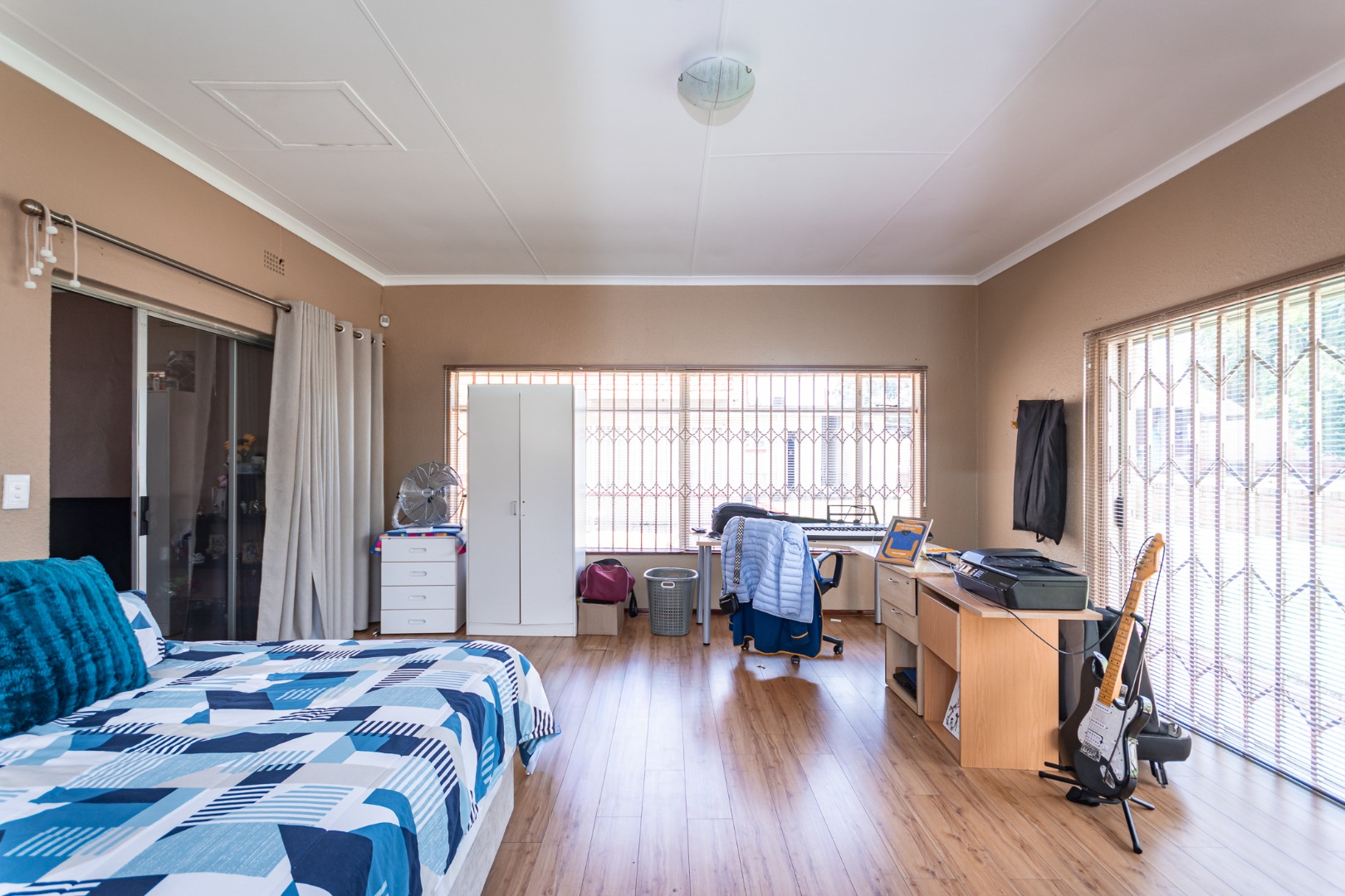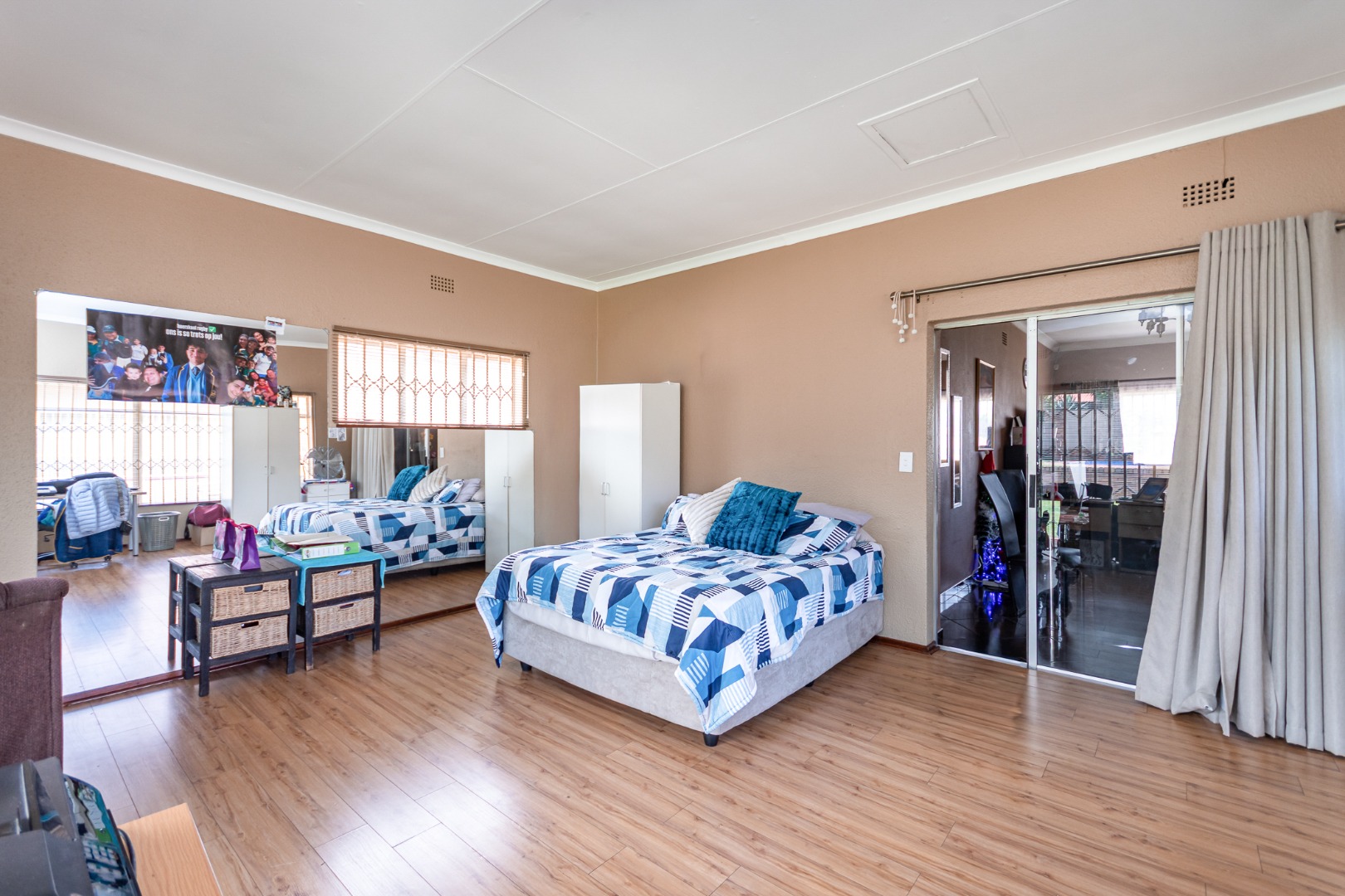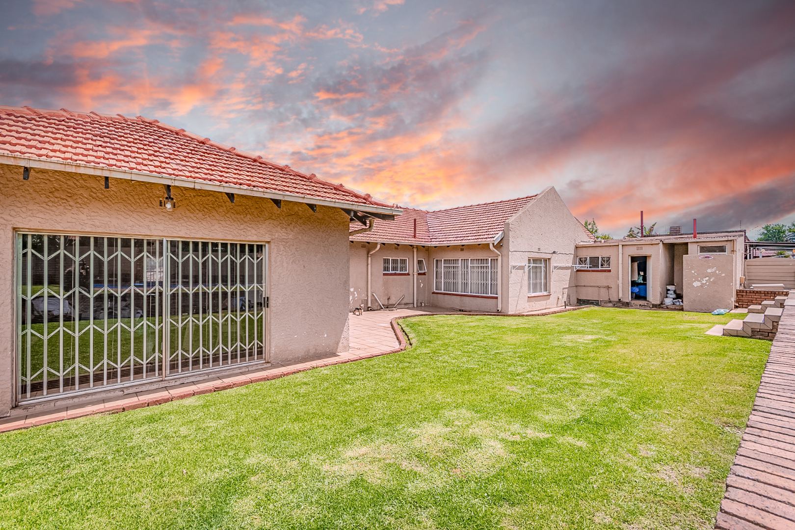 Discover this spacious family home located in the established suburban area of Lambton, Germiston. This property offers a comfortable and convenient lifestyle, ideal for families seeking ample living space and outdoor amenities. The single-story residence features a neat exterior, combining brick and stucco finishes under a classic terracotta-style tiled roof. A well-maintained front lawn and paved driveway contribute to its inviting curb appeal, while robust security gates and window bars provide enhanced peace of mind. Inside, the home boasts durable dark tiled flooring throughout its generous living areas. The main lounge is bathed in natural light from large windows and includes a dedicated office or study nook, perfect for remote work or a quiet retreat. The functional kitchen is equipped with white fitted cabinets, dark speckled countertops, an integrated oven, hob, and extractor fan, alongside tiled walls for easy maintenance and space for essential appliances. Accommodation comprises four comfortable bedrooms and two bathrooms, catering to family needs. One particularly large room features modern wood-look laminate flooring and abundant natural light, offering versatile use as a shared living space or a spacious studio. The expansive backyard is a true highlight, featuring a large kidney-shaped swimming pool with brick paving, perfect for recreation and relaxation. A thatched lapa provides an ideal outdoor entertainment area, set amidst a green lawn and mature trees. The property also includes a single garage and additional parking, with pets allowed. Key Features: * 4 Bedrooms, 2 Bathrooms * Spacious Living Area with Office Nook * Functional Kitchen with White Cabinetry * Large Backyard with Swimming Pool * Thatched Lapa for Outdoor Entertainment * Single Garage and Additional Parking * Durable Tiled Flooring * Security Gates and Window Bars * Erf Size: 991.00 sqm * Pet-Friendly