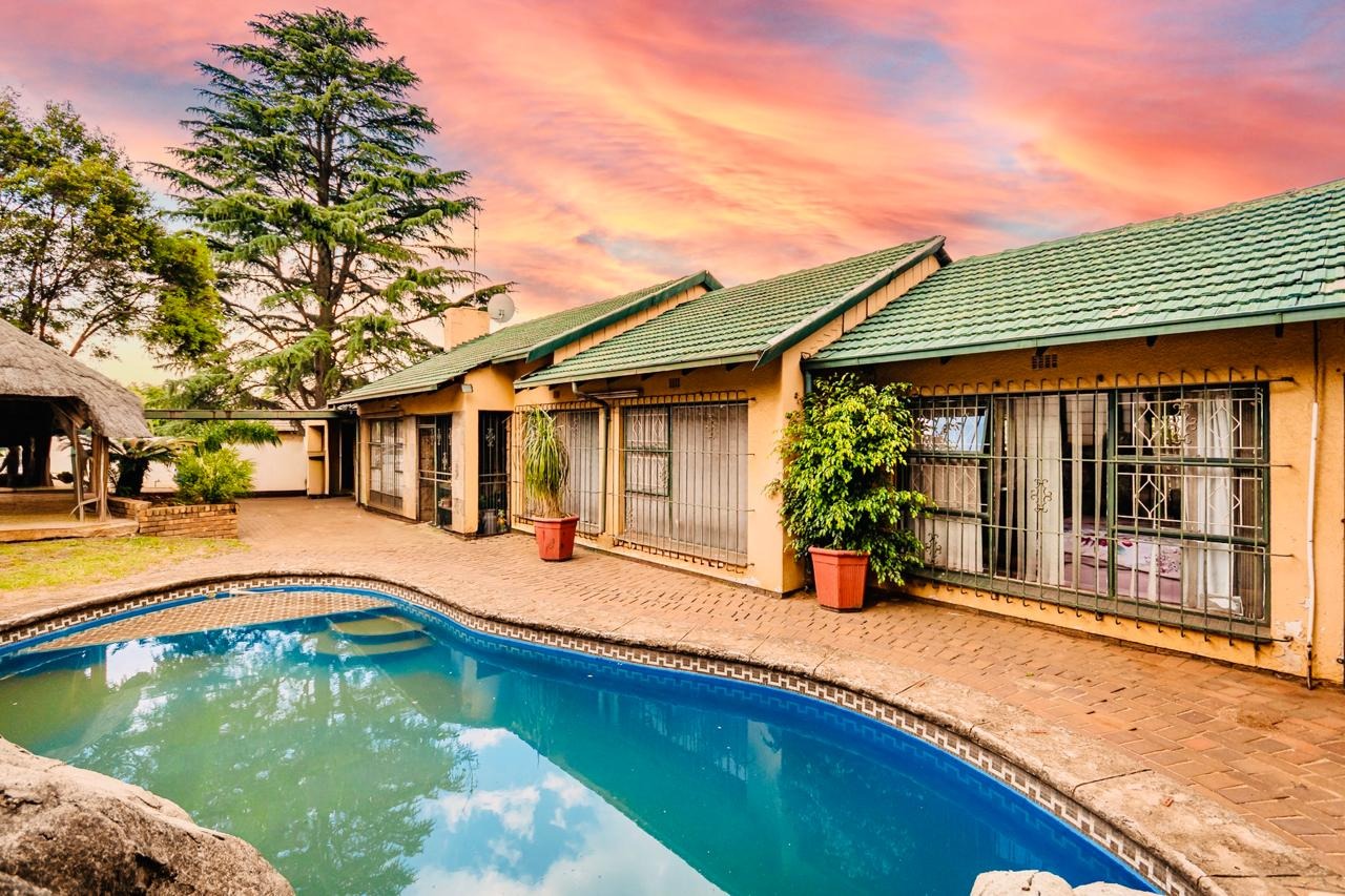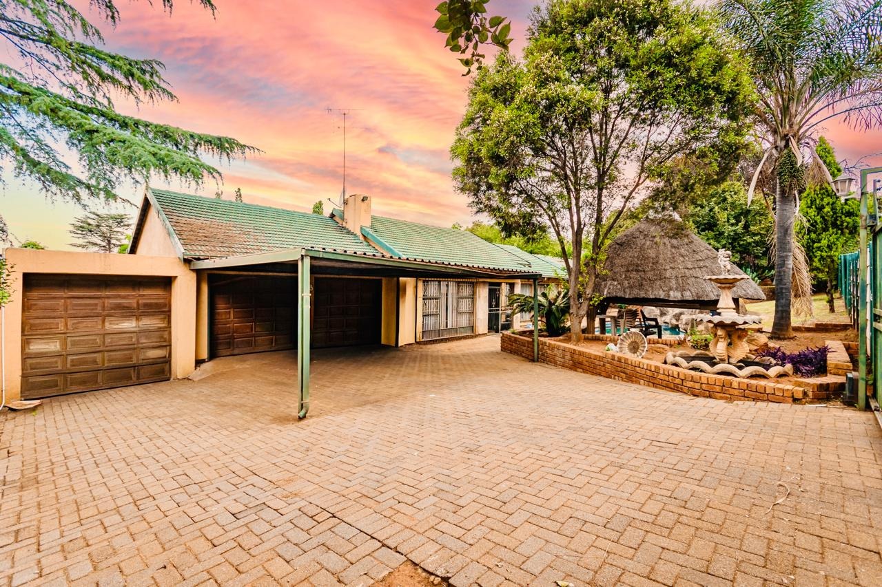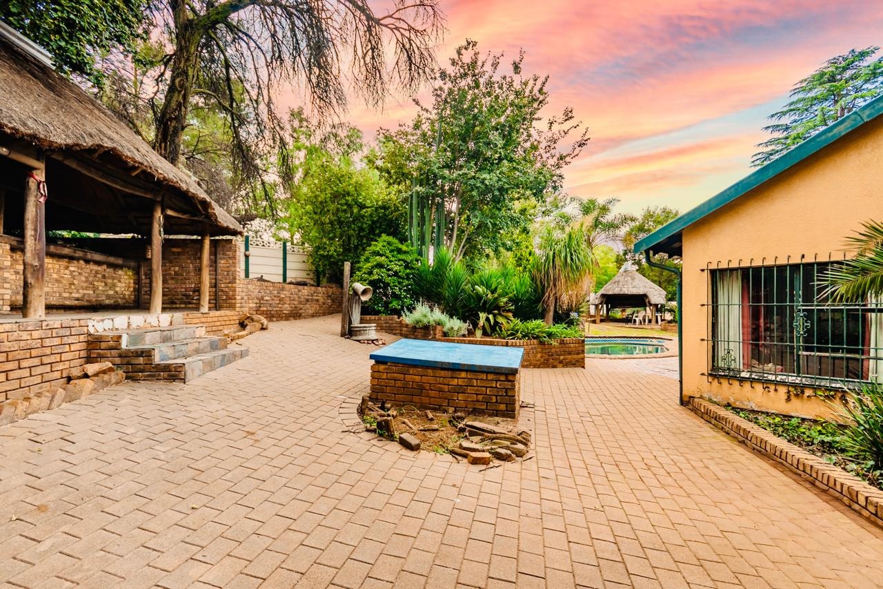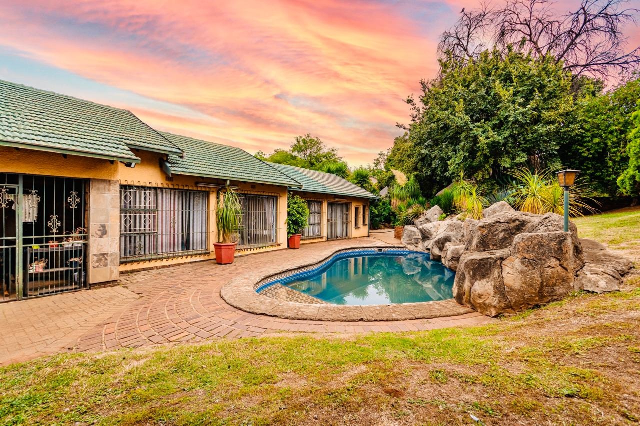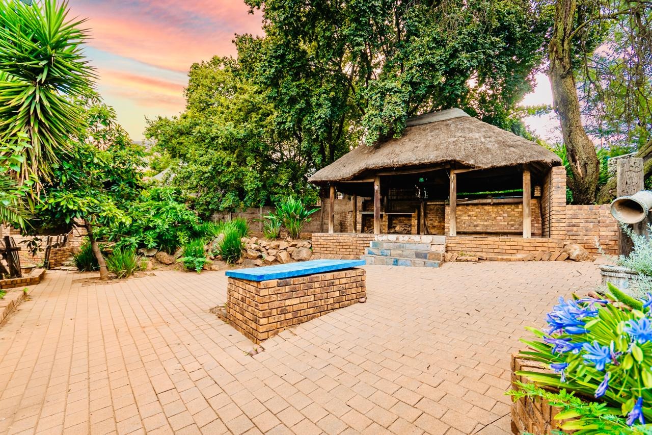 Step outside to a private swimming pool with a charming rock accent, perfect for enjoying South African summers. The expansive backyard is complemented by mature trees and landscaping, creating a serene environment. A tiled patio and walkway surround the pool, ideal for outdoor gatherings. Additional outdoor amenities include 3 lapa, a well-maintained garden, and ample parking with two garages and six carports.