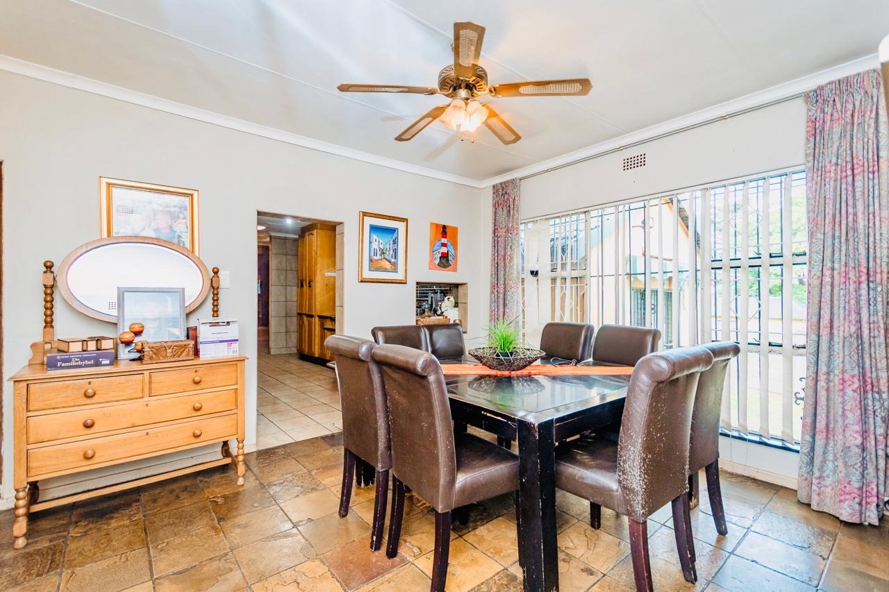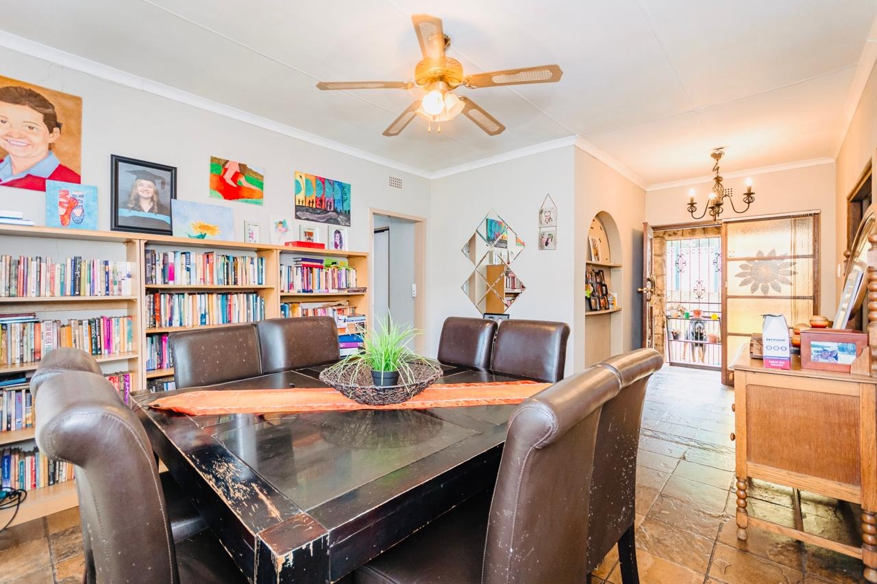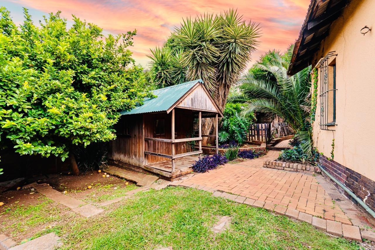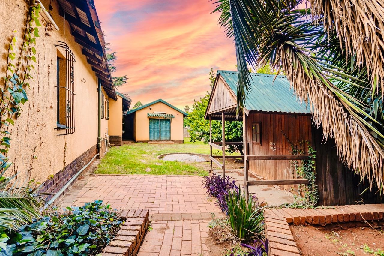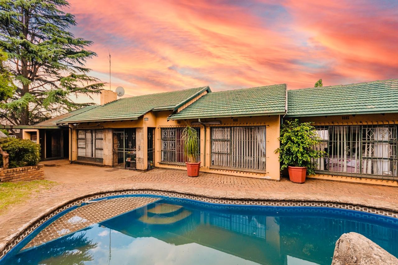 Step outside to a private swimming pool with a charming rock accent, perfect for enjoying South African summers. The expansive backyard is complemented by mature trees and landscaping, creating a serene environment. A tiled patio and walkway surround the pool, ideal for outdoor gatherings. Additional outdoor amenities include 3 lapa, a well-maintained garden, and ample parking with two garages and six carports.