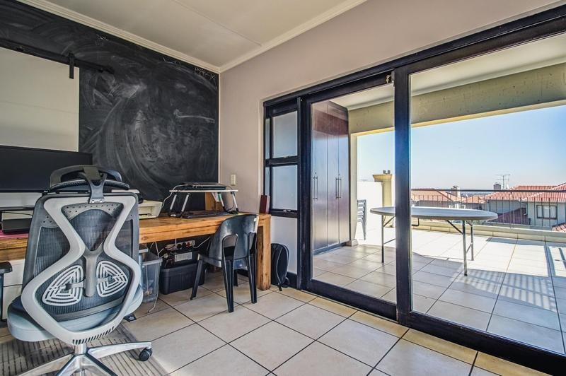 Discover modern living in this spacious 150 sqm apartment located within a secure complex in Solheim, Germiston. This residential sale property offers a contemporary design with an open-plan layout, featuring high ceilings and clerestory windows that invite abundant natural light. The main living area seamlessly connects to a dining space and a family TV room, creating an expansive environment perfect for both relaxation and entertaining. A striking floating wooden staircase with sleek metal railings serves as a central architectural feature, leading to the upper level.