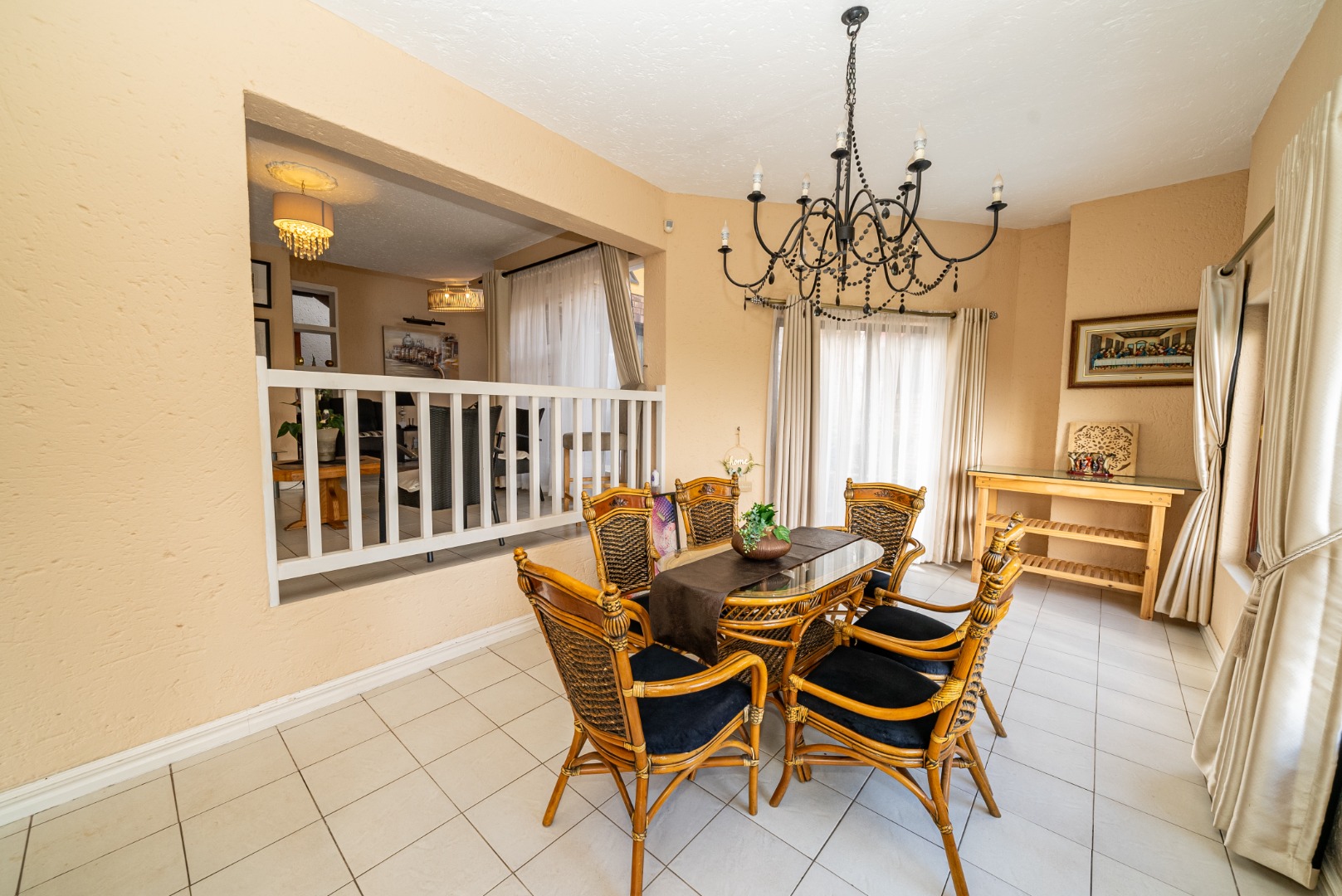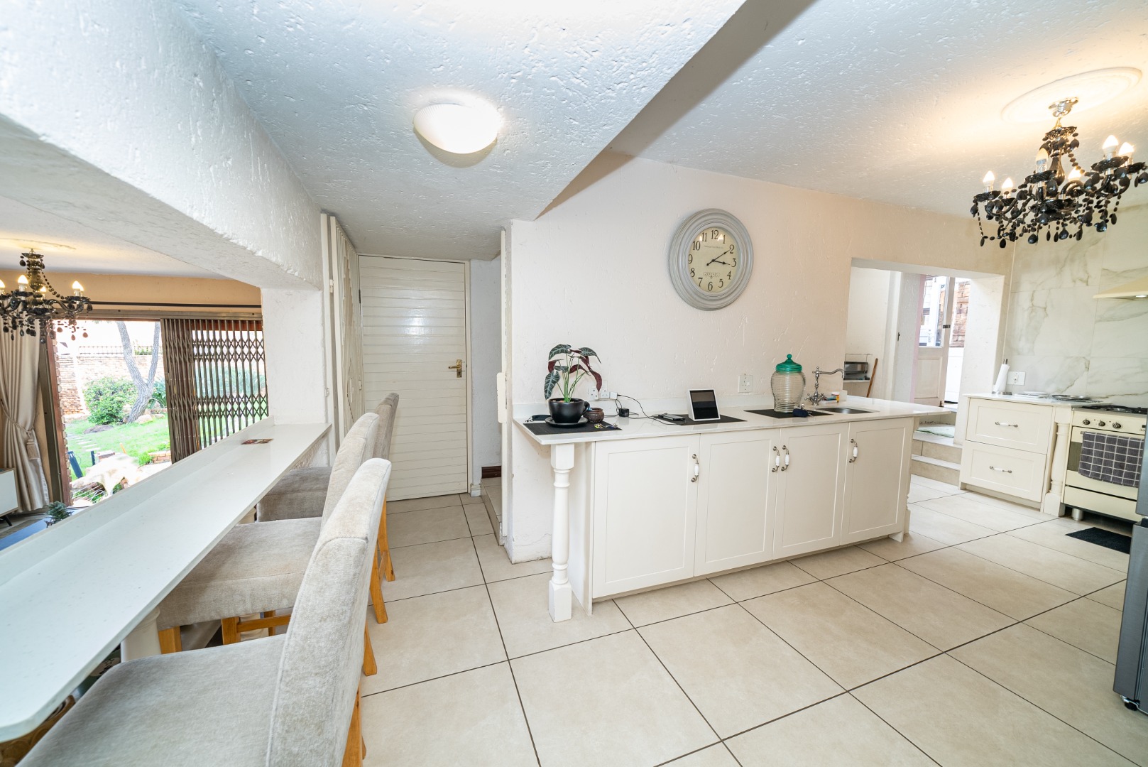 The residence features three generously proportioned bedrooms, including a luxurious en-suite, complemented by an additional 1.5 bathrooms, providing comfort and privacy for all. Outdoor living is equally impressive, with a sparkling swimming pool, a beautifully manicured garden, and extensive paving. The built-in braai and a dedicated braai room are perfect for al fresco dining, while the balcony offers breathtaking scenic views, creating a serene backdrop for relaxation. A built-in bar adds to the entertainment possibilities, and sliding doors seamlessly connect indoor and outdoor spaces.