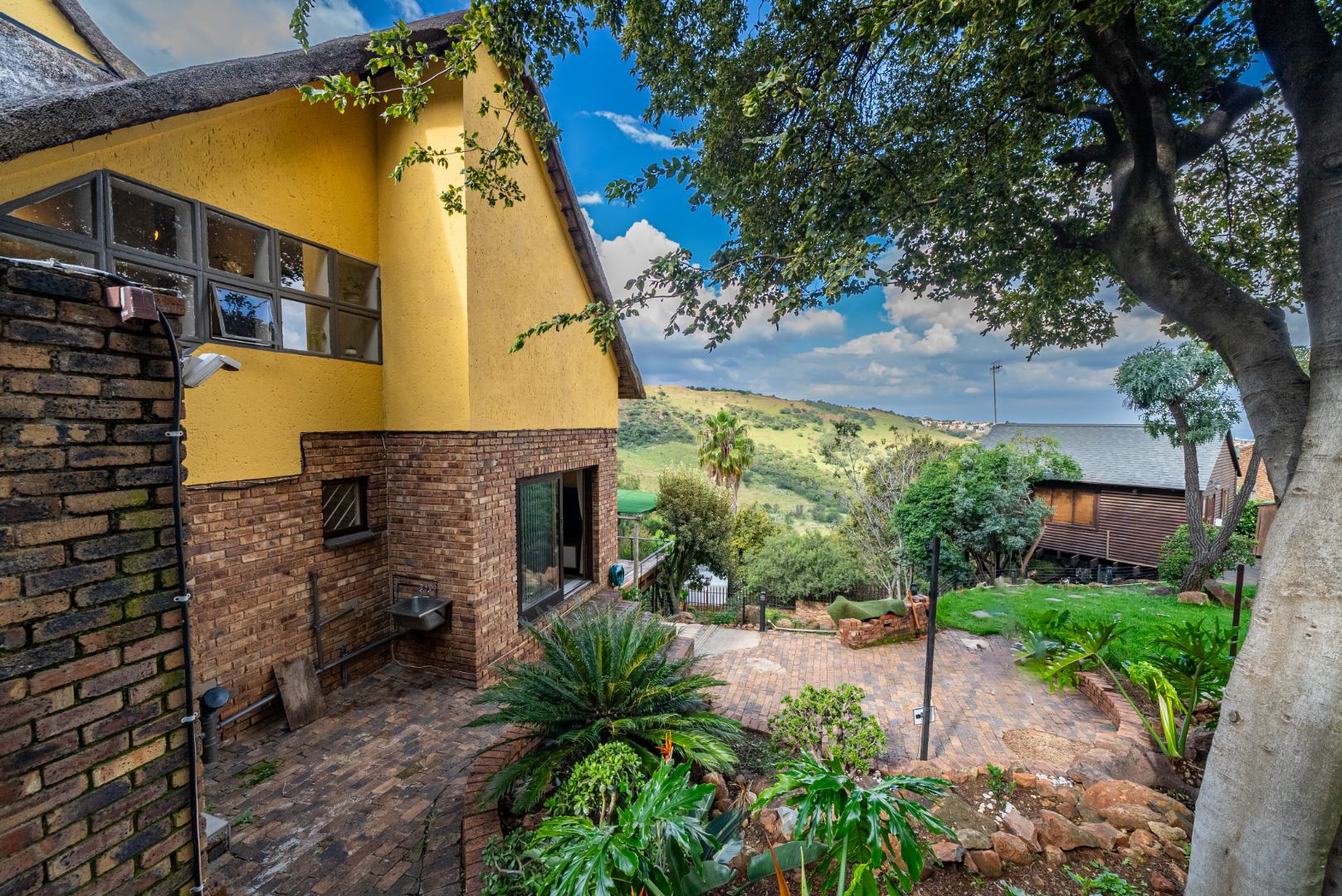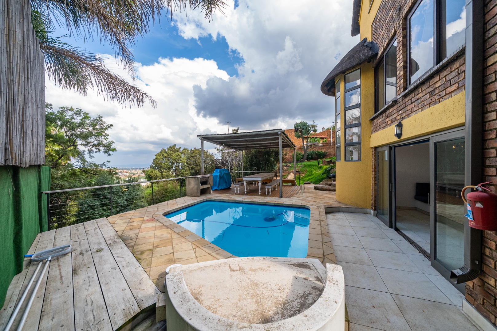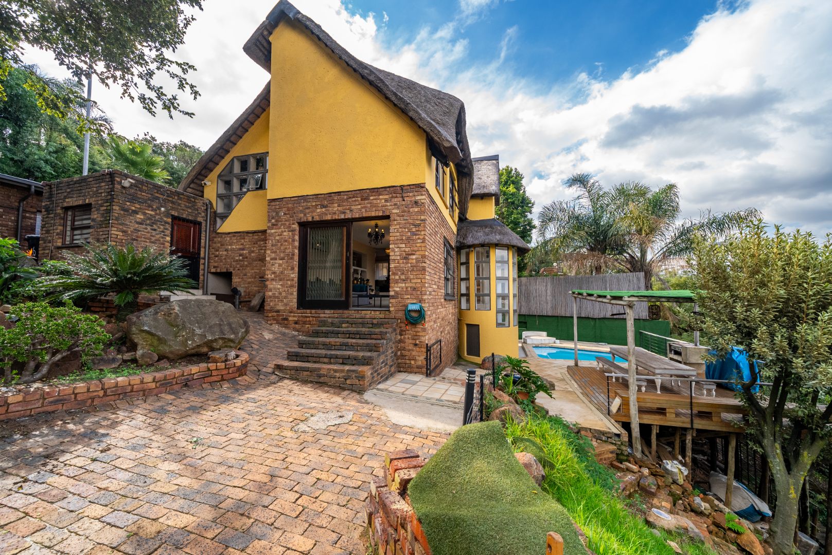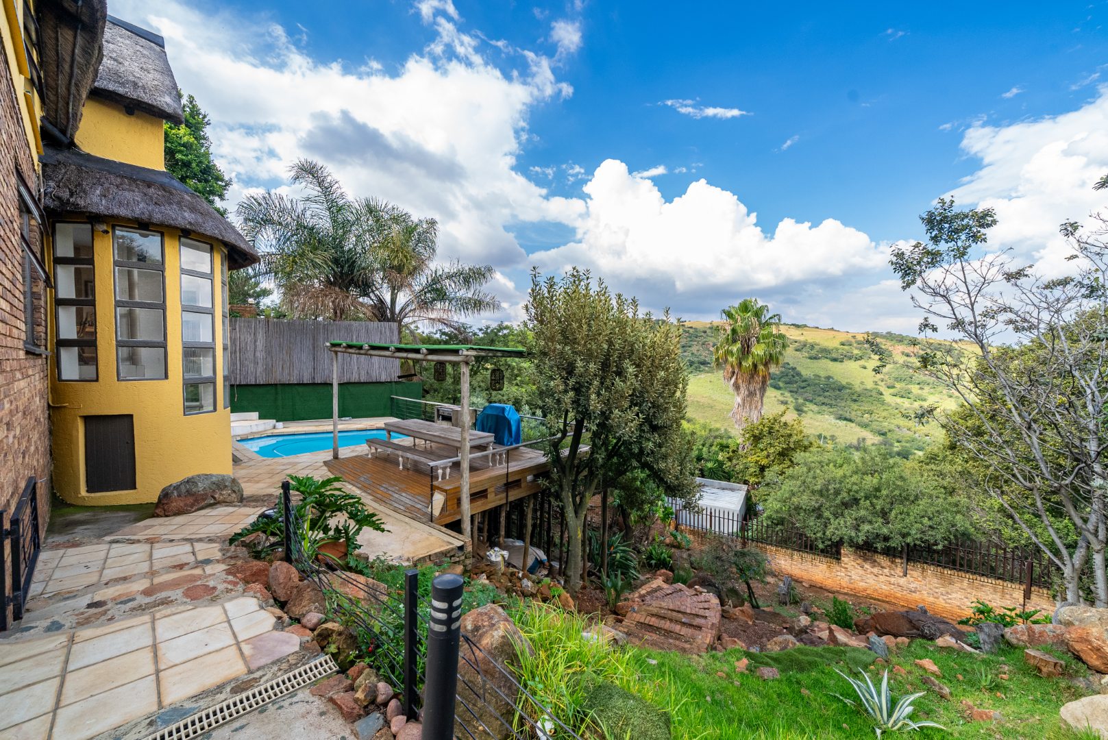The residence features three generously proportioned bedrooms, including a luxurious en-suite, complemented by an additional 1.5 bathrooms, providing comfort and privacy for all. Outdoor living is equally impressive, with a sparkling swimming pool, a beautifully manicured garden, and extensive paving. The built-in braai and a dedicated braai room are perfect for al fresco dining, while the balcony offers breathtaking scenic views, creating a serene backdrop for relaxation. A built-in bar adds to the entertainment possibilities, and sliding doors seamlessly connect indoor and outdoor spaces.