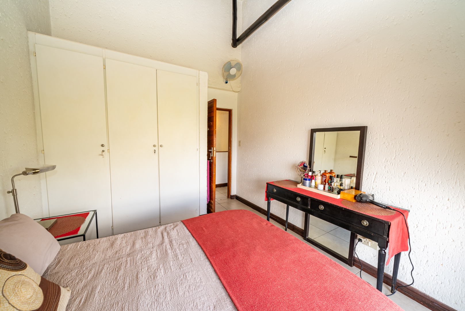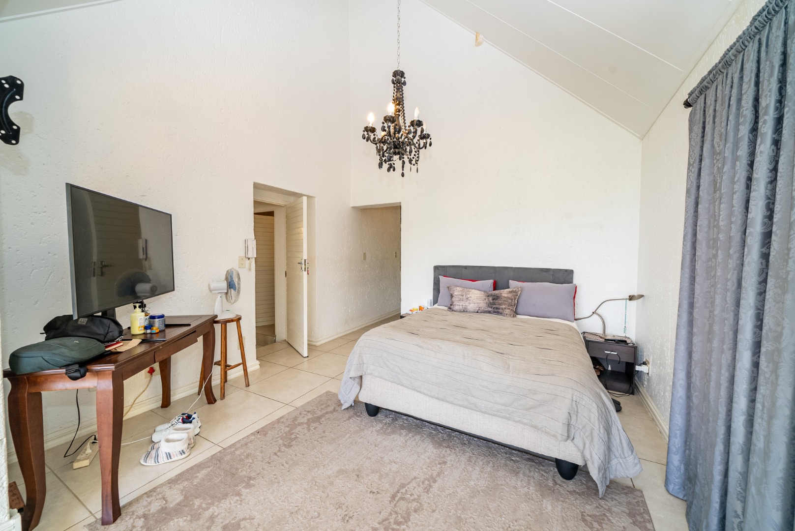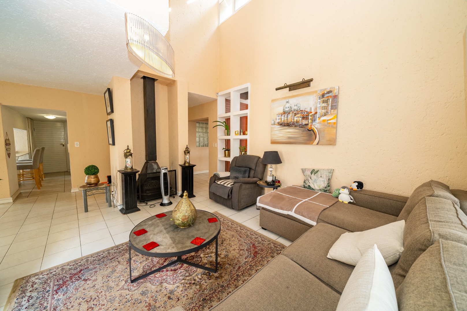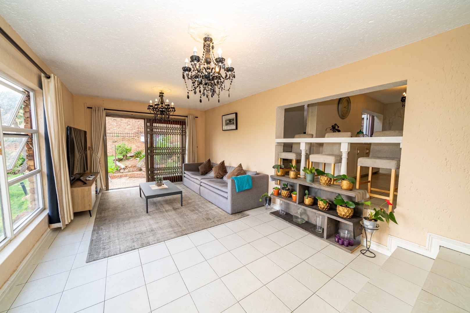 The residence features three generously proportioned bedrooms, including a luxurious en-suite, complemented by an additional 1.5 bathrooms, providing comfort and privacy for all. Outdoor living is equally impressive, with a sparkling swimming pool, a beautifully manicured garden, and extensive paving. The built-in braai and a dedicated braai room are perfect for al fresco dining, while the balcony offers breathtaking scenic views, creating a serene backdrop for relaxation. A built-in bar adds to the entertainment possibilities, and sliding doors seamlessly connect indoor and outdoor spaces.