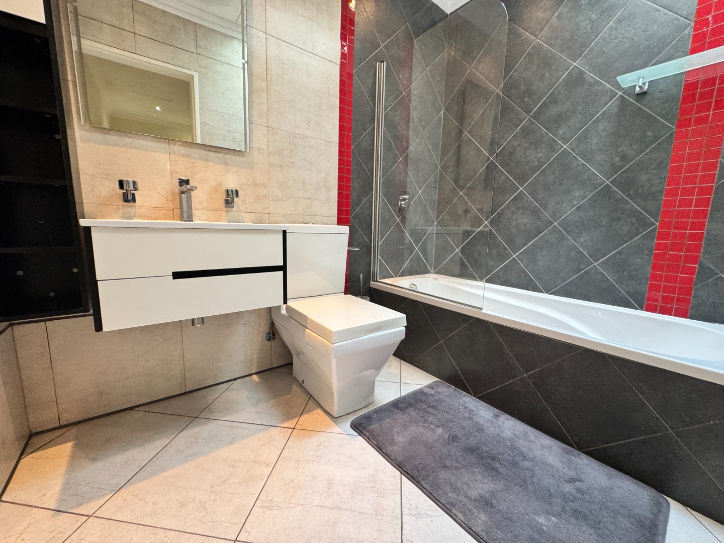 Upstairs, a tiled staircase leads to three generously sized bedrooms, all fitted with warm wood-laminate flooring. The main bathroom offers a modern finish with both a bath and shower, while the second bathroom includes a shower-over-bath combination, ideal for family living.