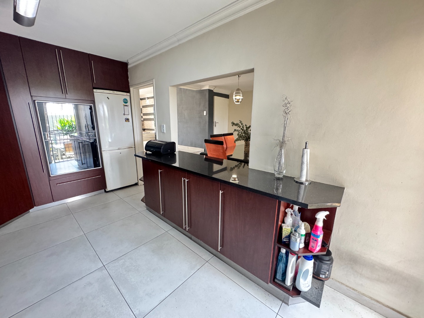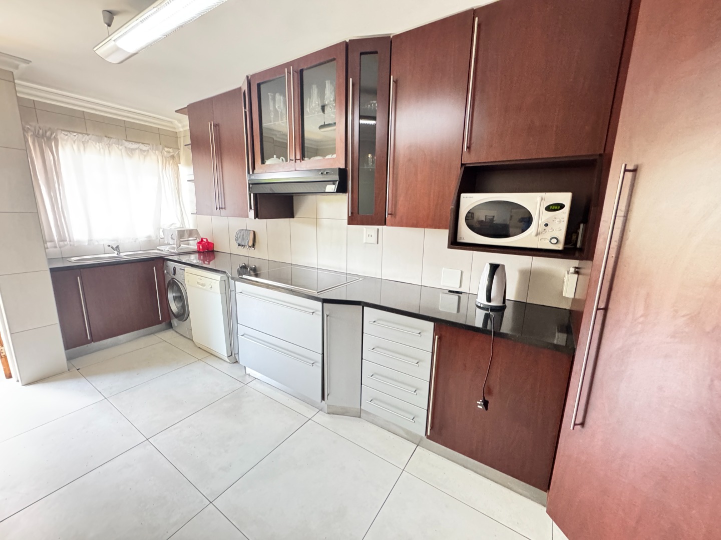The semi open-plan kitchen is both functional and contemporary, featuring a sleek two-tone design, ample built-in cupboards, granite countertops, a double oven, and space for two appliances plus a fridge.