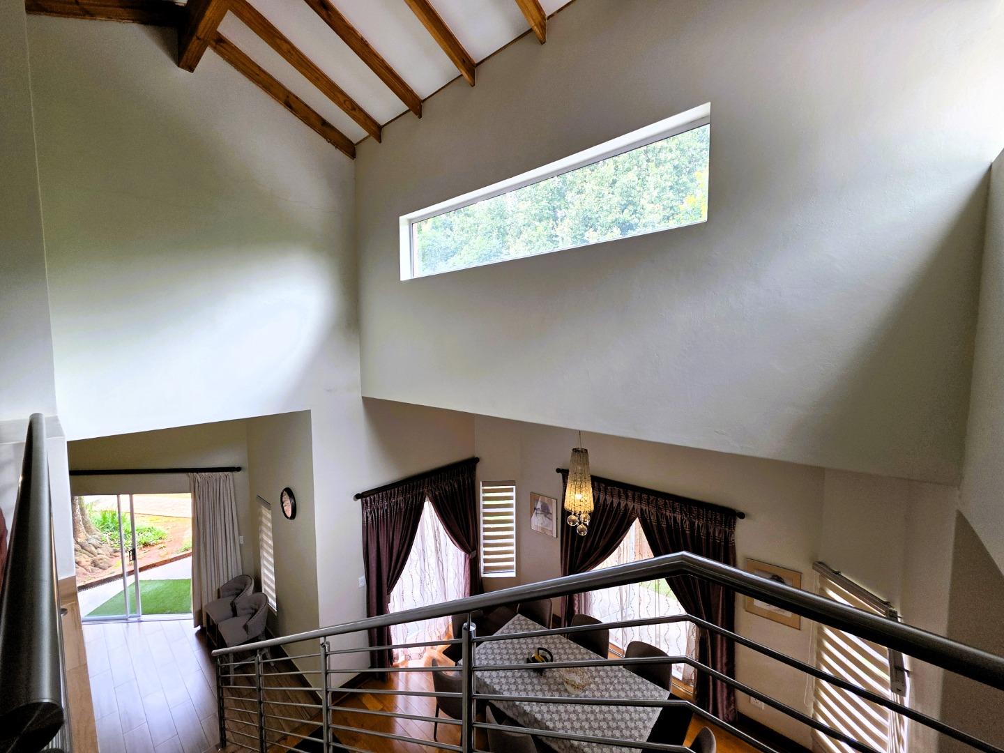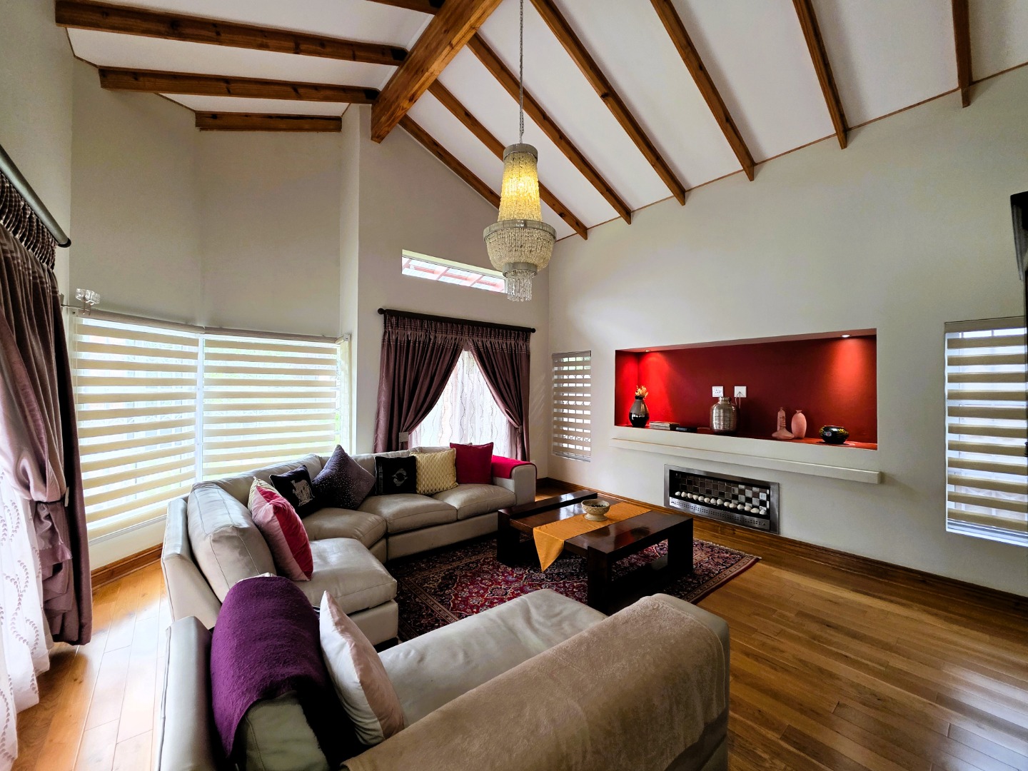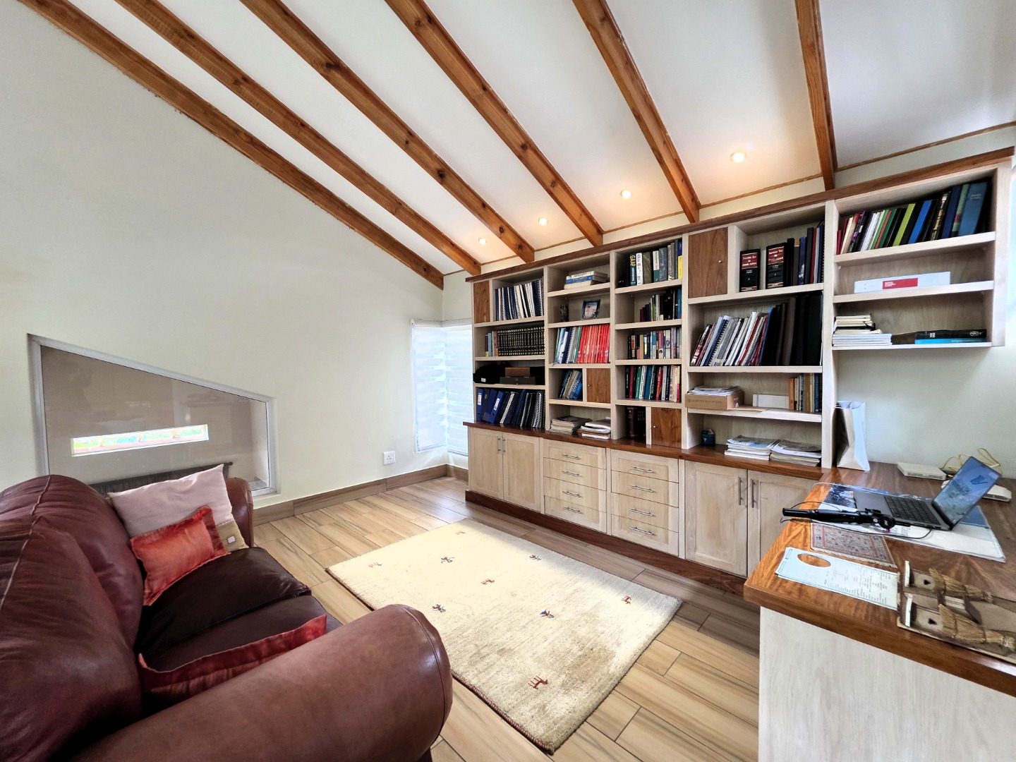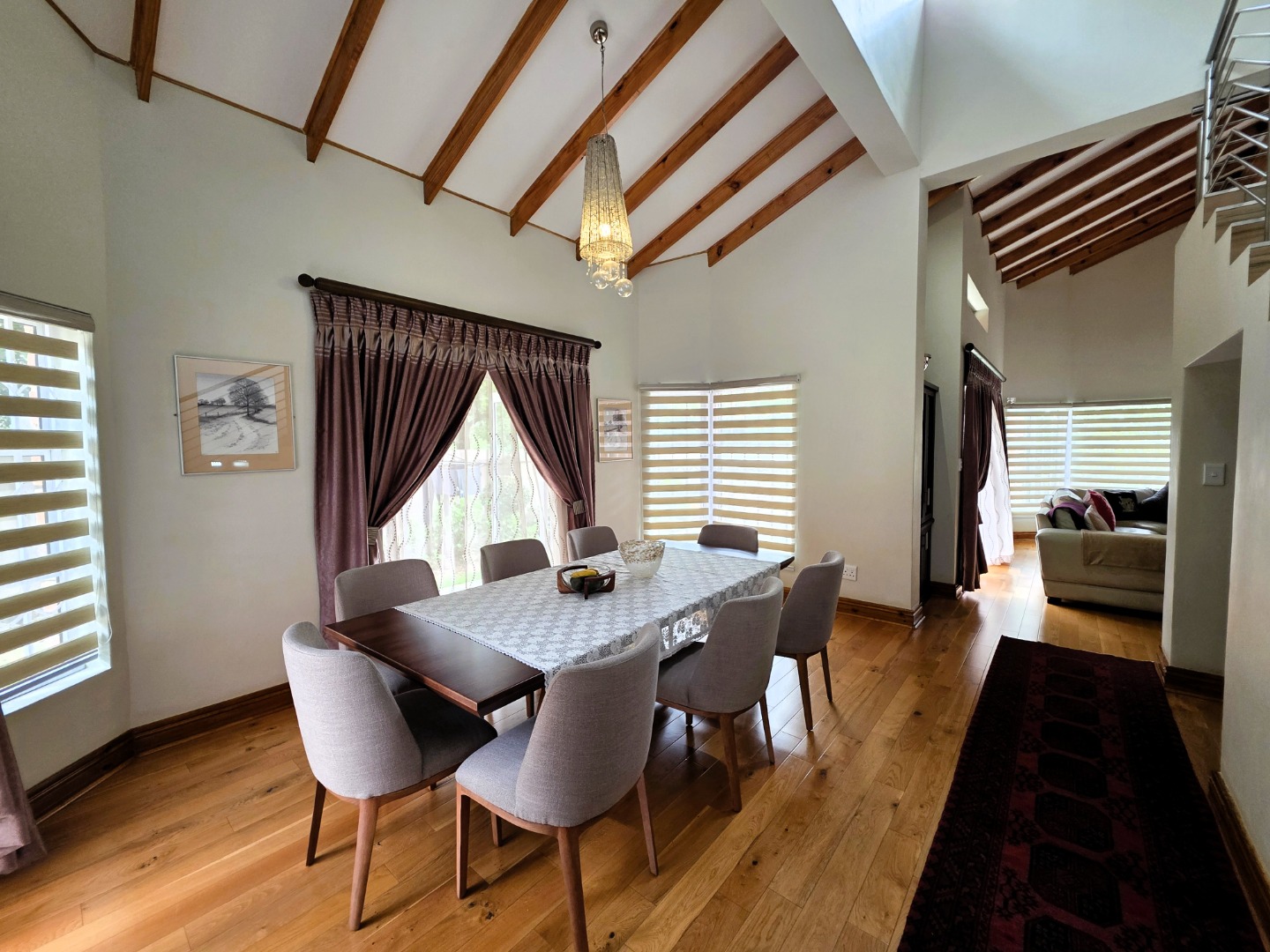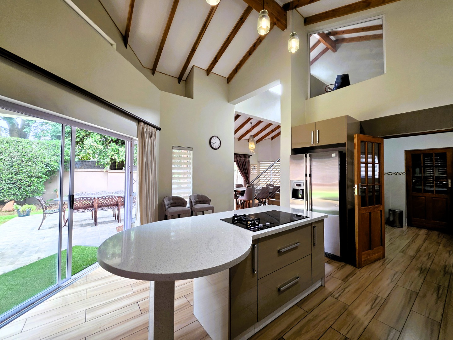 The Ground Floor of the home has a semi open plan design featuring your kitchen with a scullery, dining room area, formal lounge with a gas fireplace and a casual lounge. The feel throughout the home is a wood finish with exposed wooden beams in the ceiling and wooden flooring throughout. The Ground Floor of the home also features two En-Suite Bedrooms.