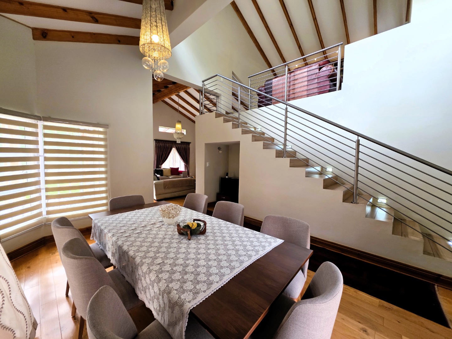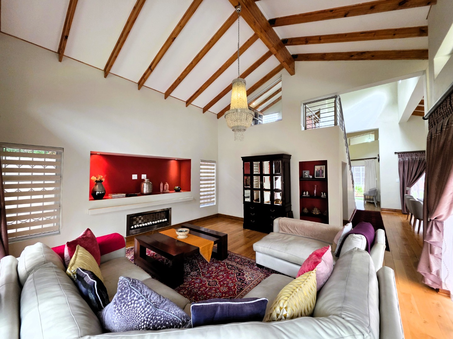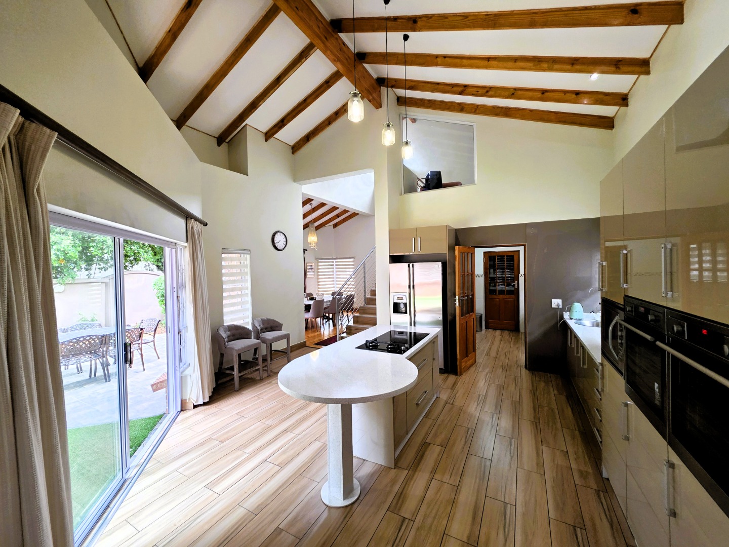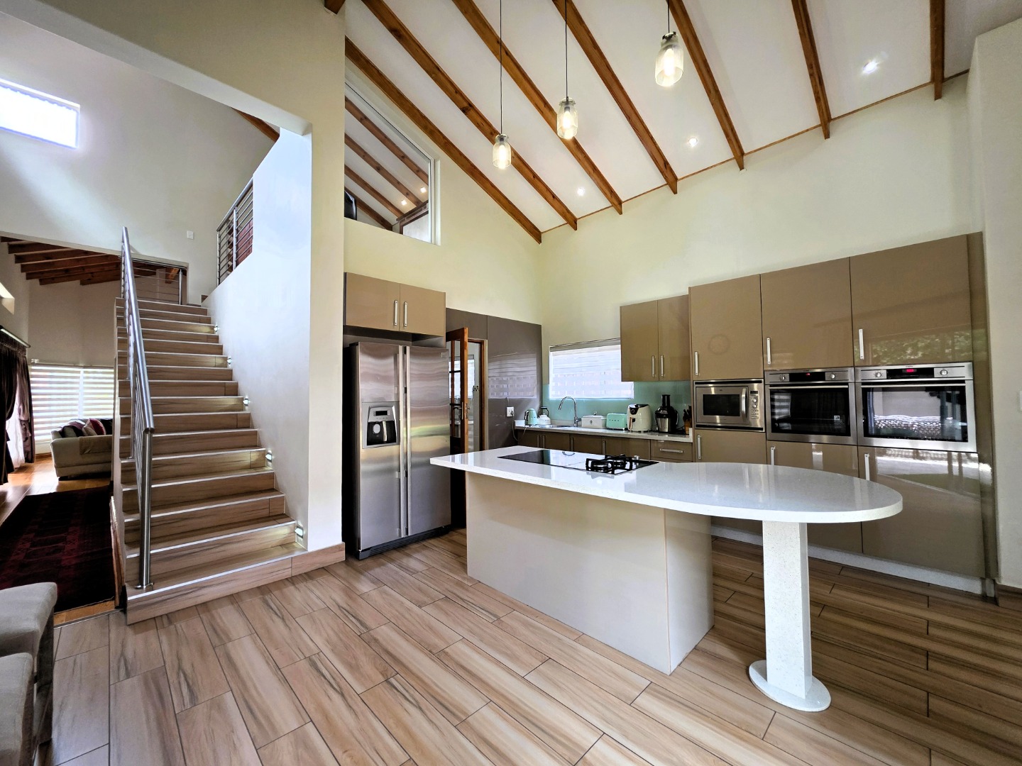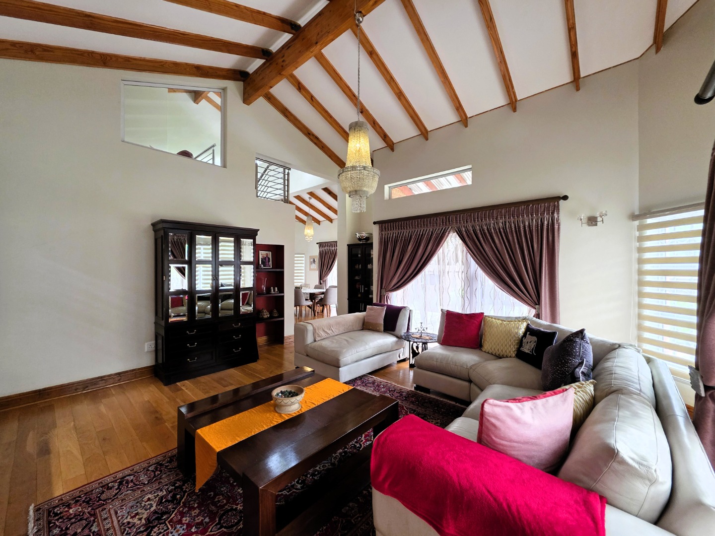 The Ground Floor of the home has a semi open plan design featuring your kitchen with a scullery, dining room area, formal lounge with a gas fireplace and a casual lounge. The feel throughout the home is a wood finish with exposed wooden beams in the ceiling and wooden flooring throughout. The Ground Floor of the home also features two En-Suite Bedrooms.