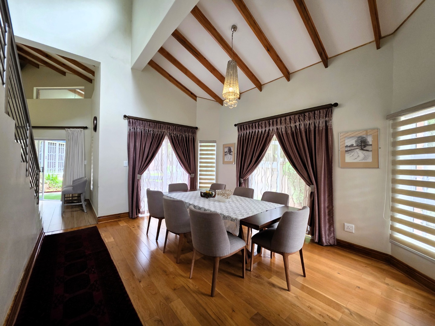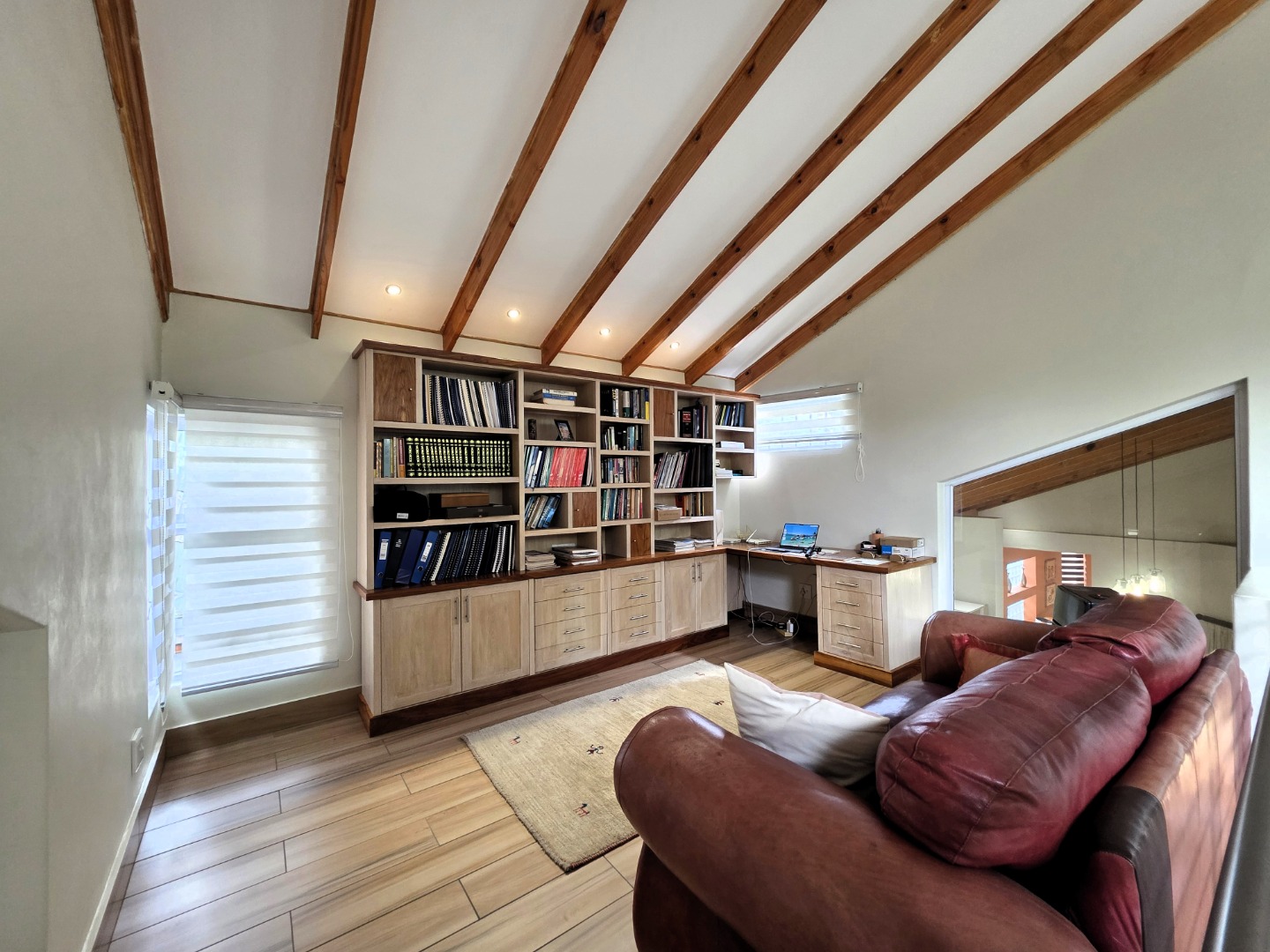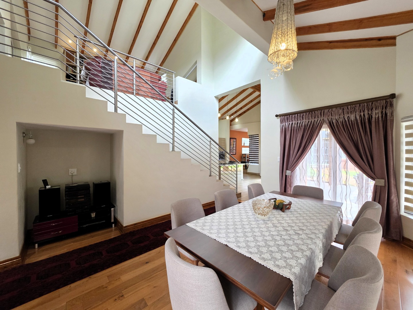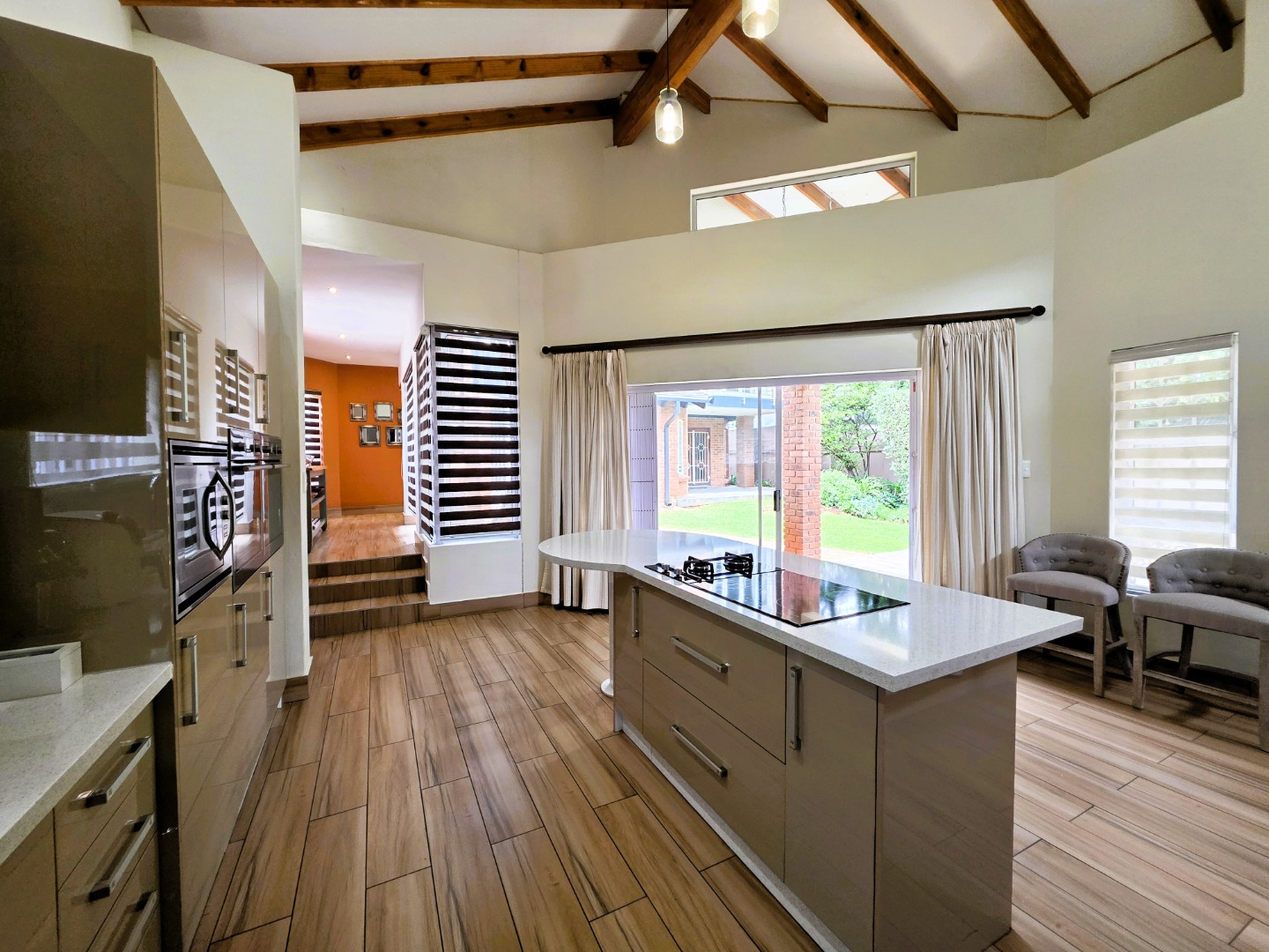 The Ground Floor of the home has a semi open plan design featuring your kitchen with a scullery, dining room area, formal lounge with a gas fireplace and a casual lounge. The feel throughout the home is a wood finish with exposed wooden beams in the ceiling and wooden flooring throughout. The Ground Floor of the home also features two En-Suite Bedrooms.