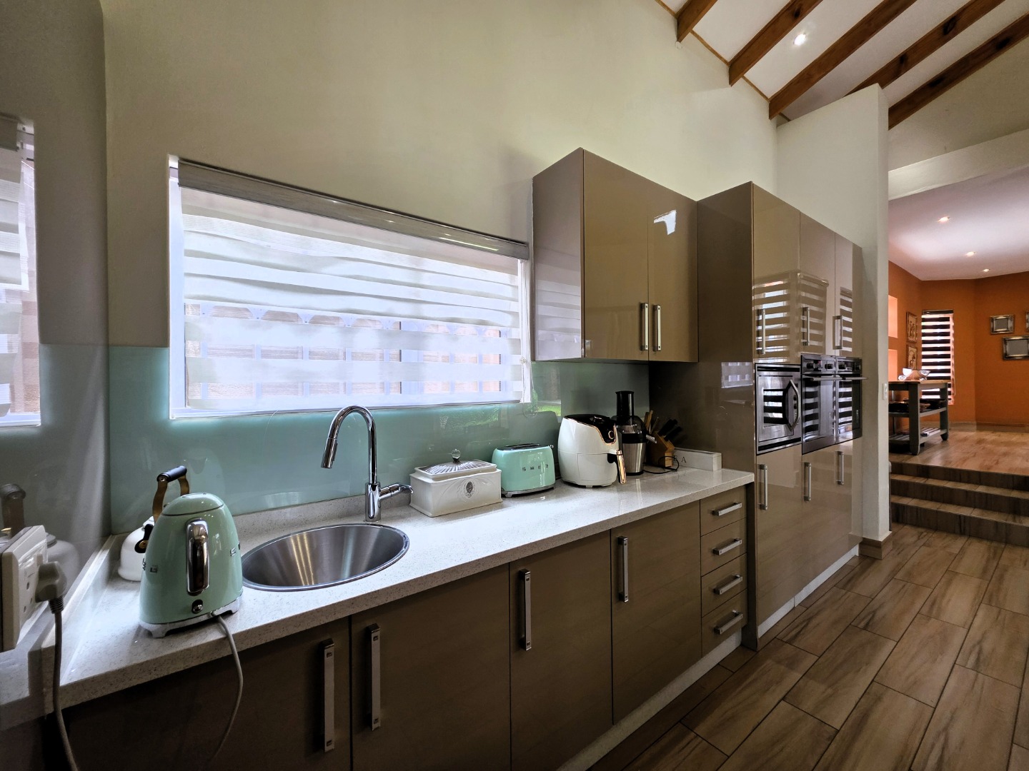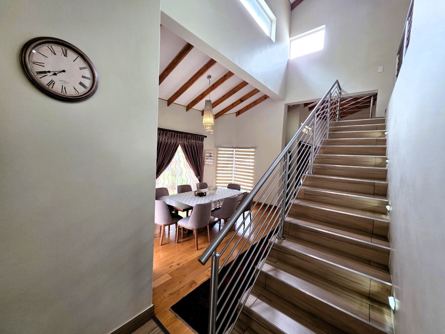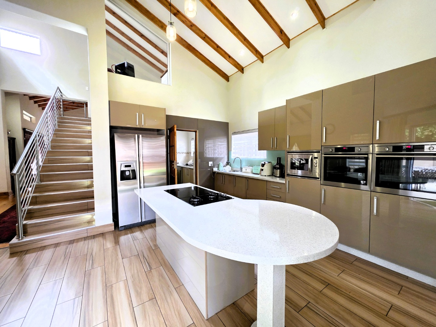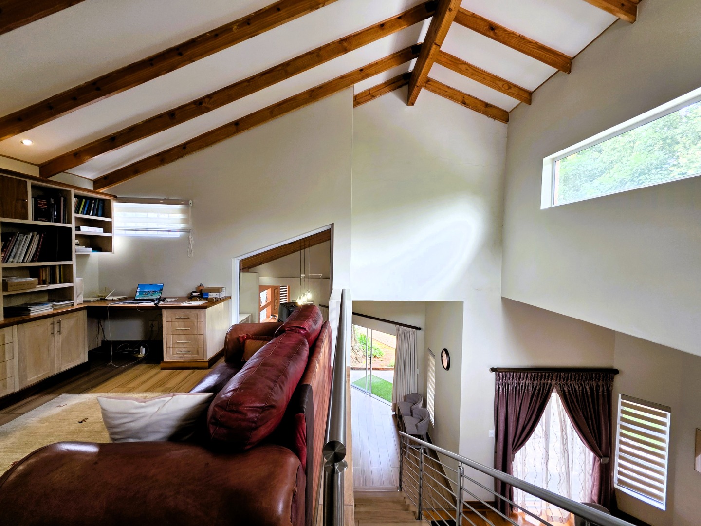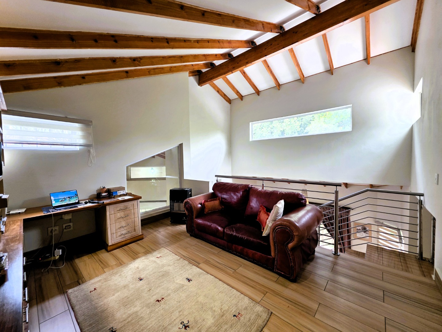 The Ground Floor of the home has a semi open plan design featuring your kitchen with a scullery, dining room area, formal lounge with a gas fireplace and a casual lounge. The feel throughout the home is a wood finish with exposed wooden beams in the ceiling and wooden flooring throughout. The Ground Floor of the home also features two En-Suite Bedrooms.