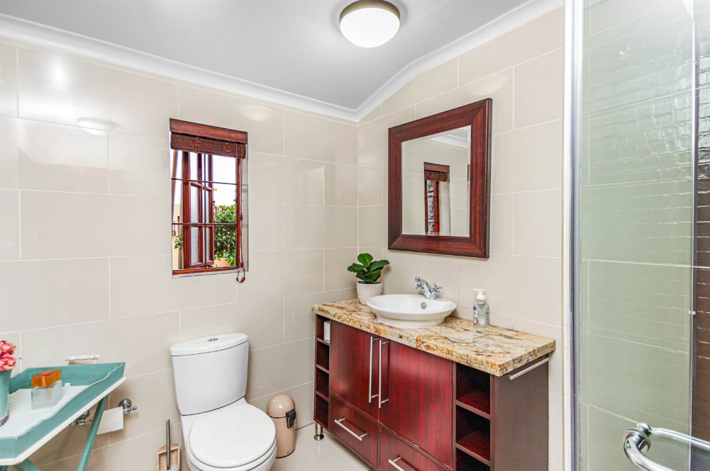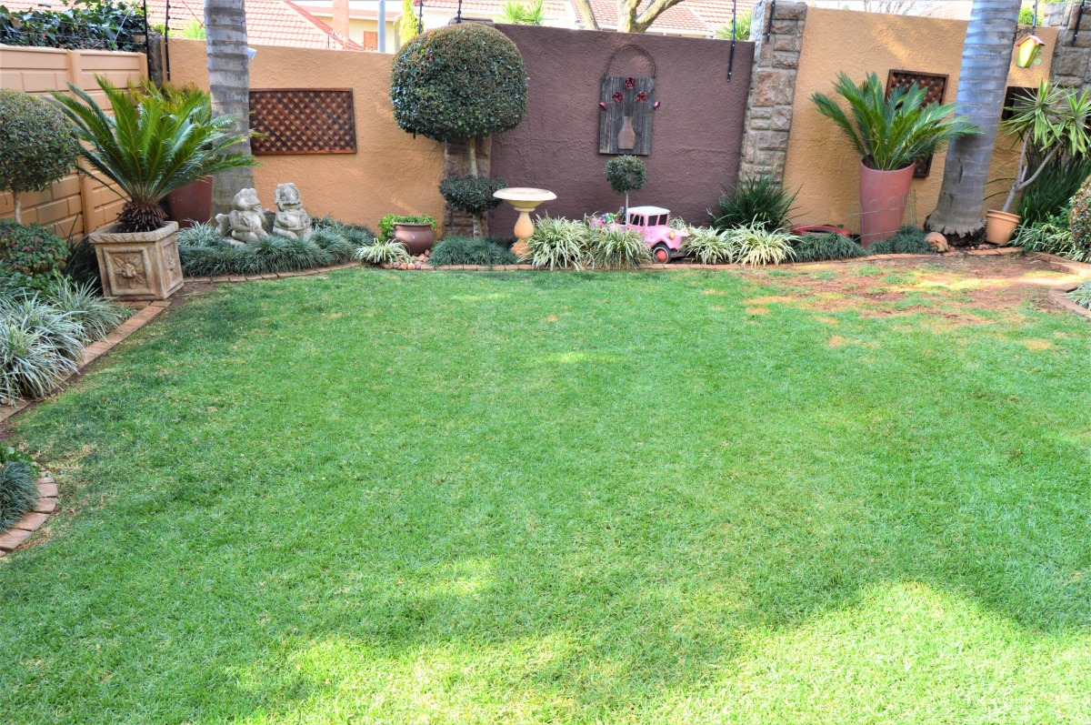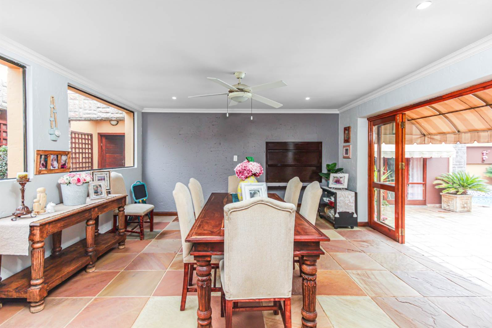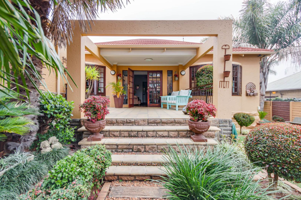 The backyard is designed for lifestyle living, offering a covered seating and braai area with a skylight, all overlooking a sparkling swimming pool perfect for relaxed weekends and hosting guests.