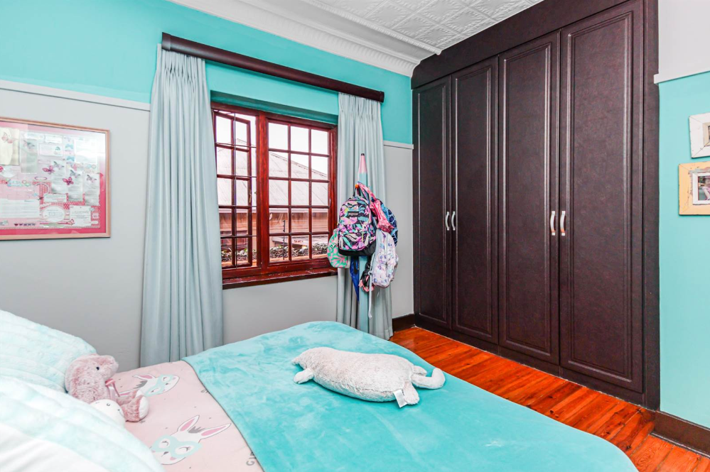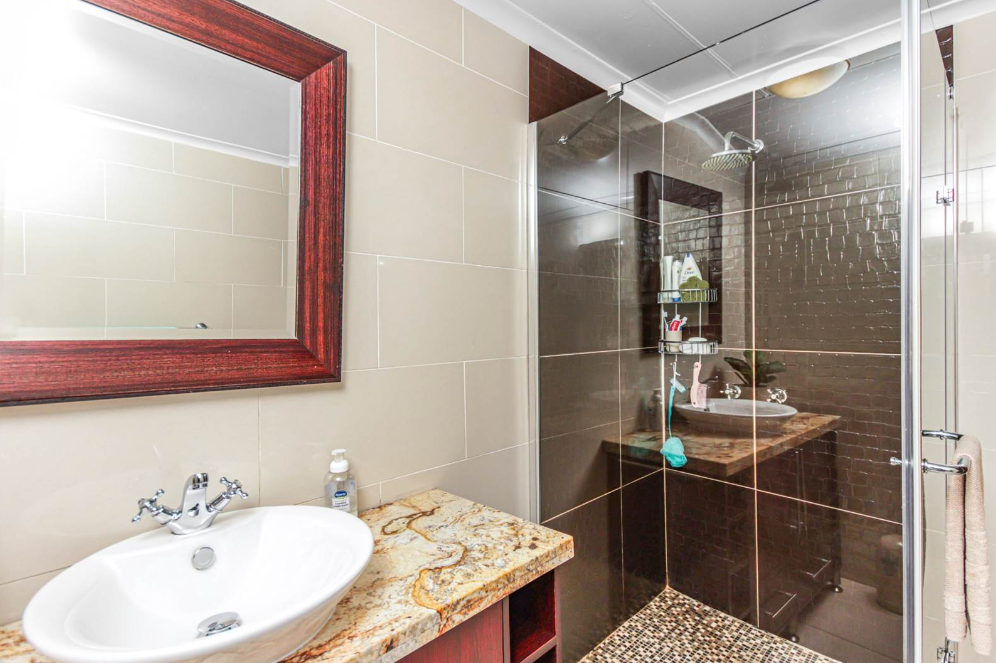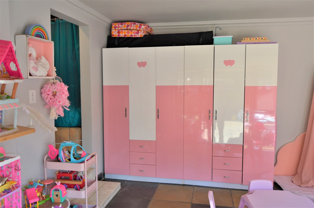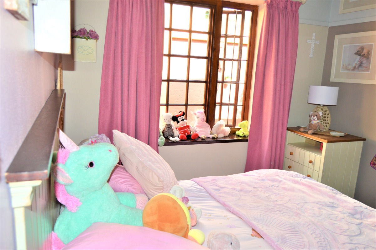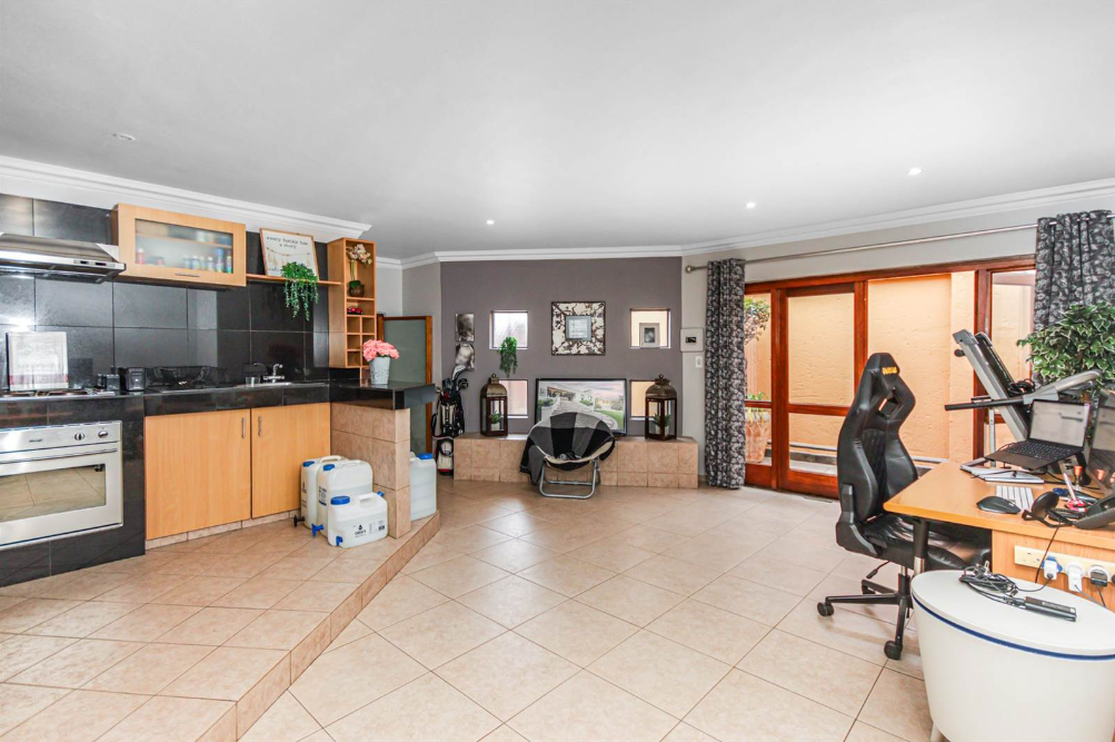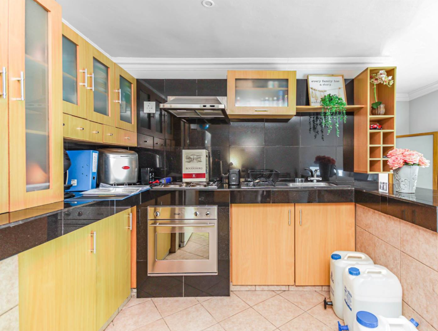 At the heart of the home lies a spacious kitchen, fitted with solid oak cupboards, granite countertops, an eye-level oven, and a breakfast bar perfect for casual dining. There is space for a double-door fridge, along with a separate scullery and an additional laundry room, ensuring functionality meets convenience.